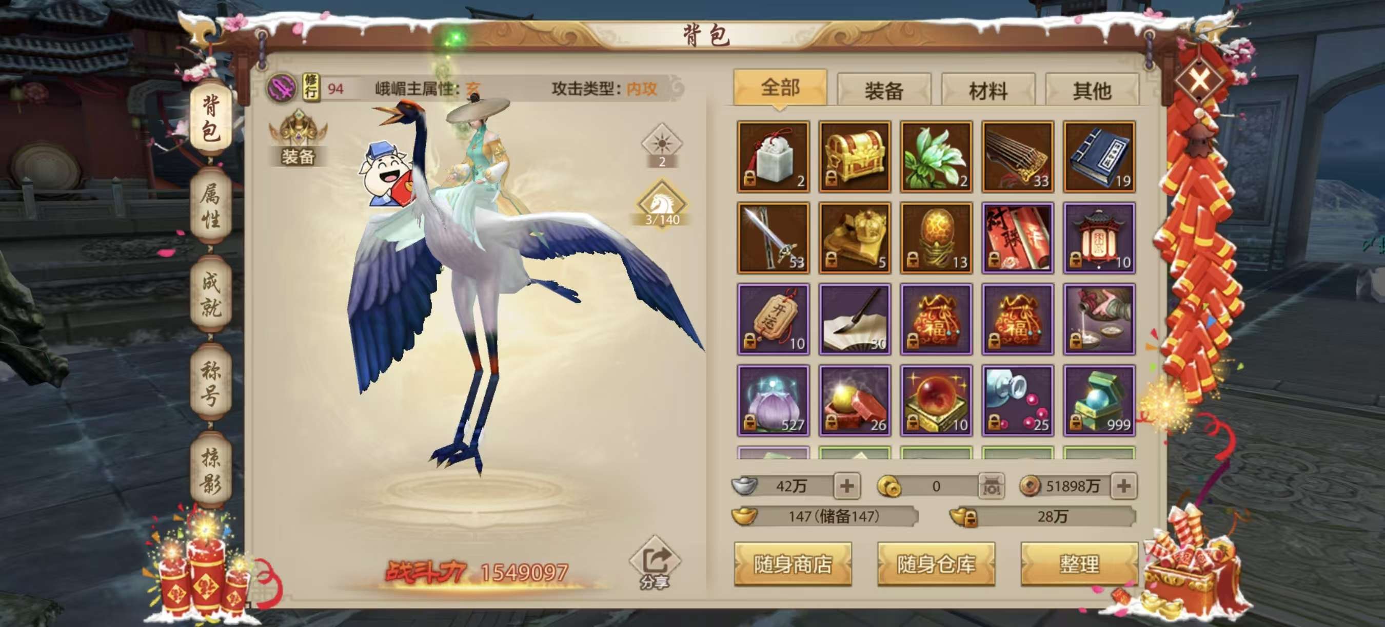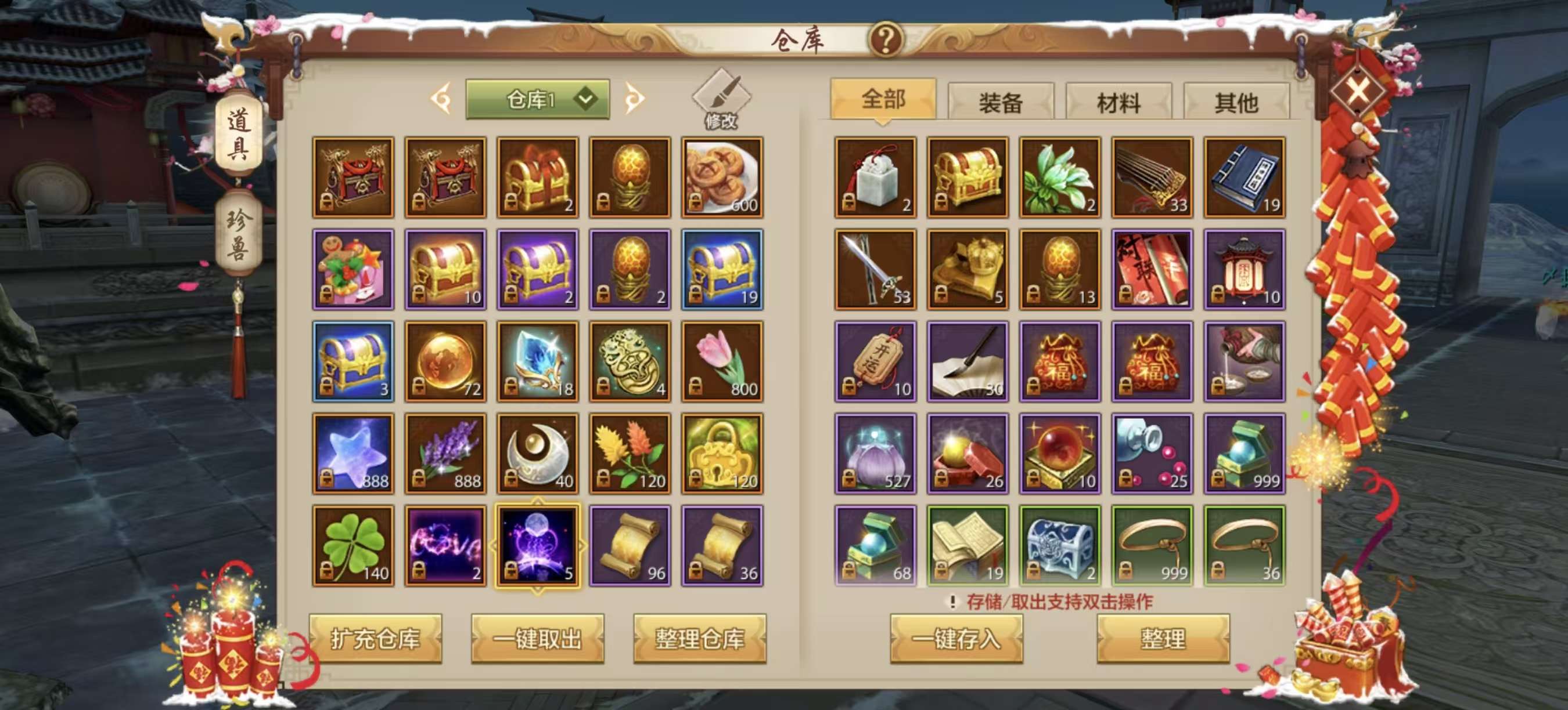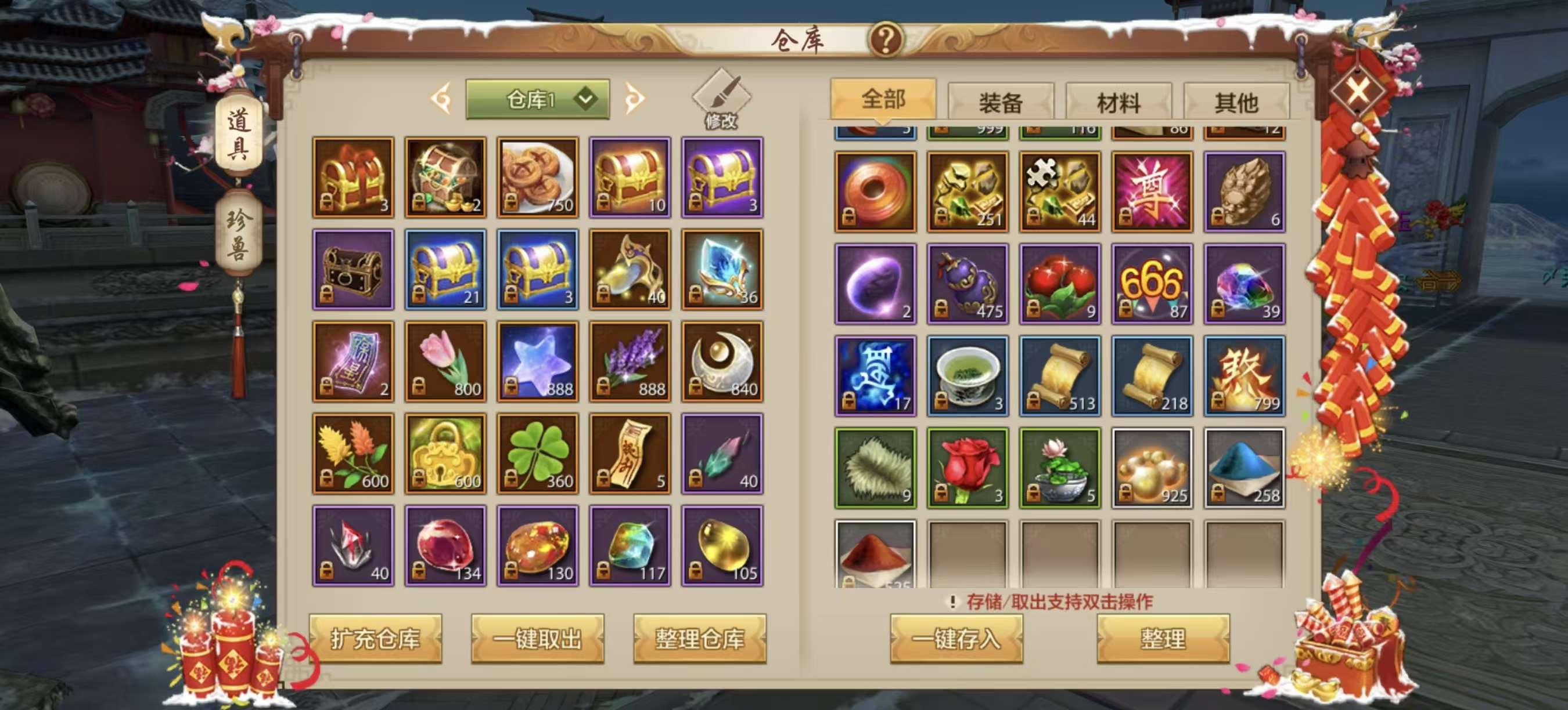 有几只涅槃材料宠物,绑定元宝接近120万,还有情人节花榜烟花,其他材料多多