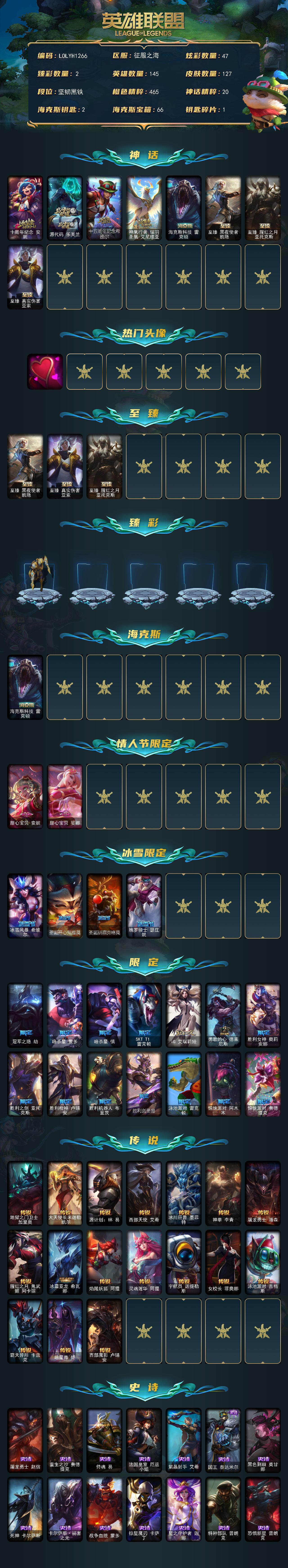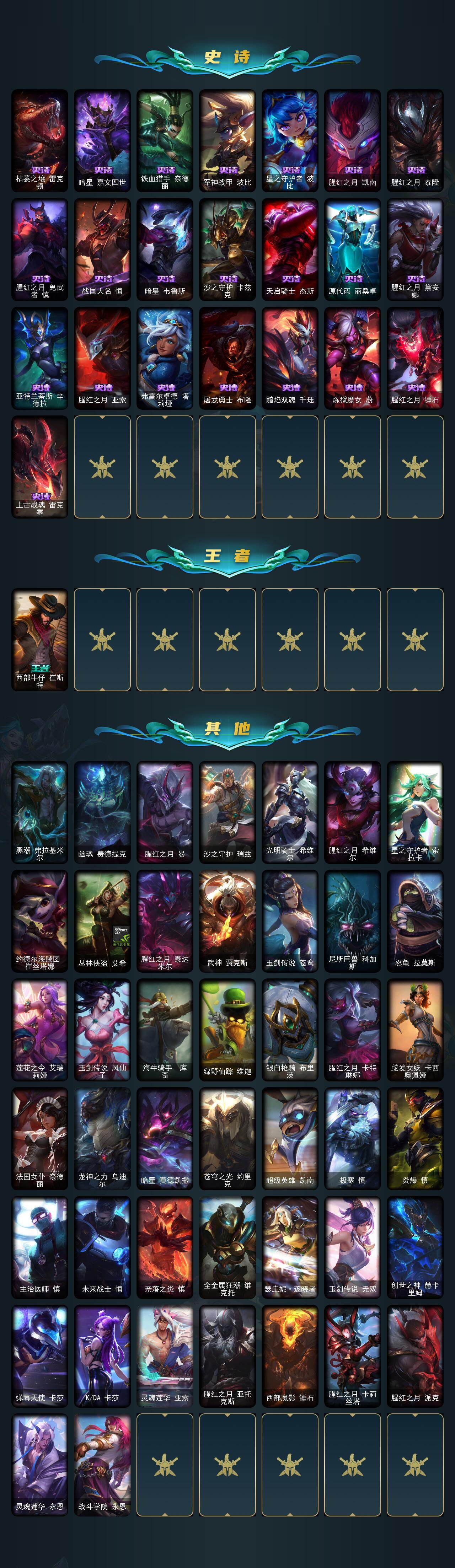 145英雄/127皮肤/8神话/20限定/2臻彩/47炫彩/17传说/36史诗/未定级/十周年纪念安妮/源代码乐芙兰/