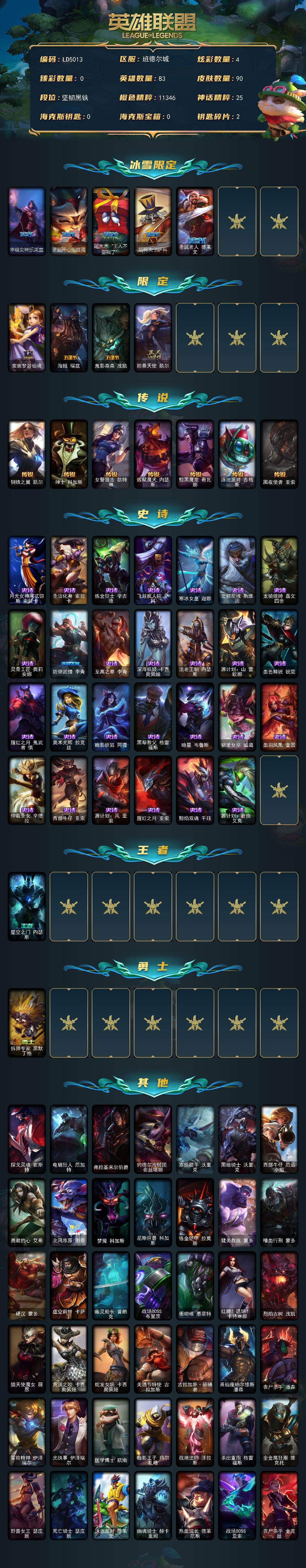 【LD5013】83英雄/90皮肤/9限定/4炫彩/7传说/27史诗/未定级账号等级:58/幸福女神乐芙兰/圣诞开心鬼提莫/阿木木“主人不要我了”/胡桃夹子萨科/圣诞老人德莱文/安妮梦游仙境/海贼瑞兹/鬼影森森茂凯/防暴天使凯尔/钢铁之翼凯尔/绅士科加斯/女警狙击凯特琳/炼狱魔犬内瑟斯/黯黑魔龙希瓦娜/泳池派对吉格斯/黑夜使者亚索/月光女神阿忒弥斯索拉卡/圣洁化身索拉卡/炼金狂士辛吉德/飞越疯人院萨科/寒冰女皇迦娜/北领前线斯维因/龙骑统帅嘉文四世/灵骨工匠奥莉安娜/防弹武僧李青/至高之拳李青/