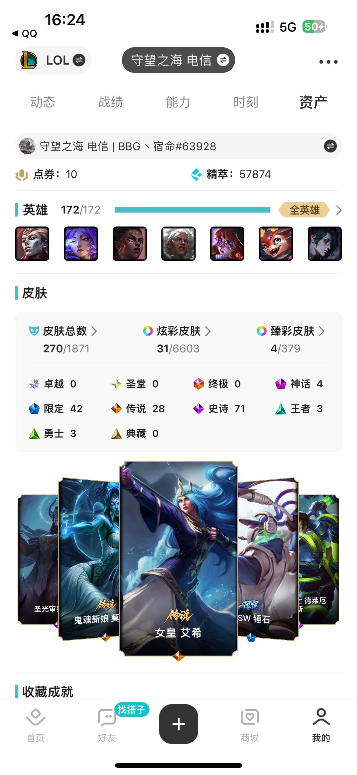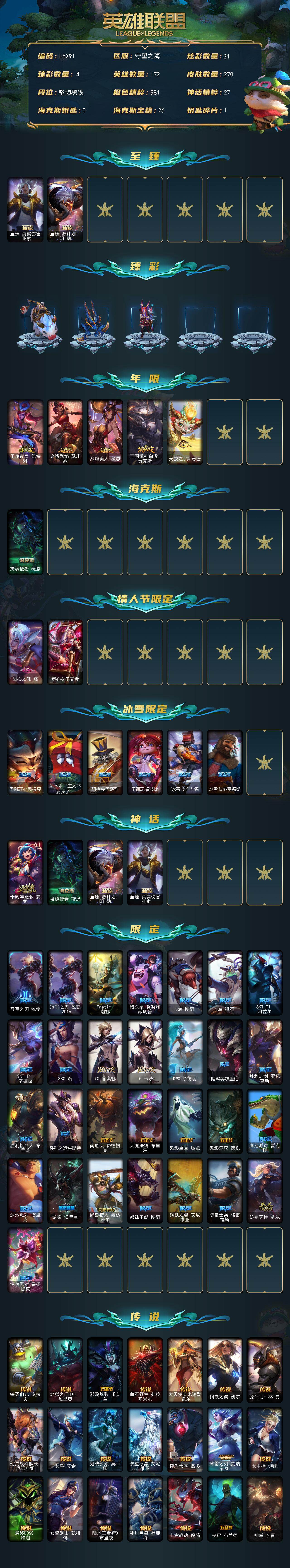 【特价出售/店主推荐】未定级段位-172英雄-270皮肤-31炫彩-0终极-4神话-42限定-28传说-71史诗