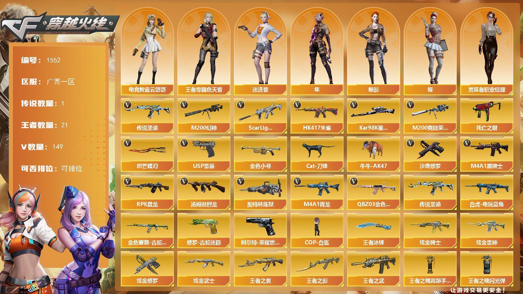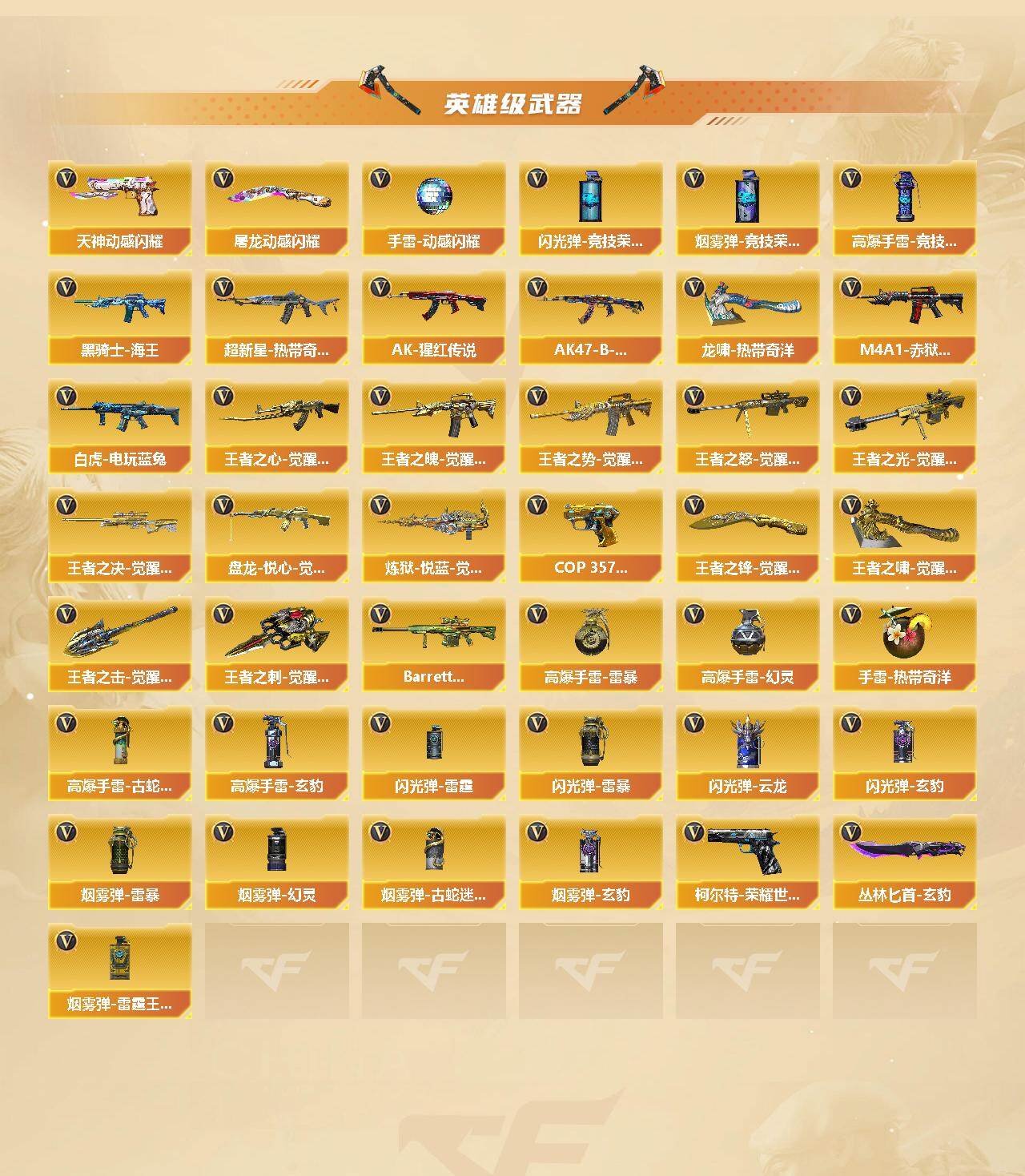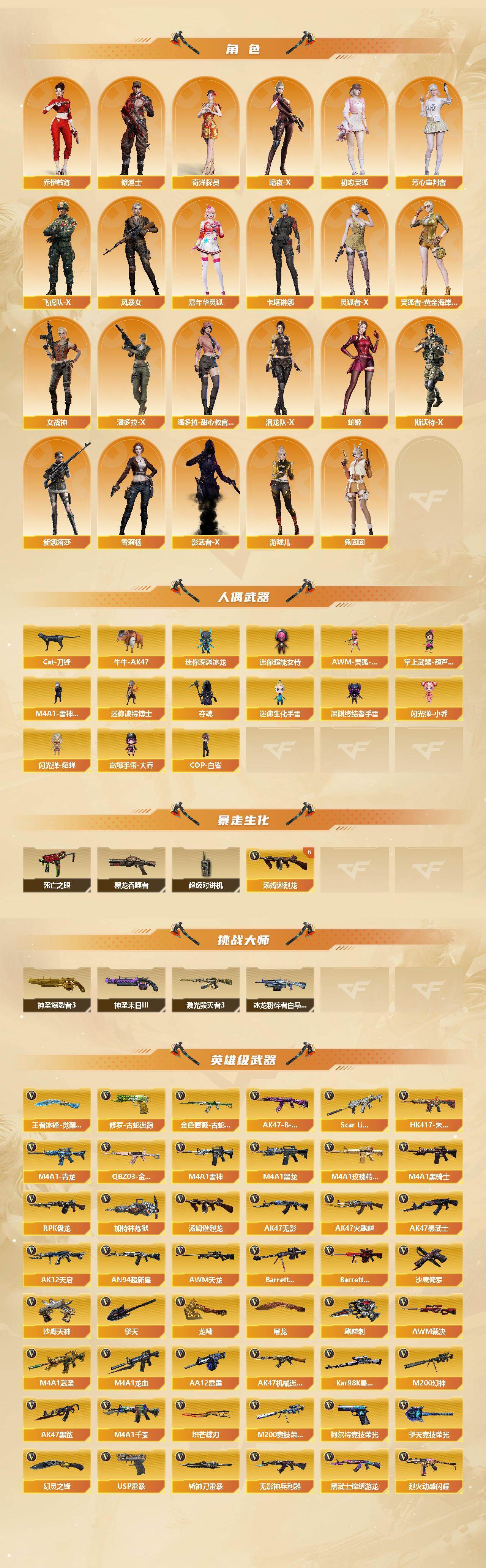 【热门武器】:传说圣谕,QBZ03-金色蔷薇,Scar Light-白虎,HK417-朱雀,M4A1-青龙,M200-幻神,柯尔特-荣耀世冠白鲨2023,金色蔷薇-古蛇迷踪,修罗-古蛇迷踪,M200-竞技荣光*2,死亡之眼,白虎-电玩蓝兔,Kar98K-星神,金色小号,Cat-刀锋,牛牛-AK47,M4A1-黑骑士*3,汤