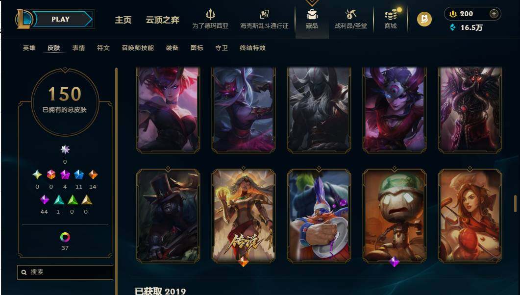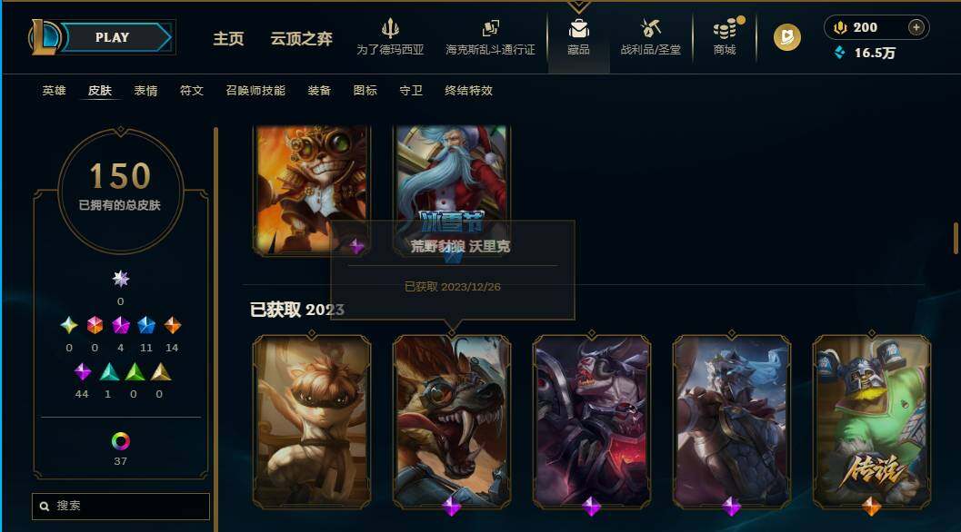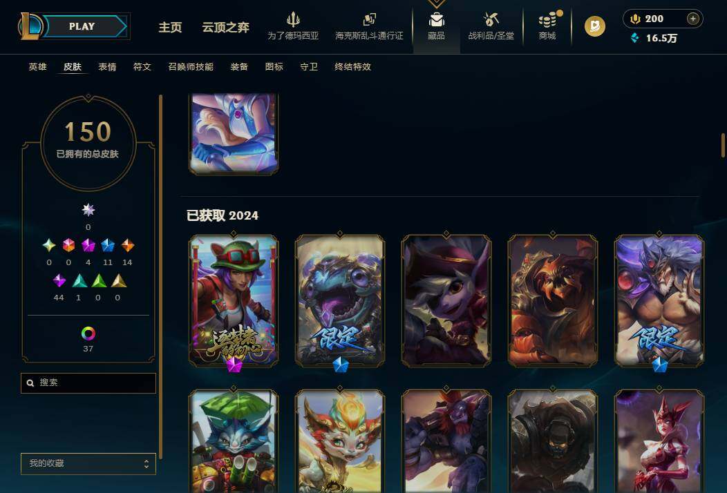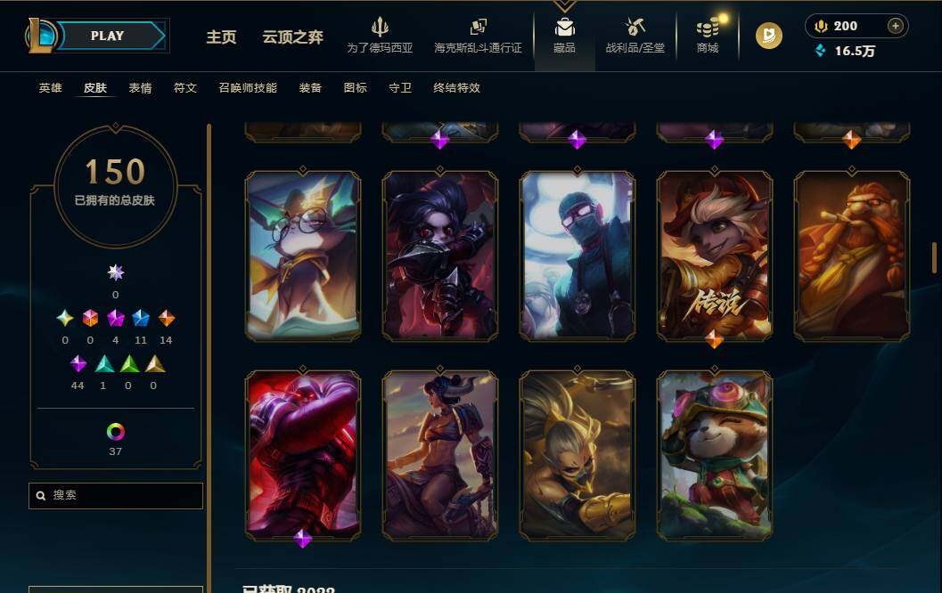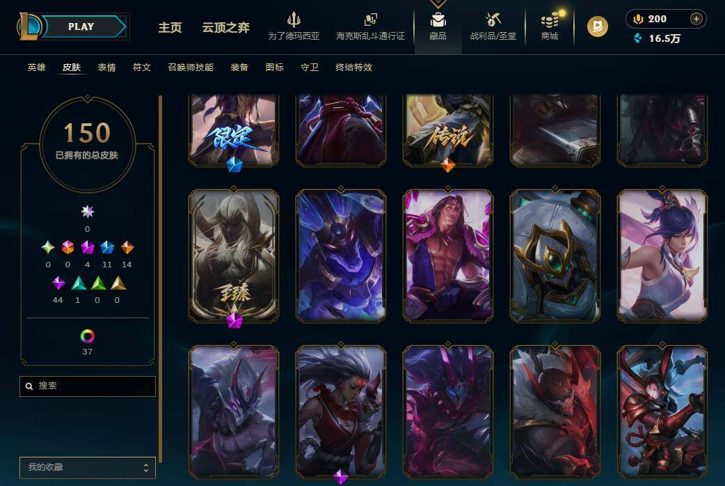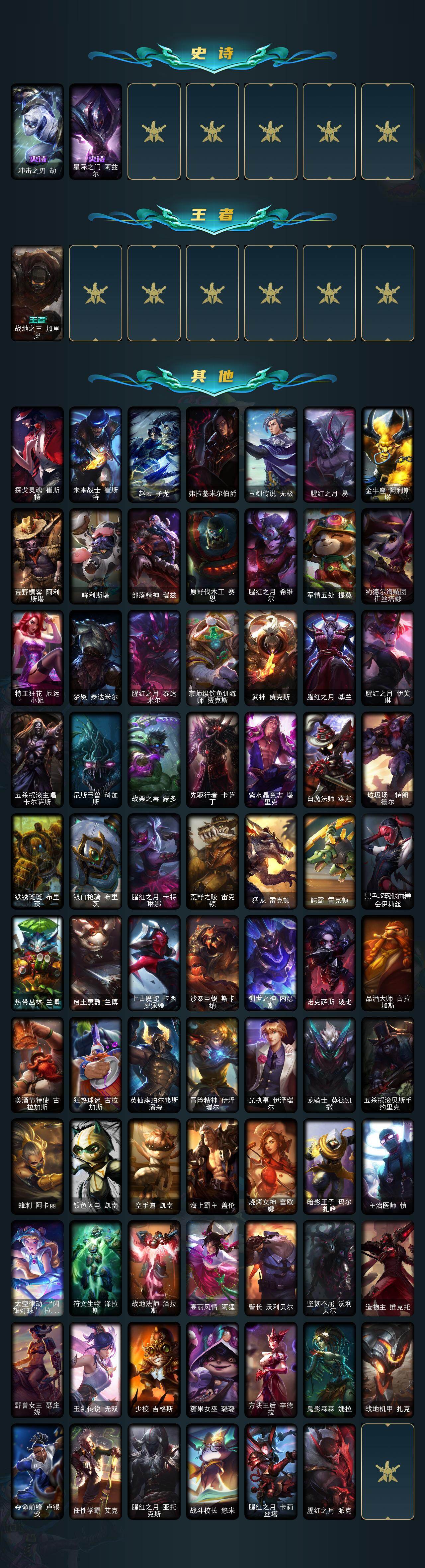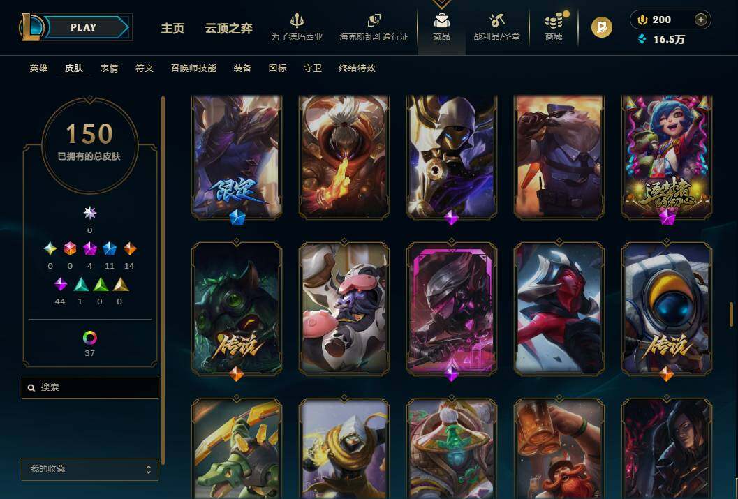 172英雄/150皮肤/4神话/11限定/1臻彩/43炫彩/14传说/44史诗/未定级/