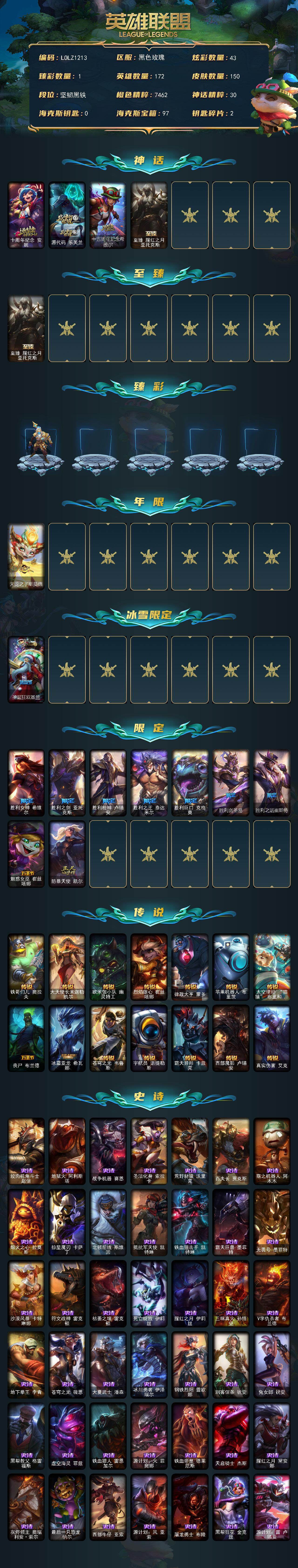 【LOLZ1213】172英雄/150皮肤/4神话/11限定/1臻彩/43炫彩/14传说/44史诗/未定级/十周年纪念安妮/源代码乐芙兰/十五周年纪念希维尔/至臻腥红之月亚托克斯/冠军之志瑞兹凯旋圣装/天龙之子斯莫德/圣诞狂欢基兰/胜利女神希维尔/胜利之剑亚托克斯/胜利枪神卢锡安/胜利之王泰达米尔/胜利巨口克格莫/胜利剑圣易/胜利之运崔斯特/魅惑女巫崔丝塔娜/防暴天使凯尔/铁哥们儿奥拉夫/大天使长米迦勒凯尔/欧米伽小队幽灵特工/烈焰雄心崔丝塔娜/律政大亨蒙多/苹果机器人布里茨/太空律动猫猫布里和