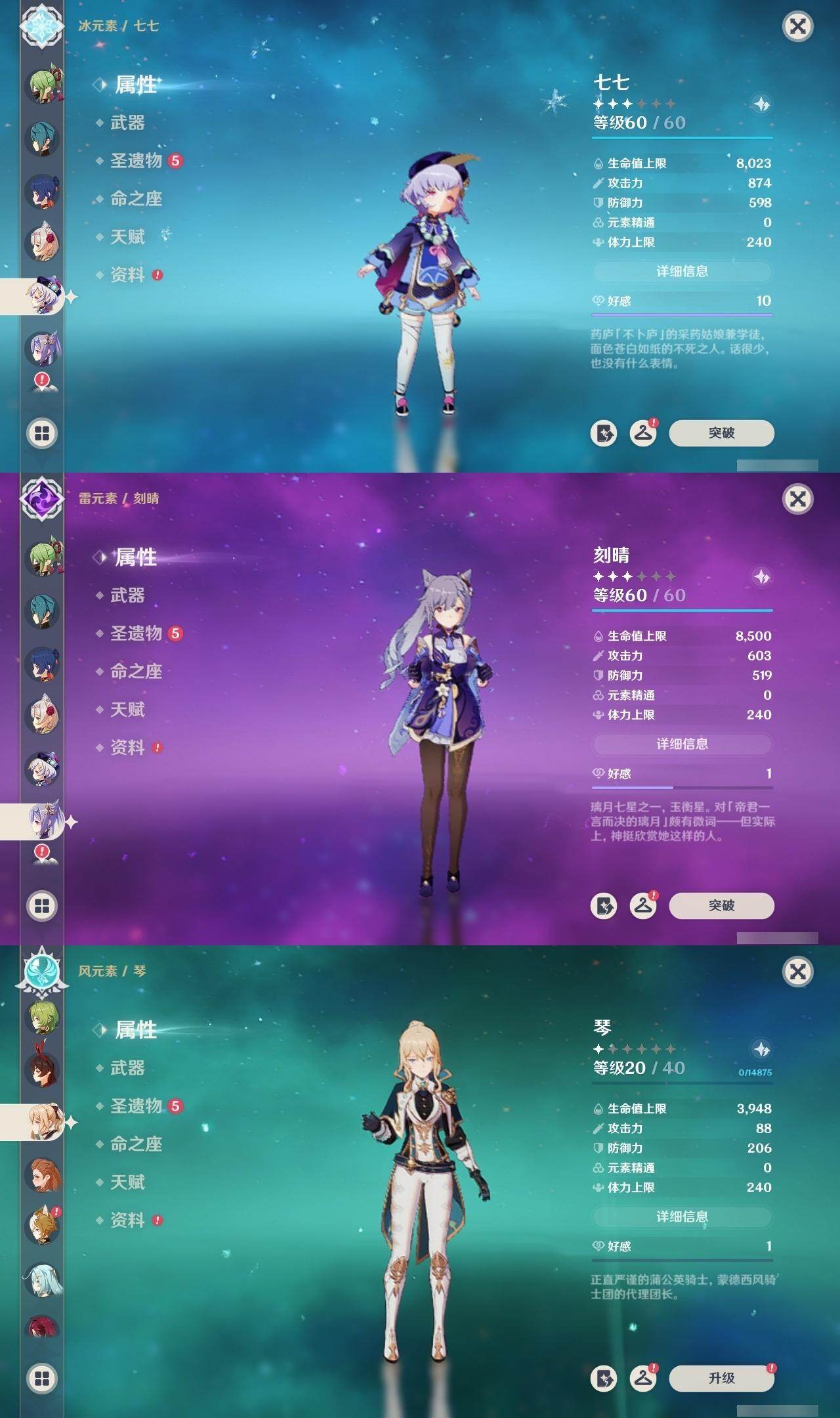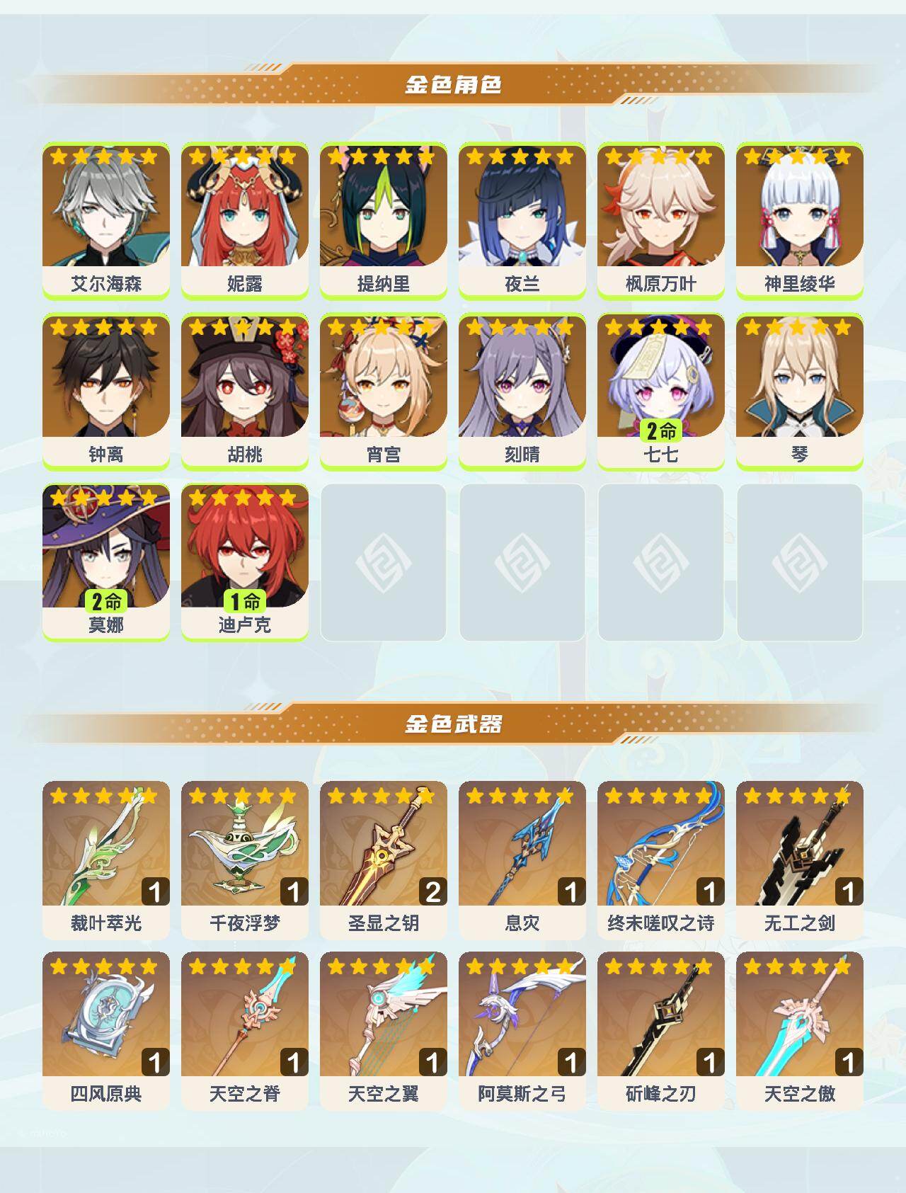0命艾尔海森,0命妮露,0命提纳里,0命夜兰,0命枫原万叶,0命神里绫华,0命钟离,0命胡桃,0命宵宫,0命刻晴,2命七七,0命琴,2命莫娜,1命迪卢克,精1裁叶萃光,精1千夜浮梦,精2圣显之钥,精1息灾,精1终末嗟叹之诗,精1无工之剑,精1四风原典,精1天空之脊,精1天空之翼,精1阿莫斯之弓,精1斫峰之刃,精1天空之傲