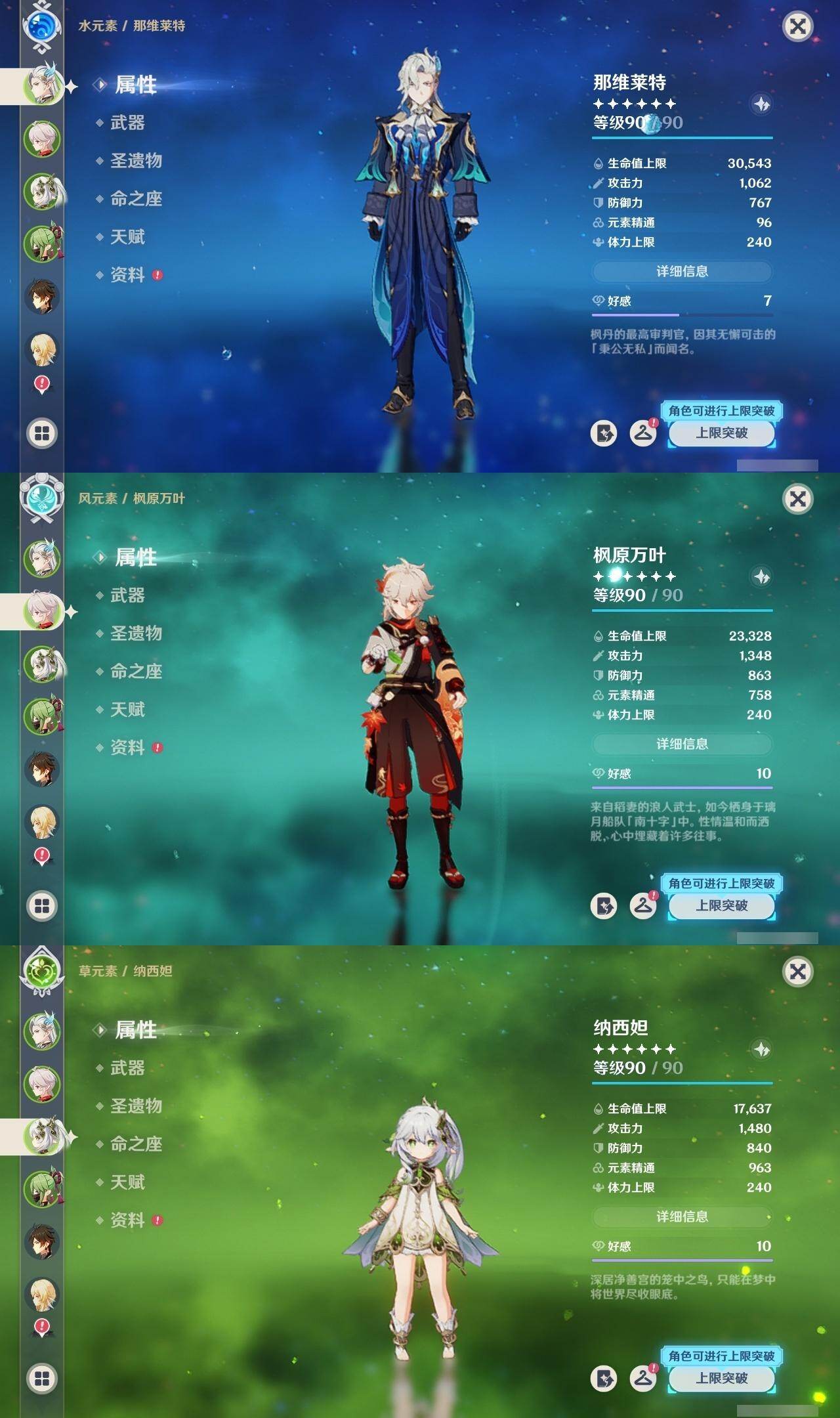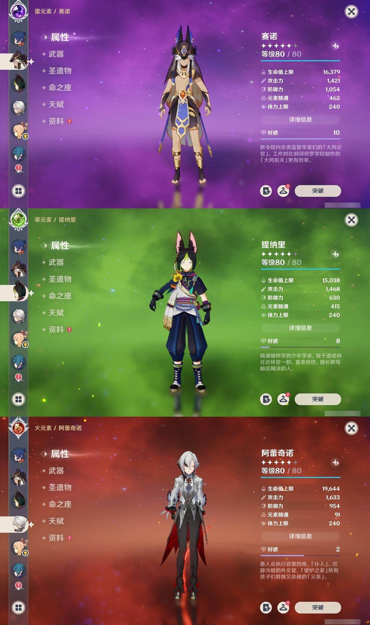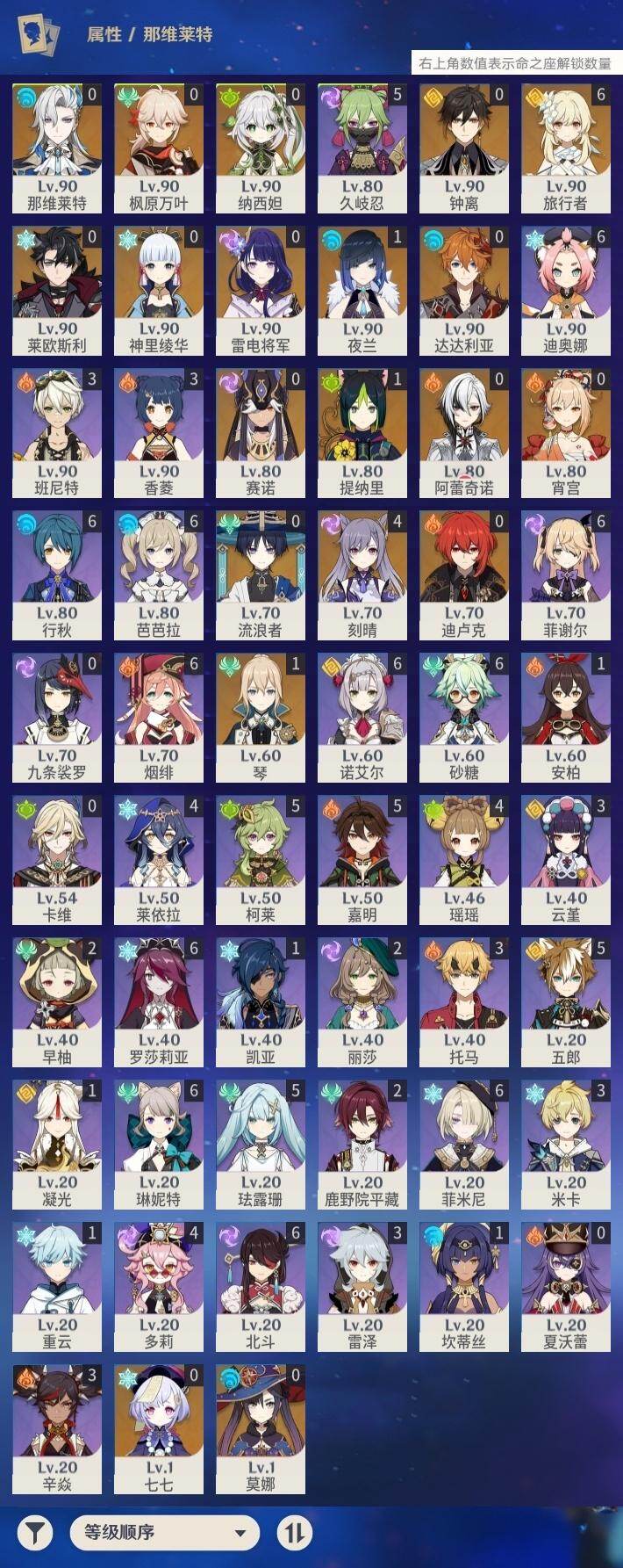 0命阿蕾奇诺,0命莱欧斯利,0命那维莱特,0命流浪者,0命纳西妲,0命赛诺,1命提纳里,1命夜兰,0命雷电将军,0命枫原万叶,0命神里绫华,0命钟离,0命宵宫,0命达达利亚,4命刻晴,0命七七,1命琴,0命莫娜,0命迪卢克,精1四风原典,精1和璞鸢