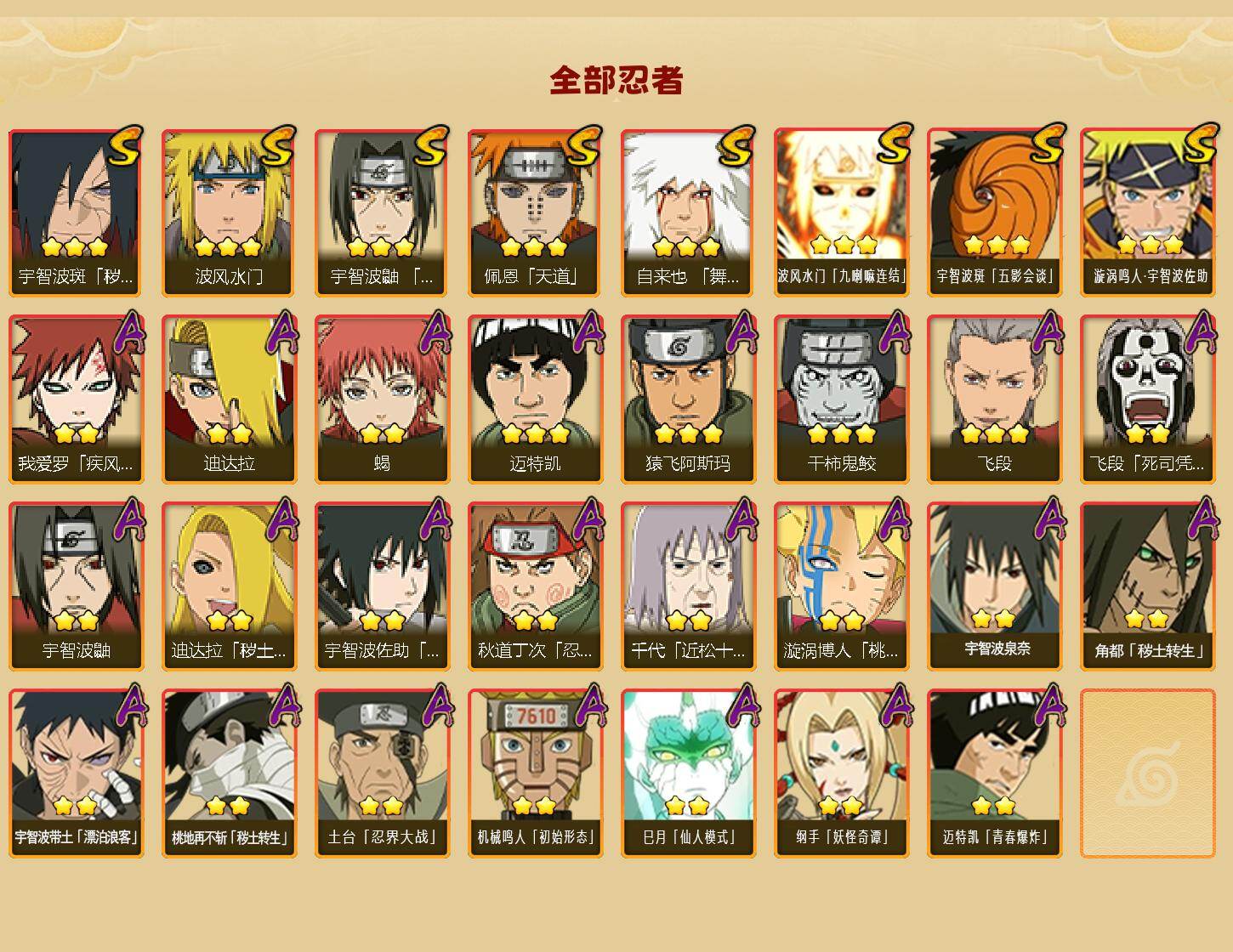【A级忍者】:迪达拉(2星),迪达拉「秽土转生」(2星),飞段(3星),飞段「死司凭血」(2星),干柿鬼鲛(3星),漩涡博人「桃式显现」(2星),机械鸣人「