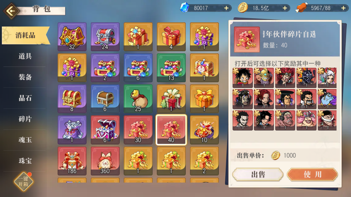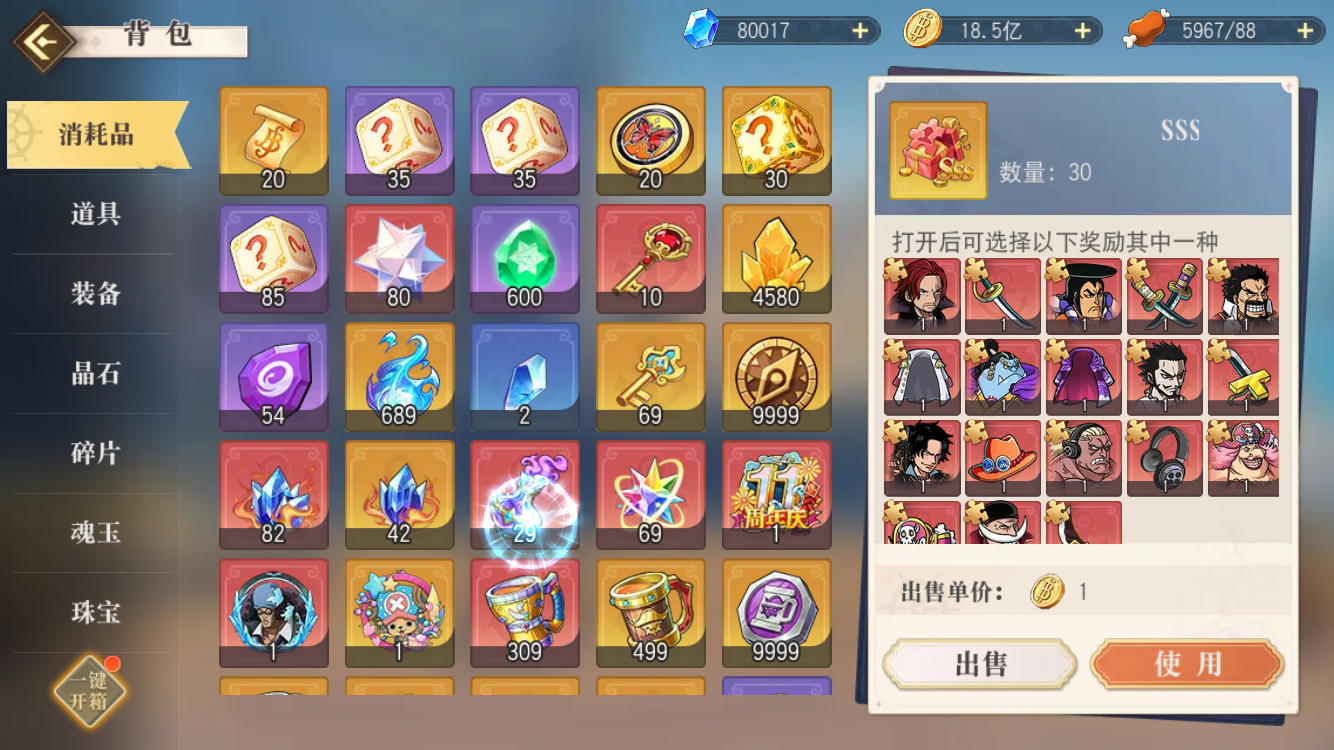 官方普通账号 未绑定 未充值 未用礼包 没看错6UR角色外带400多碎片哦随便觉醒 外带现成18SSS NSP NSS角色 带自选多SSS伙伴 外带2千5多各色朗姆酒 等各种资源 详情请看截图H26