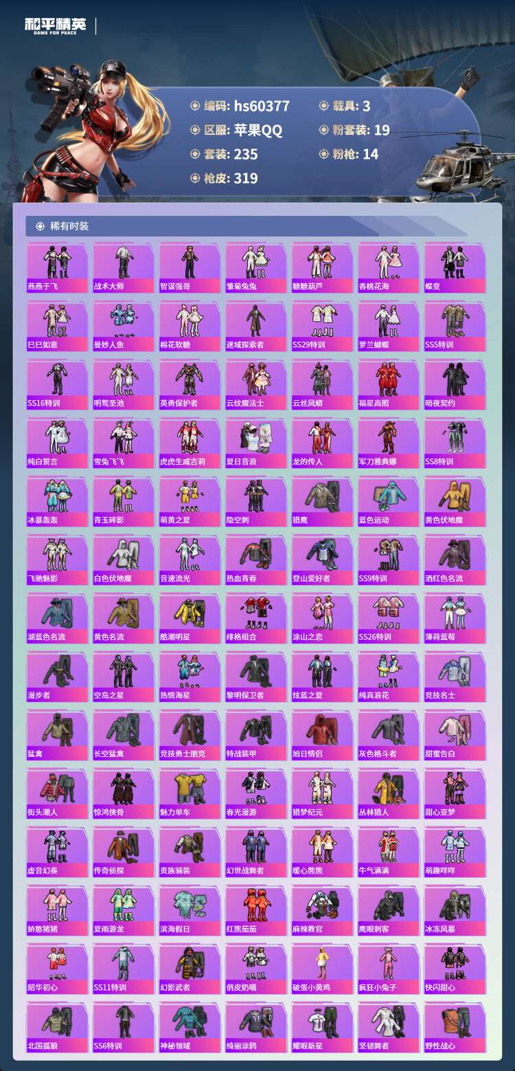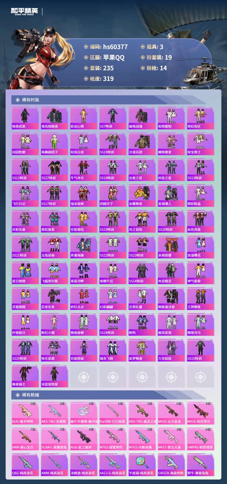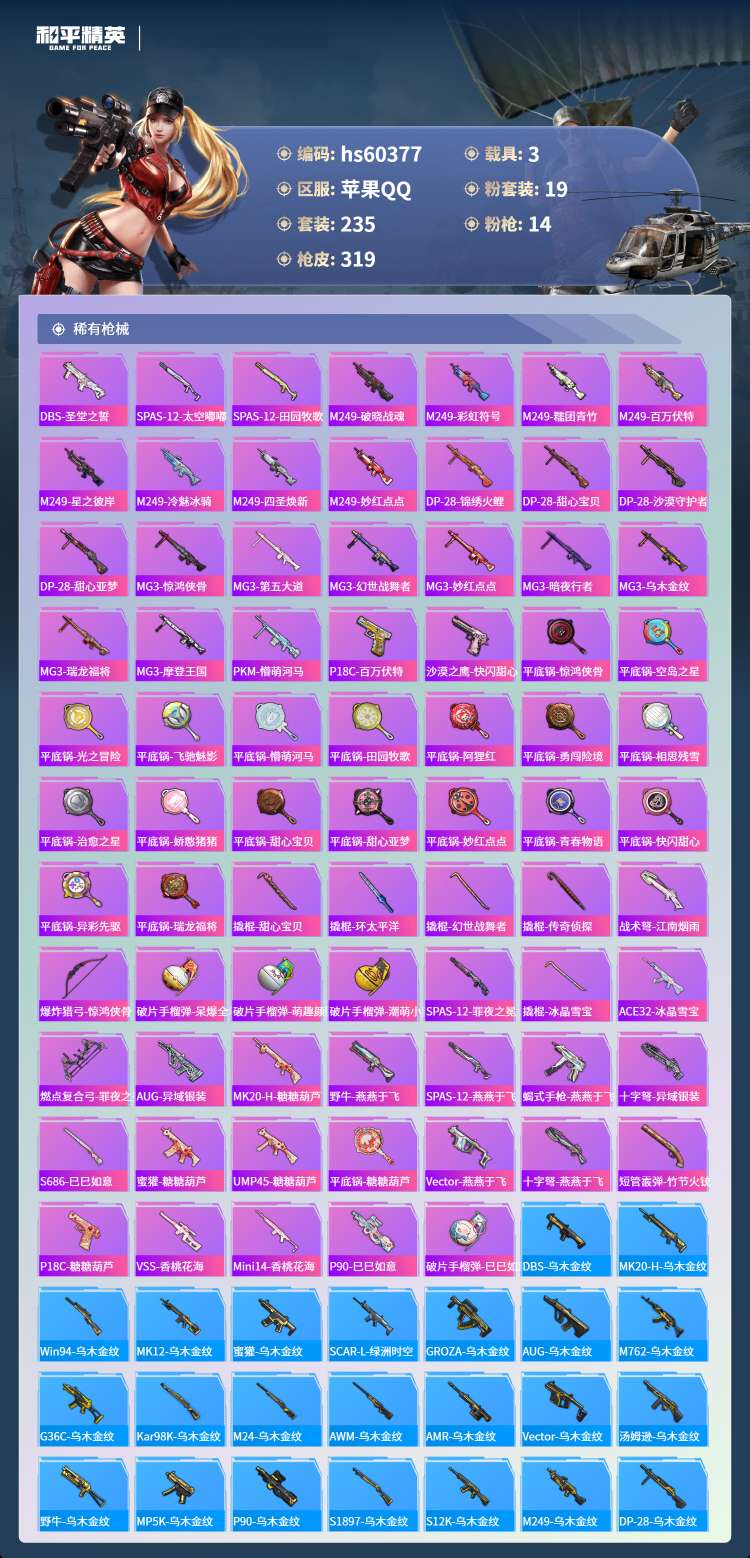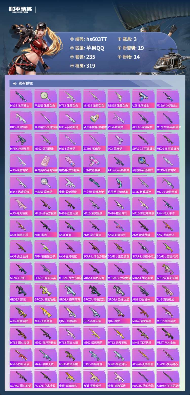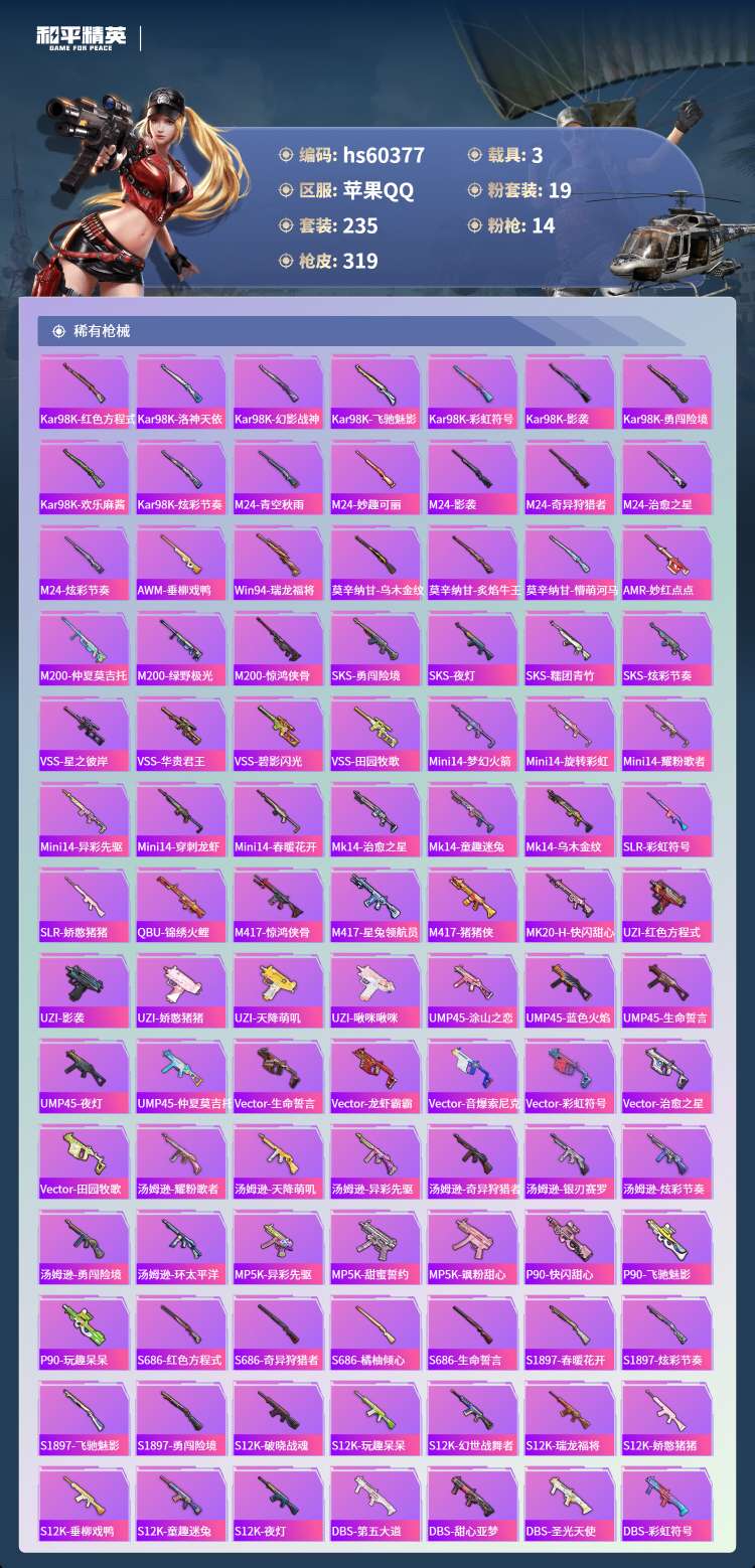 hs60377 苹果手Q-20王牌印记-有战神框-19粉装-14特效枪-3载具-112349热力值-
