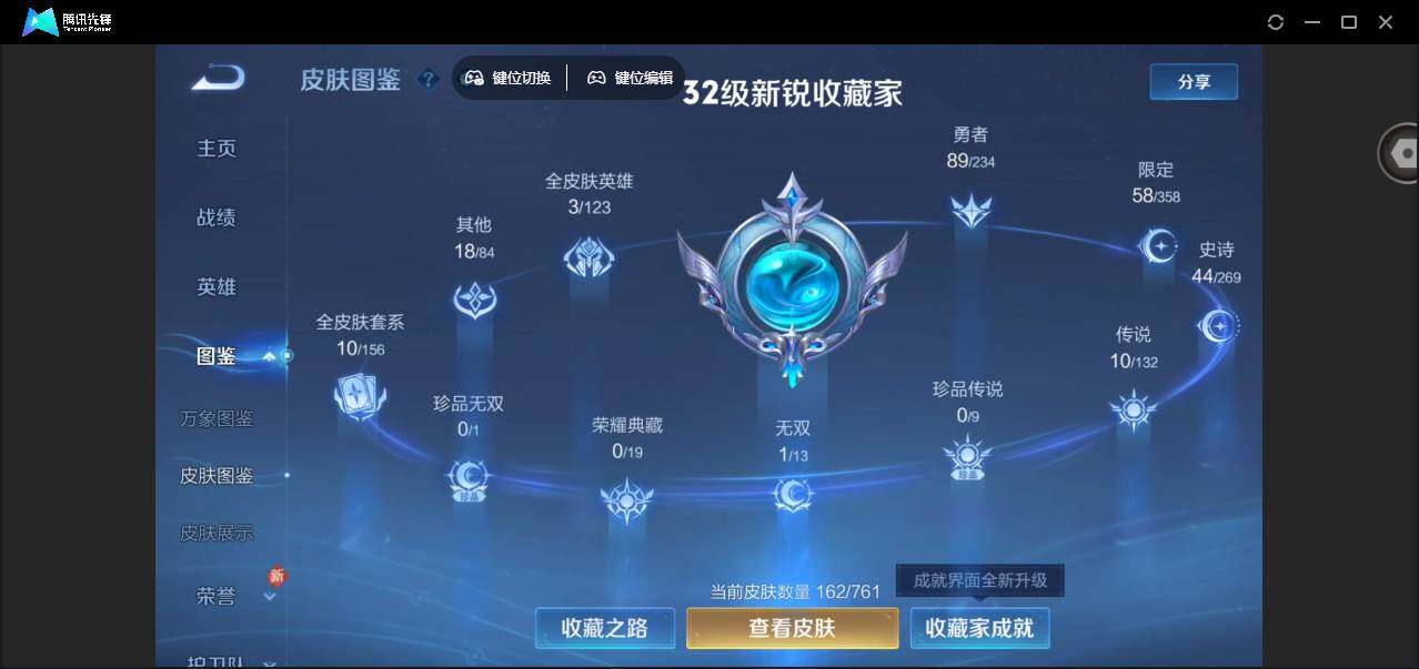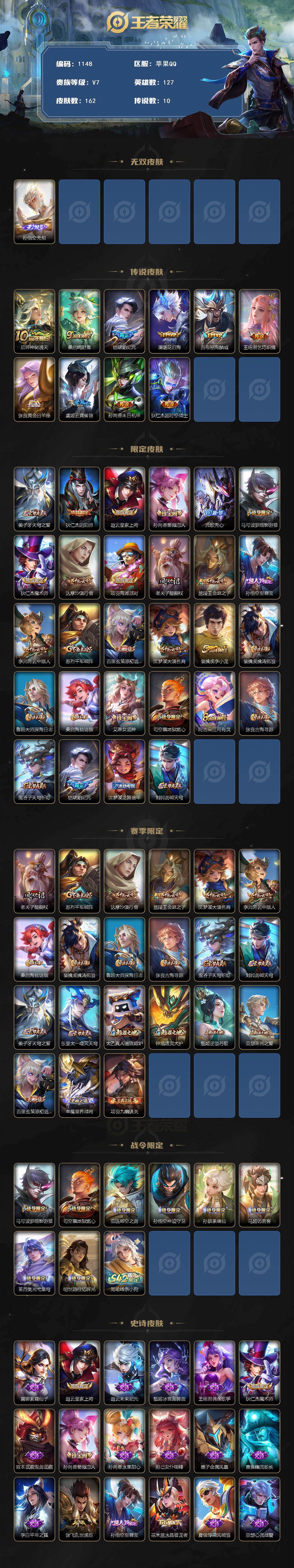 2226633 王者荣耀账号 苹果Q-V7-最强王者段位-127英雄-162皮肤-1无双-10传说-43史诗