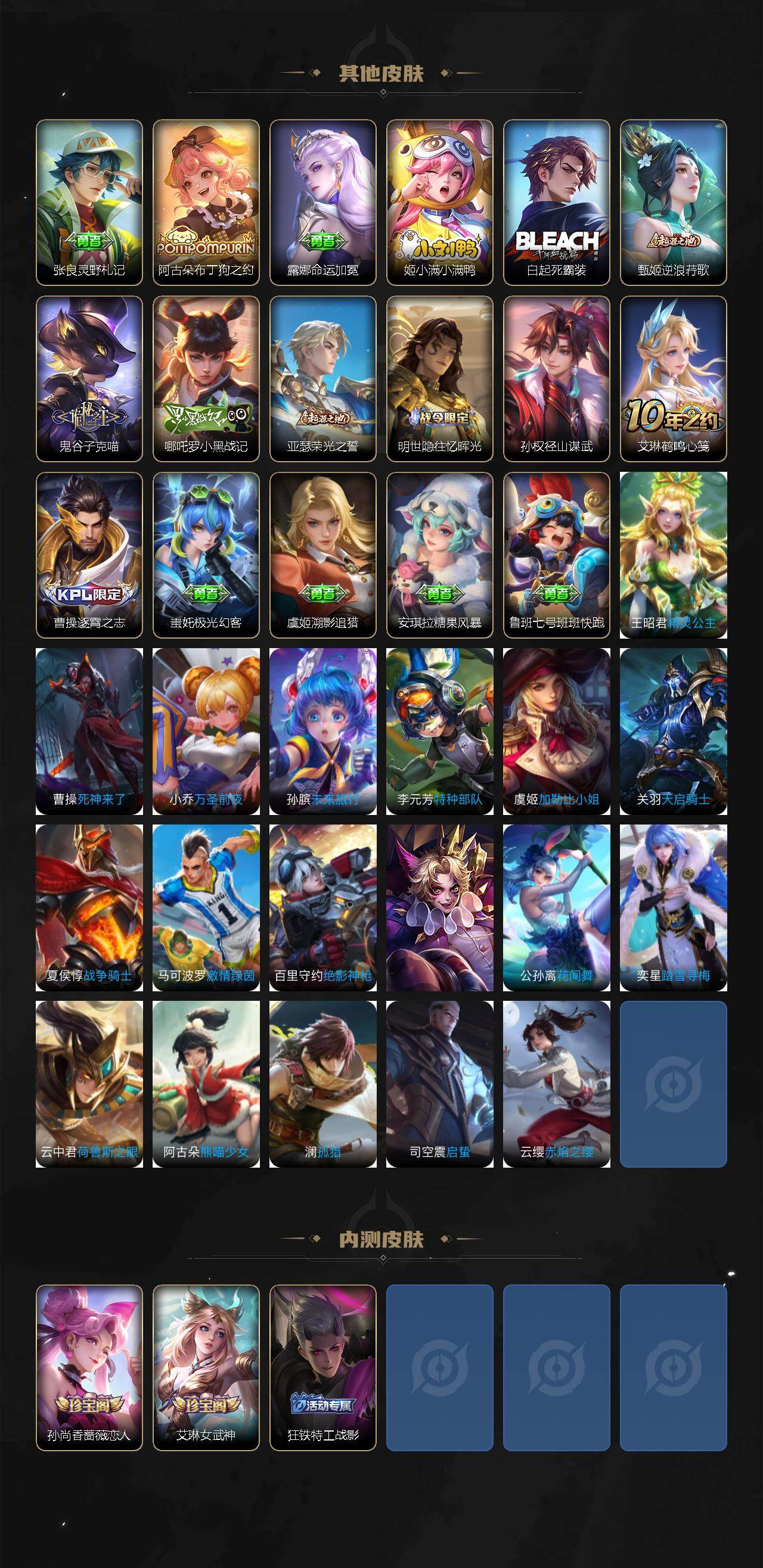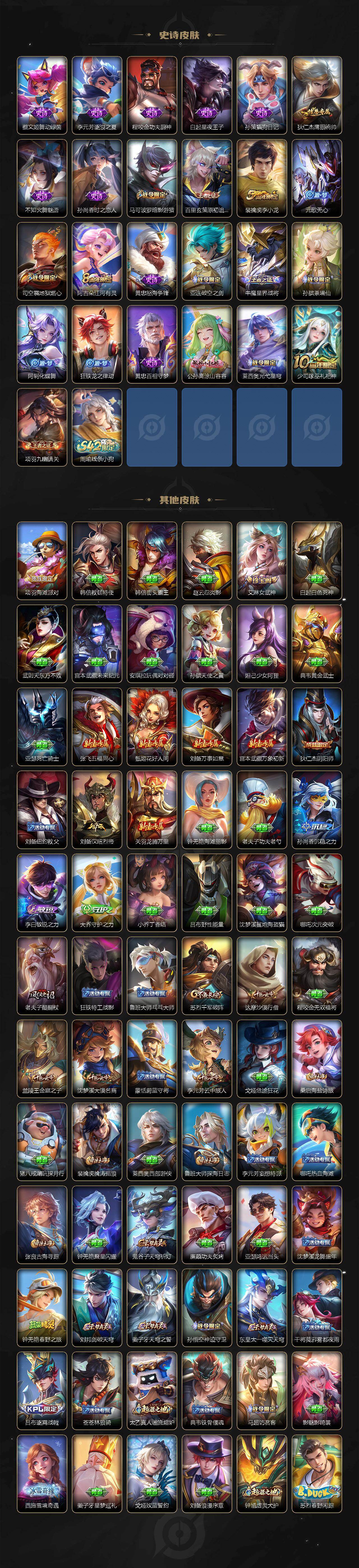 【传说皮肤】:后羿神树通天,桑启鸣野蒿,铠琥珀纪元,澜逐花归海,吕布怒海麟威,王昭君乞巧织情,张良黄金白羊座,虞姬云霓雀翎,孙尚香末日机甲,狄仁杰超时空战士