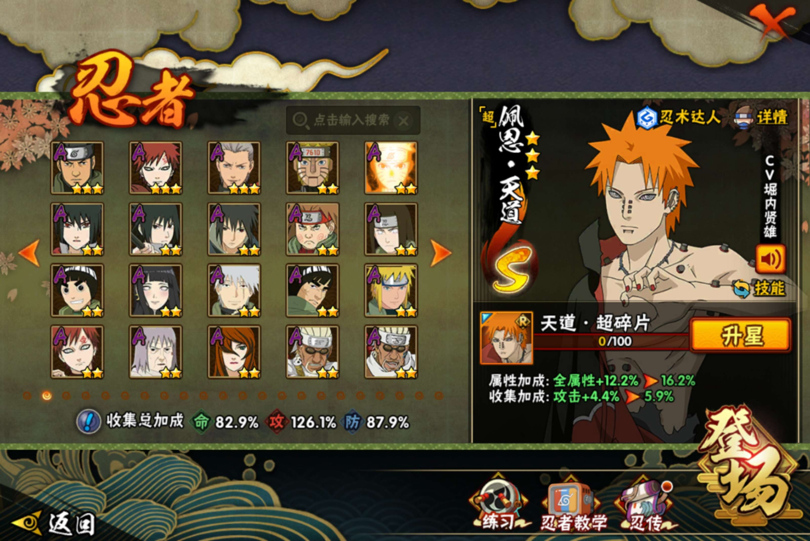 【S级忍者】宇智波斑「木叶创立」(3星),迈特凯「死门」(3星),宇智波斑「秽土转生·解」(3星),宇智波佐助「永恒万花筒」(3星),千手柱间「秽土转生」(3星),漩涡鸣人「九喇嘛连结」(3星),宇智波斑「