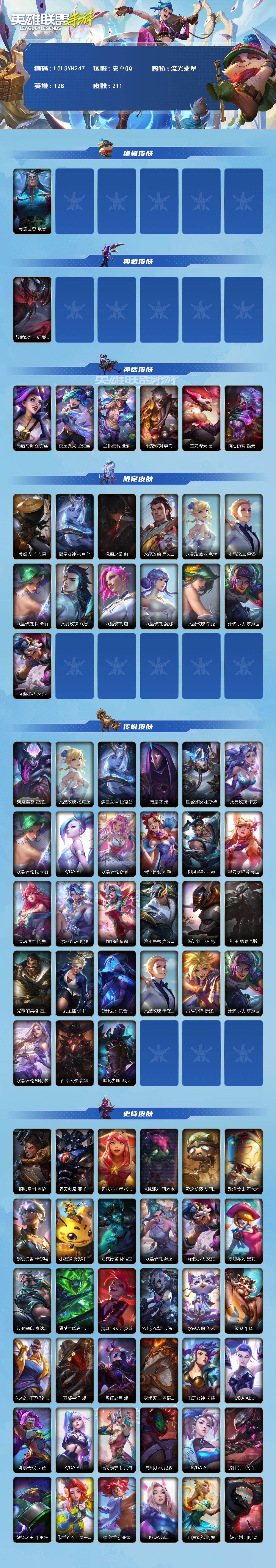 【LOLSYH247】128英雄/211皮肤/1典藏/6神话/27传说/流光翡翠/寻道世尊 永恩/超武乾坤劫/光谱幻影 金克丝/夜星流火 金克丝/渔帆满载 亚索/乘龙破渊 李青/玄龙绛天 易/满弓镇魂 箭无虚发 韦鲁斯/养蜂人 辛吉德/耀星女神 拉克丝/虎痴之拳 蔚/水晶玫瑰 嘉文四世/水晶玫瑰 拉克丝/水晶玫瑰 伊泽瑞尔/水晶玫瑰 阿卡丽/水晶玫瑰 永恩/水晶玫瑰 蔚/水晶玫瑰 娑娜/水晶玫瑰 锐雯/涂鸦小队 莎弥拉/涂鸦小队 艾克/海魔至尊 亚托克斯/暗星尊 烬/星域游侠 崔斯特/水晶玫瑰