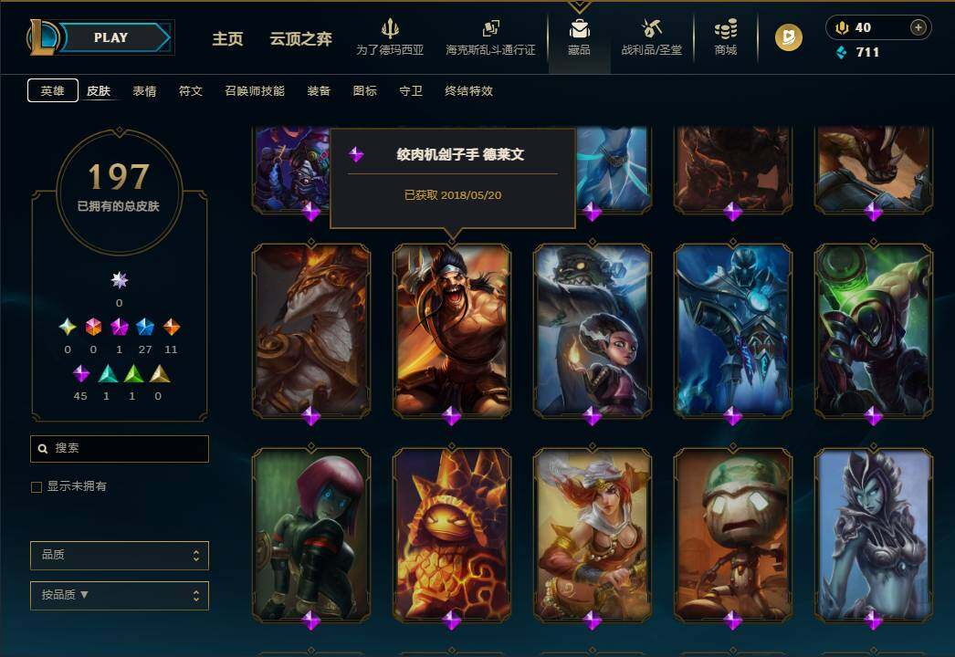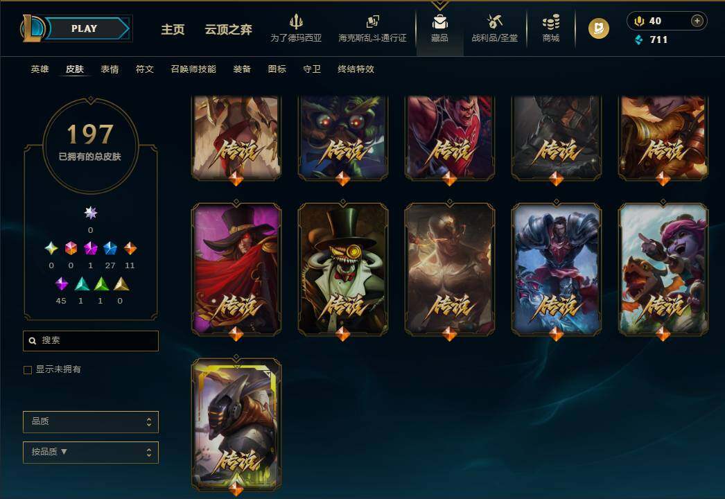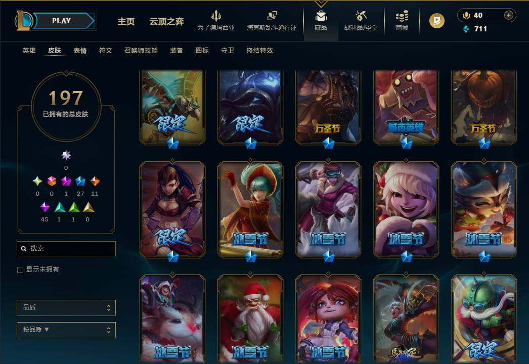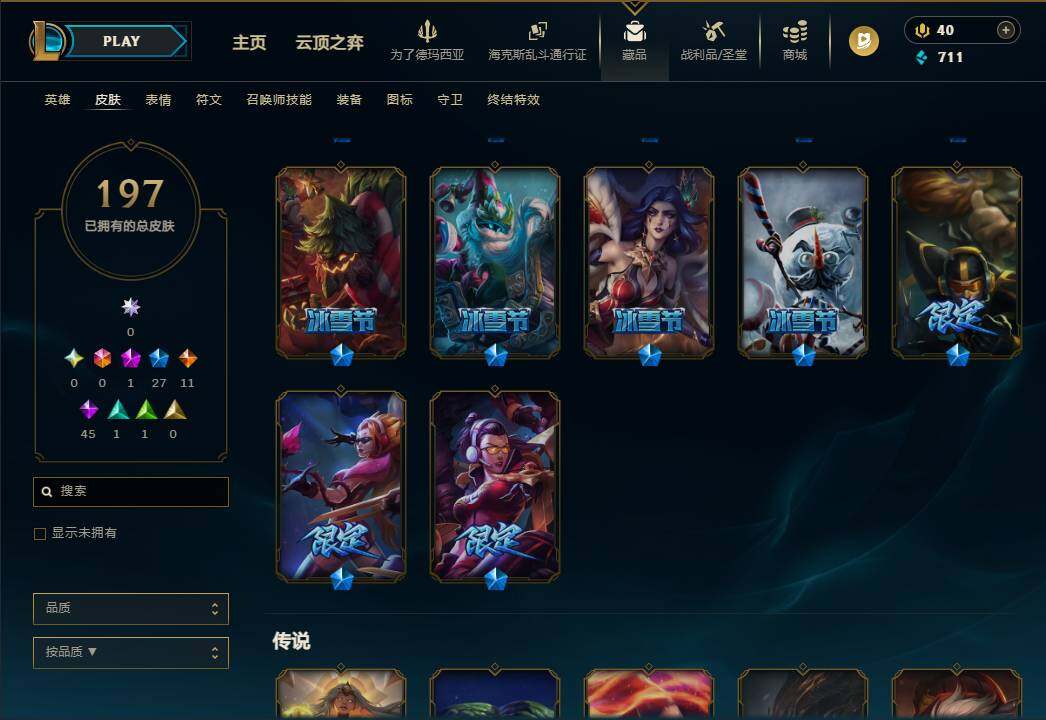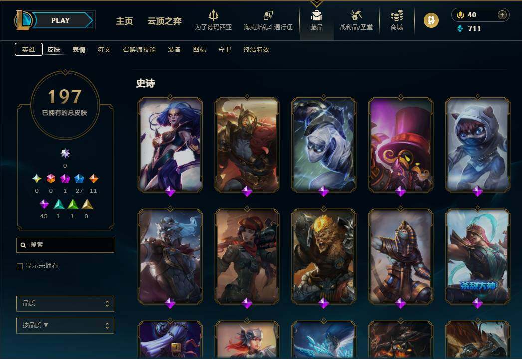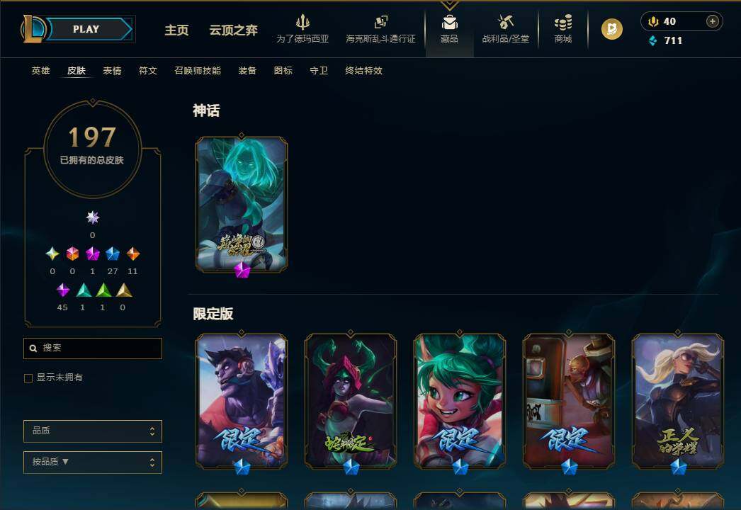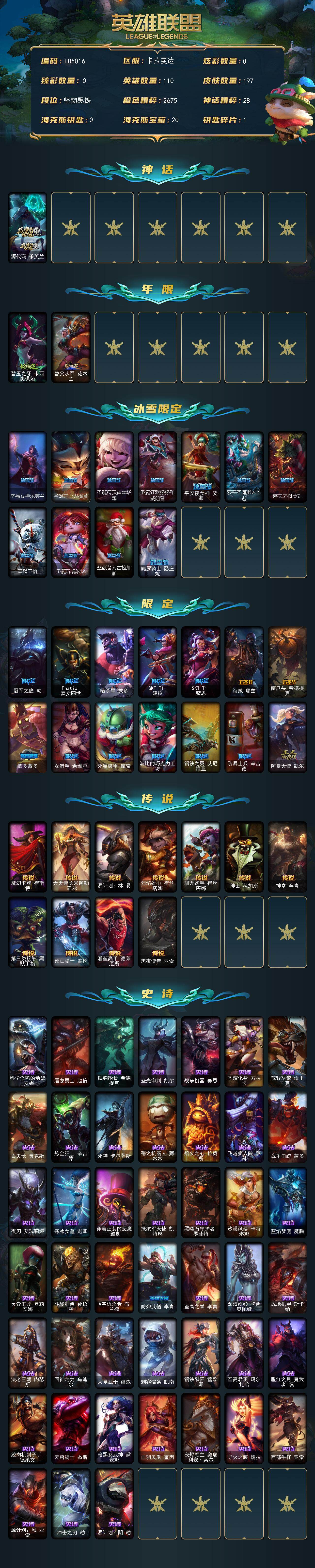110英雄/197皮肤/1神话/27限定/11传说/45史诗/未定级账号等级:58