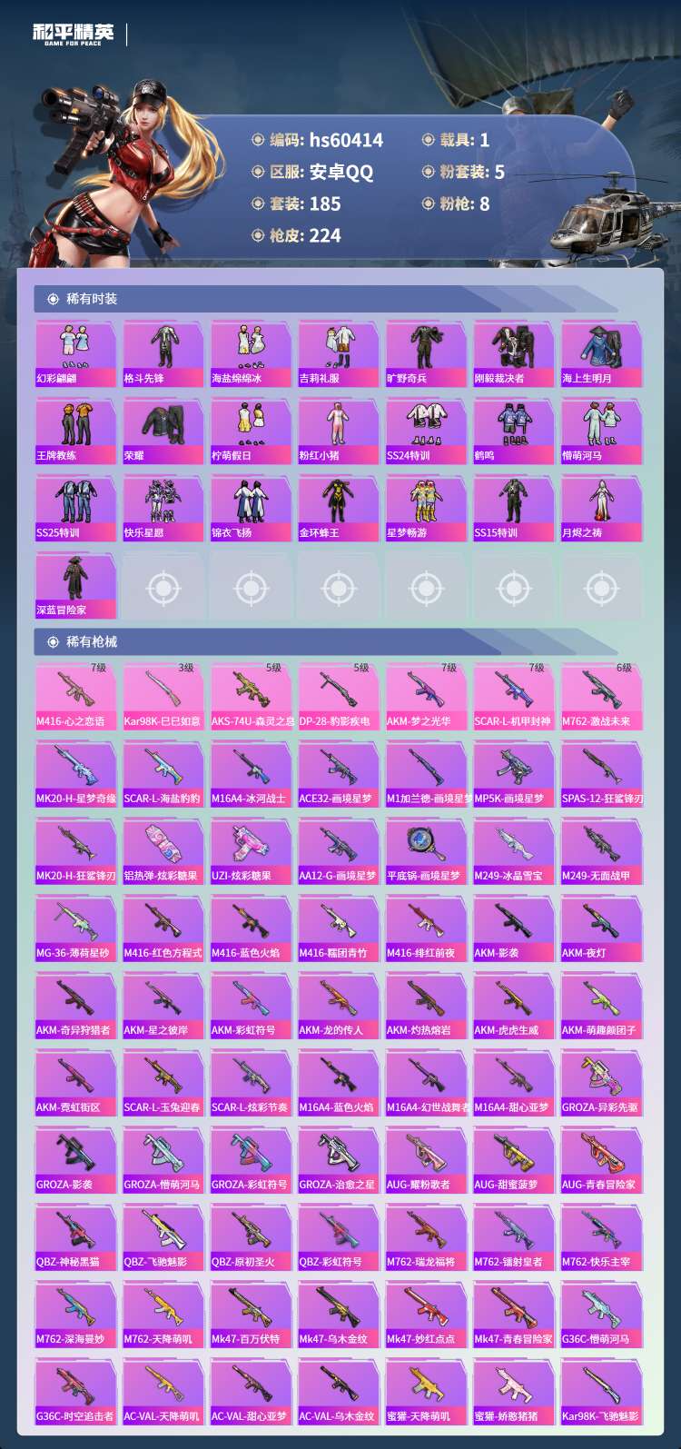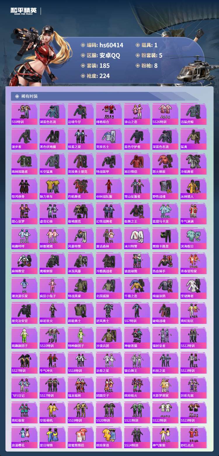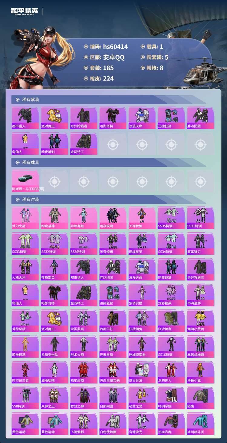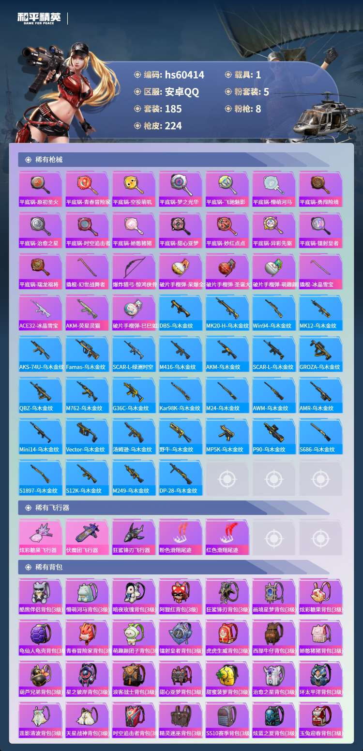 hs60414 安卓手Q-21王牌印记-有战神框-5粉装-8特效枪-1载具-75730热力值-185