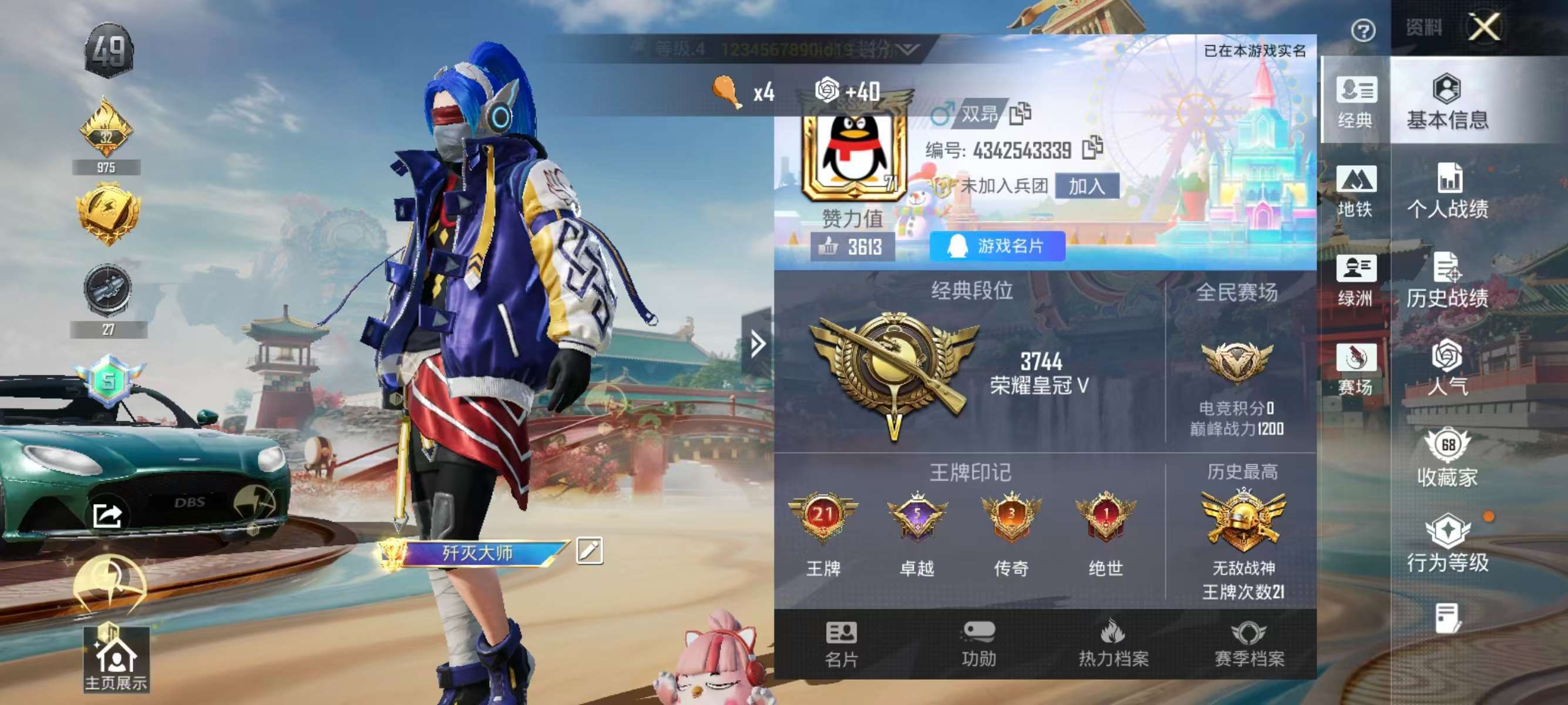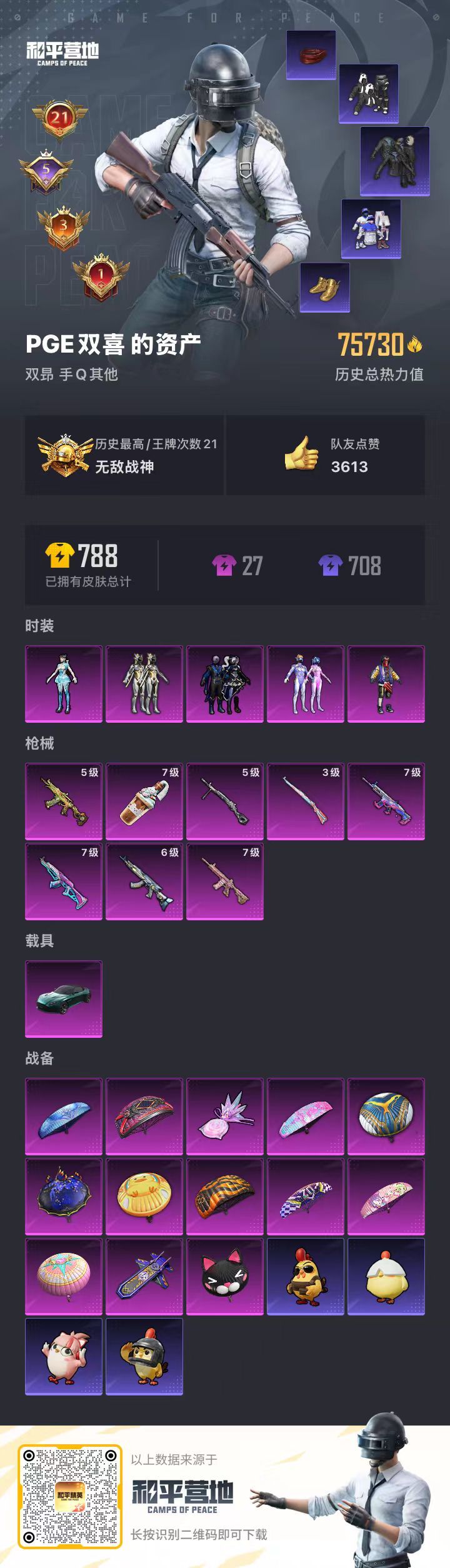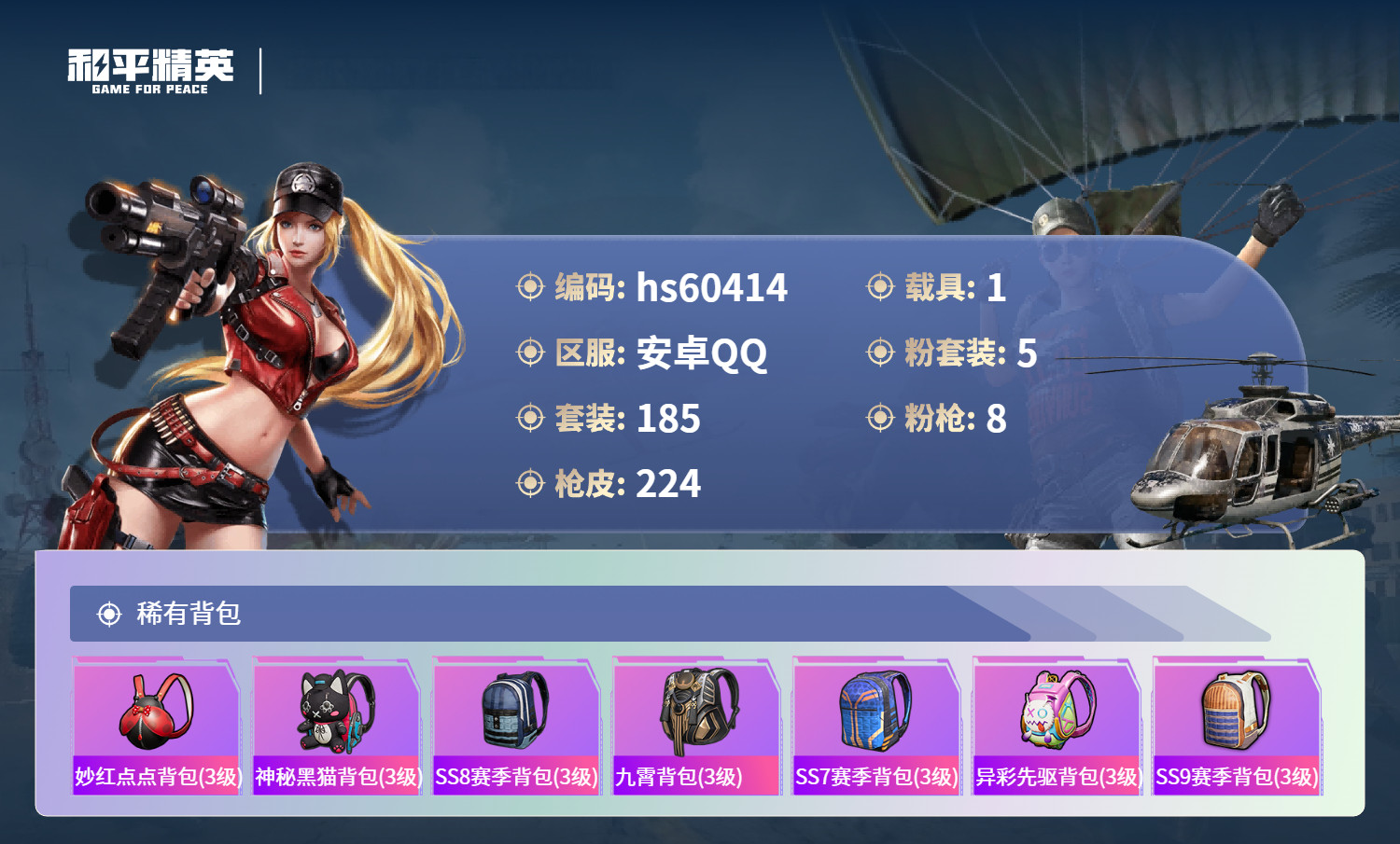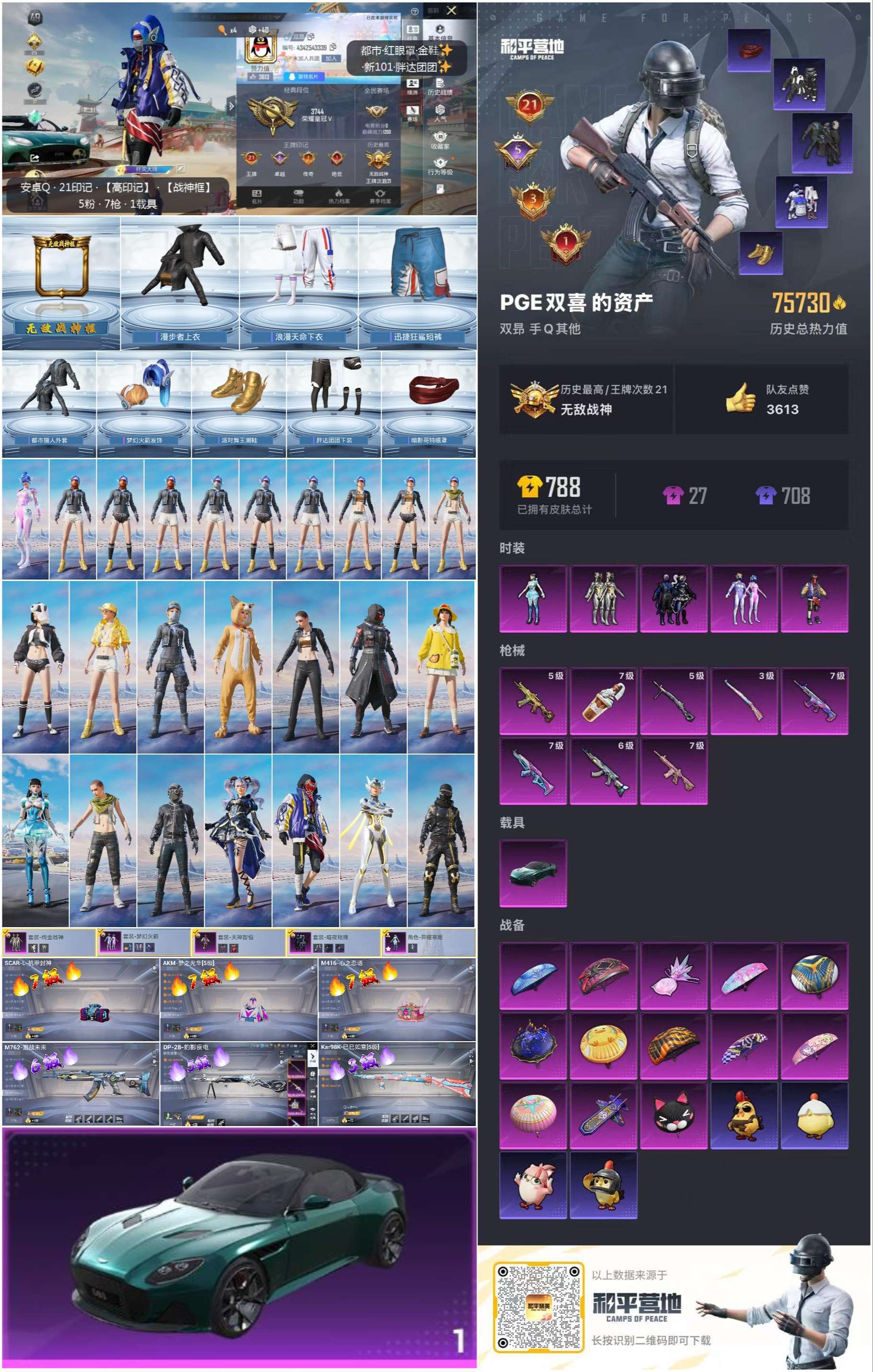 hs60414 安卓手Q-21王牌印记-有战神框-5粉装-8特效枪-1载具-75730热力值-185