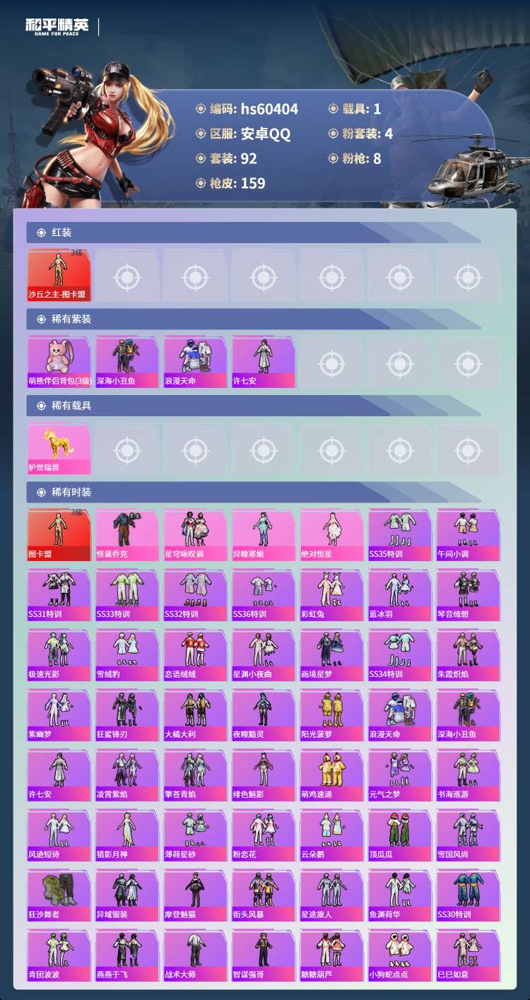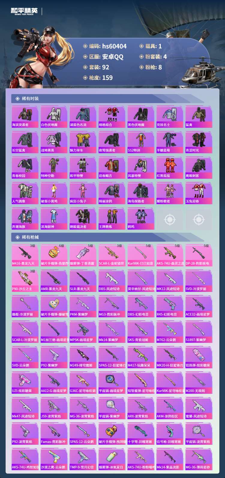 hs60404 安卓手Q-7王牌印记-有战神框-1红装-4粉装-8特效枪-1载具-49009热力值-