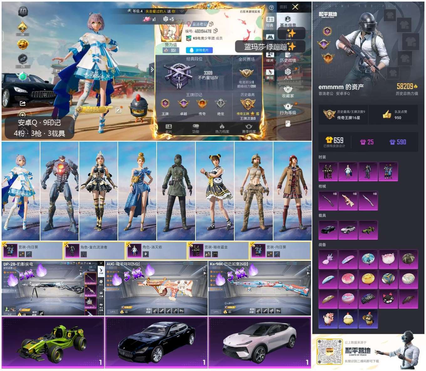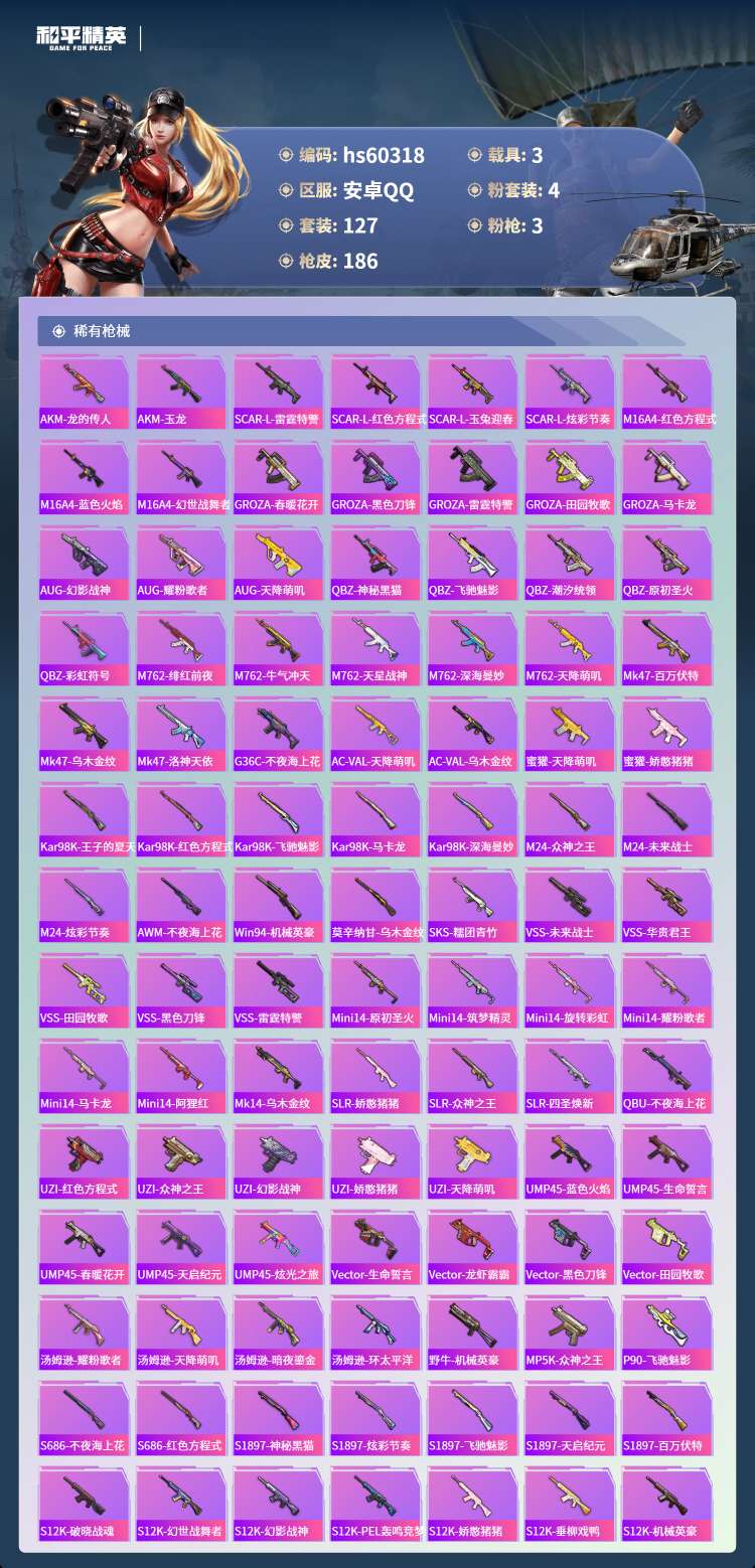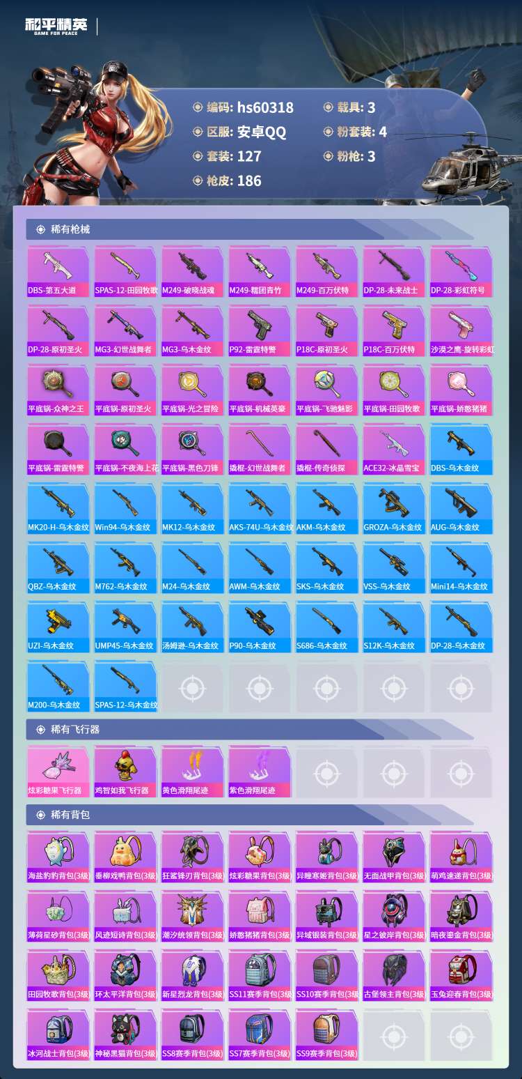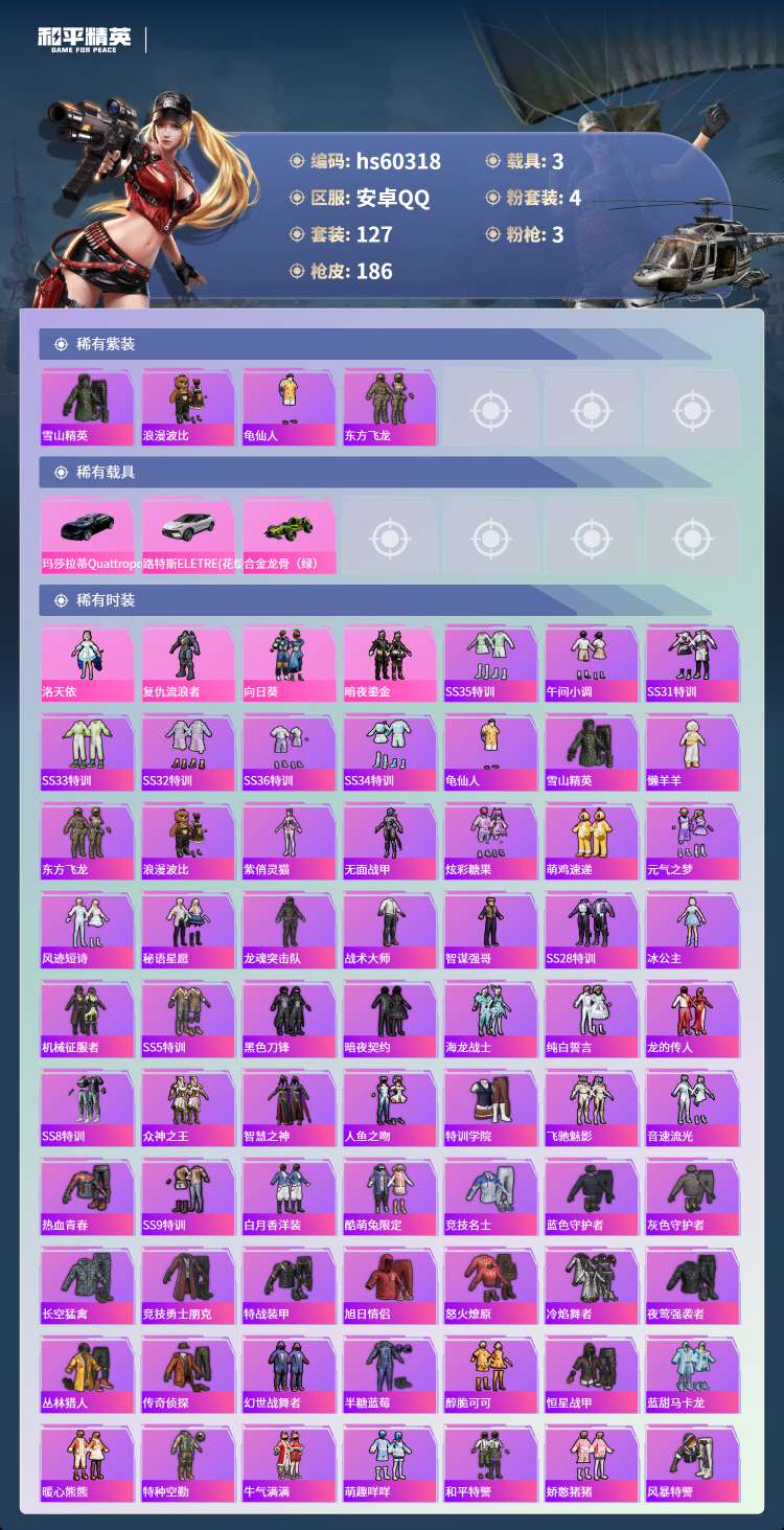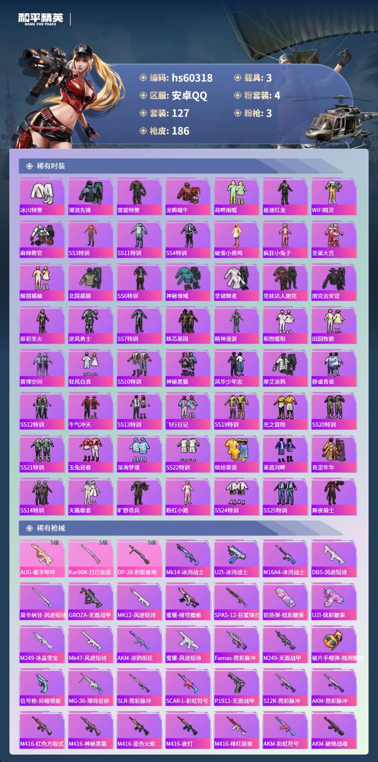hs60318 安卓手Q-9王牌印记-4粉装-3特效枪-3载具-58433热力值-127套装-186