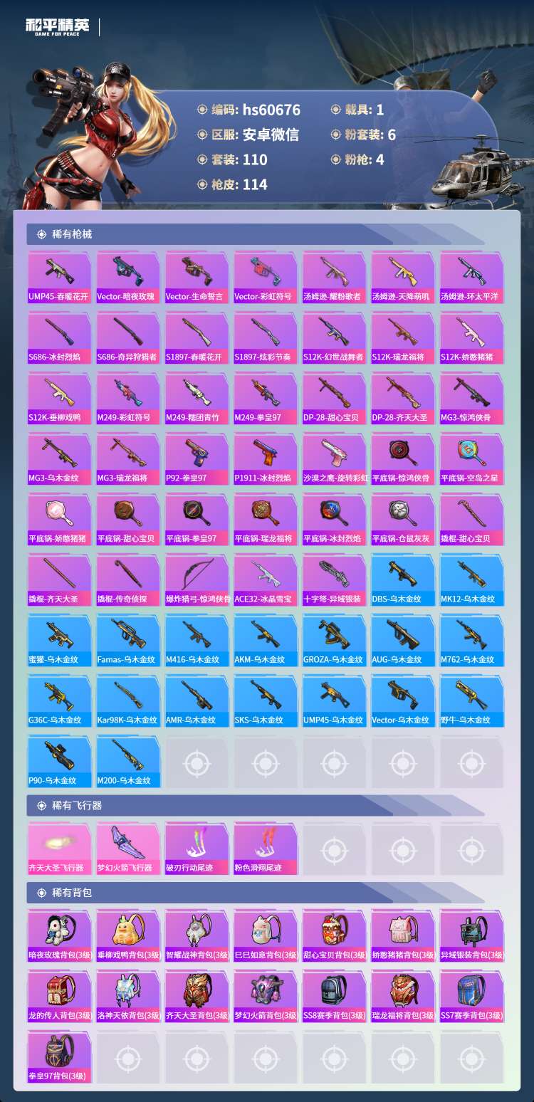 hs60676 安卓微-5王牌印记-6粉装-4特效枪-1载具-42172热力值-110套装-114