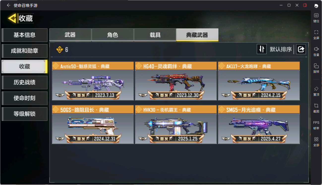 【典藏武器】AK117-火龙咆哮·典藏,HG40-灵魂羁绊·典藏,Arctic50-魅惑灵狐·典藏,HVK30-街机霸王·典藏,50GS-路阻且长·典藏,SMG5-月光追痕·典藏,