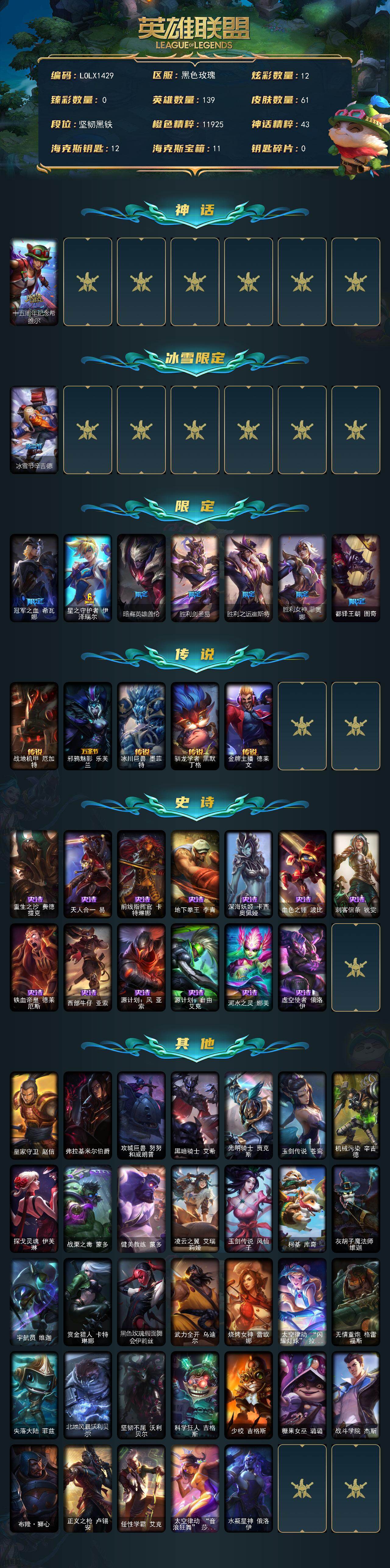 【LOLX1429】139英雄/61皮肤/1神话/9限定/12炫彩/5传说/13史诗/未定级/十五周年纪念希维尔/冰雪节辛吉德/冠军之血希瓦娜/星之守护者伊泽瑞尔/暗裔英雄盖伦/胜利剑圣易/胜利之运崔斯特/胜利女神菲奥娜/都铎王朝图奇/战地机甲厄加特/邪鸦魅影乐芙兰/冰川巨兽墨菲特/驯龙学者黑默丁格/金牌主播德莱文/重生之沙费德提克/天人合一易/前线指挥官卡特琳娜/地下拳王李青/深海妖姬卡西奥佩娅/血色之锤波比/刺客信条锐雯/铁血帝皇德莱厄斯/西部牛仔亚索/源计划风亚索/源计划自由艾克/河水之灵