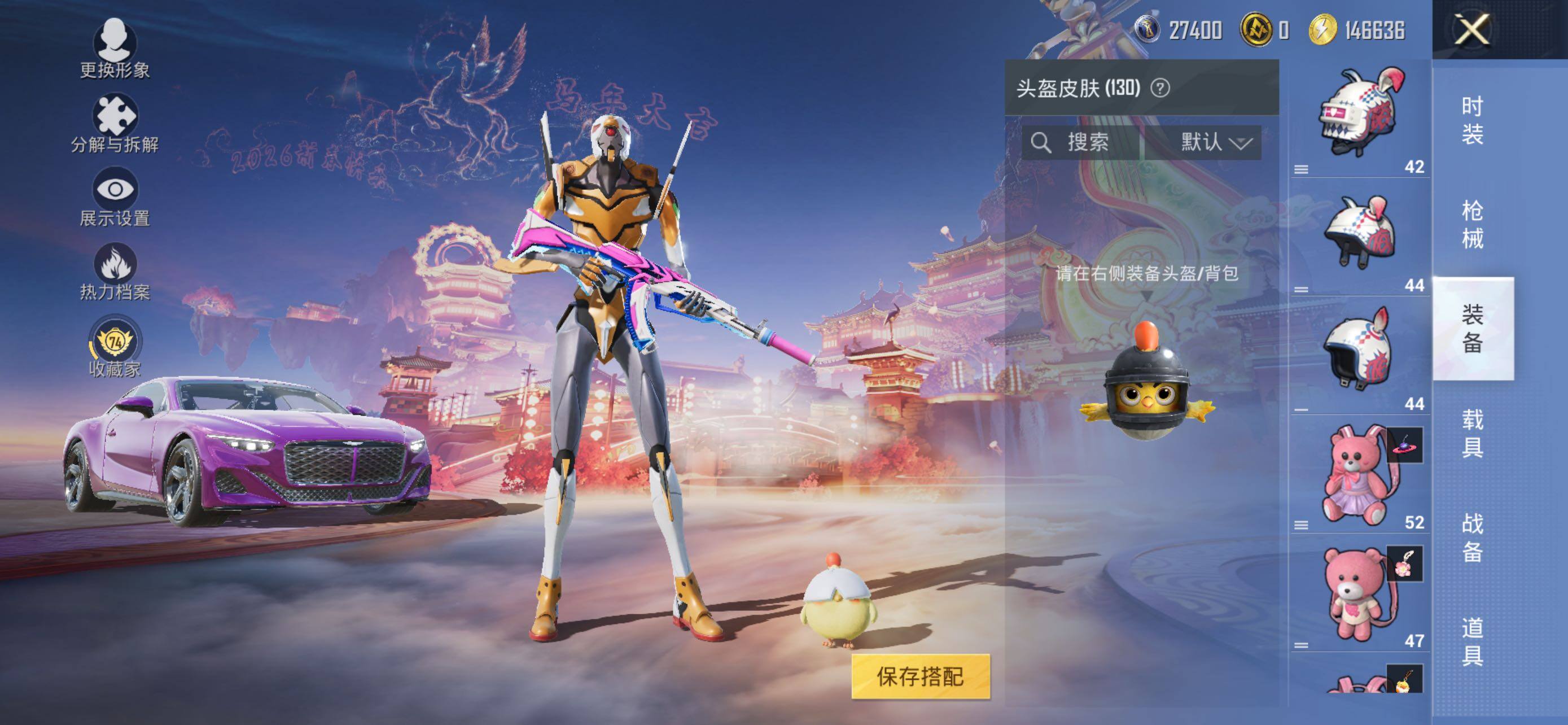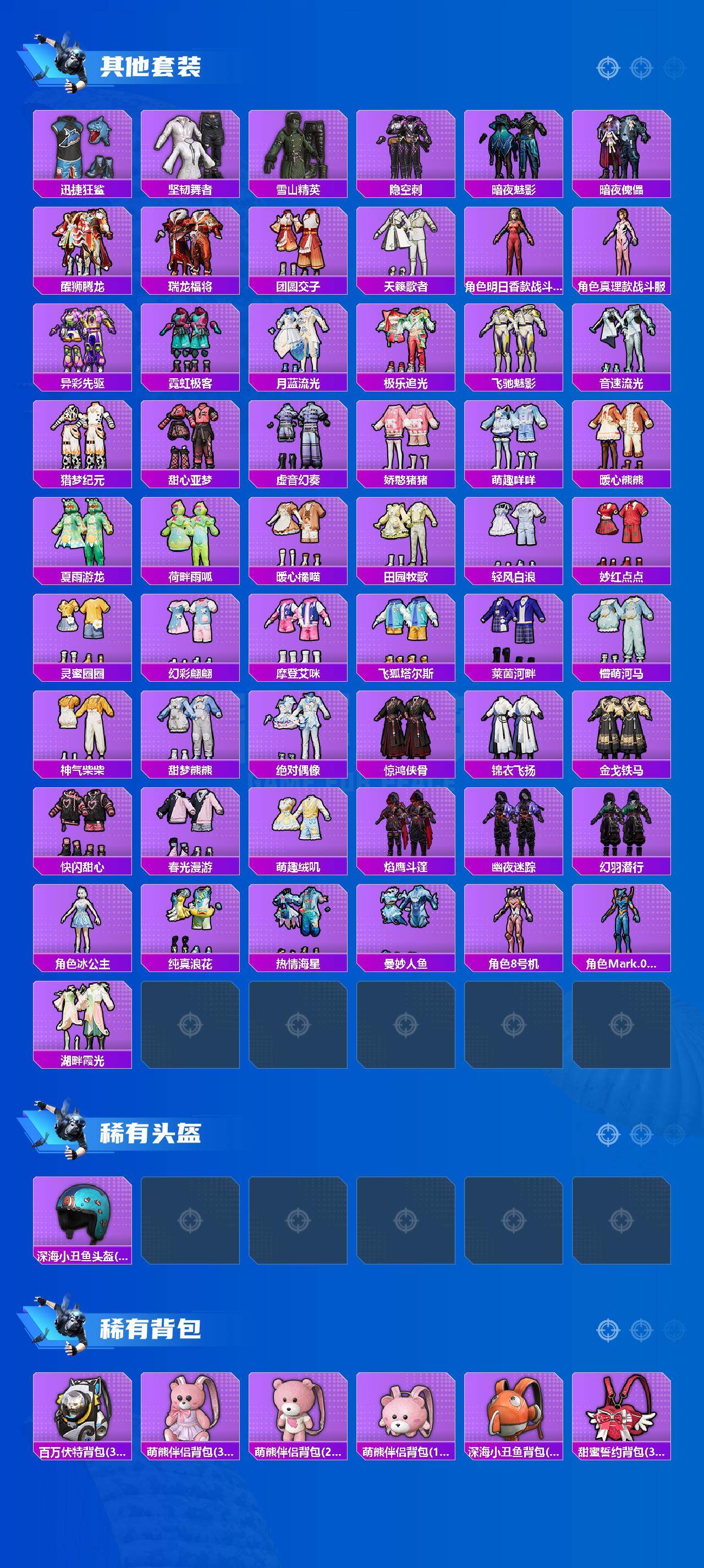 【粉色套装】:粉装-新星烈龙,粉装-冰霜白皇,粉装-炙焰红王,角色-零号机款机体服,粉装-蓝莓炮弹,粉装-酣梦娃娃,角色-复仇流浪者,粉装-彩虹甜喵,粉