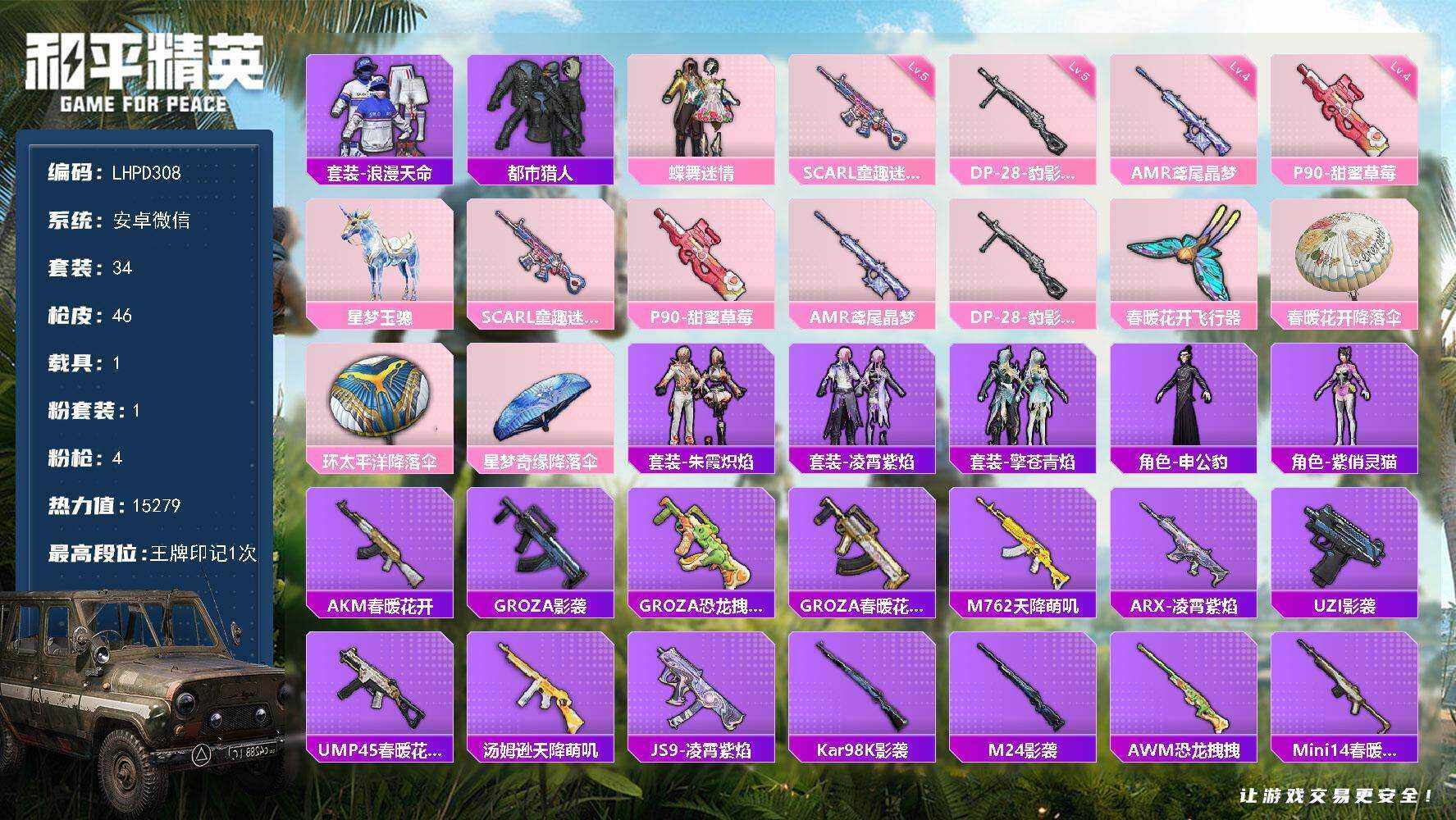 【特价出售/店主推荐】安卓 微信-1粉装-4特效枪-1载具-3粉色飞行器-15279热力值-1王牌印记-34套装-46枪皮【热门品类】:套装-浪漫天命,套装-都市猎人【粉色套装】:粉装-蝶舞迷情【粉色枪皮等级】:SCAR-L-童趣迷兔(五级),P90-甜蜜草莓(四级),AMR-鸢尾晶梦(四级),DP-28-豹影疾电(五级)【粉色载具】:星梦玉骢【粉色枪皮】:SCAR-L-童趣迷兔,P90-甜蜜草