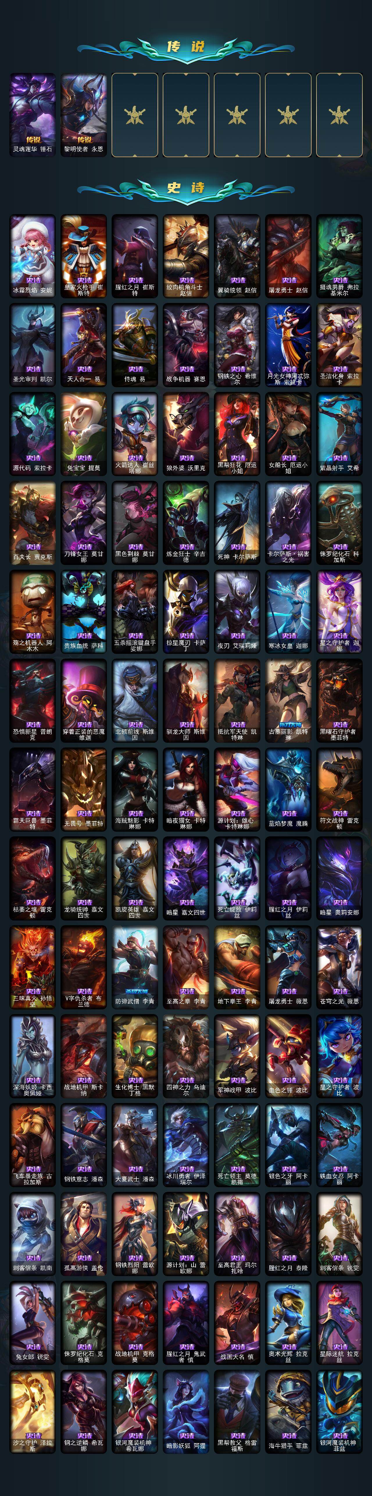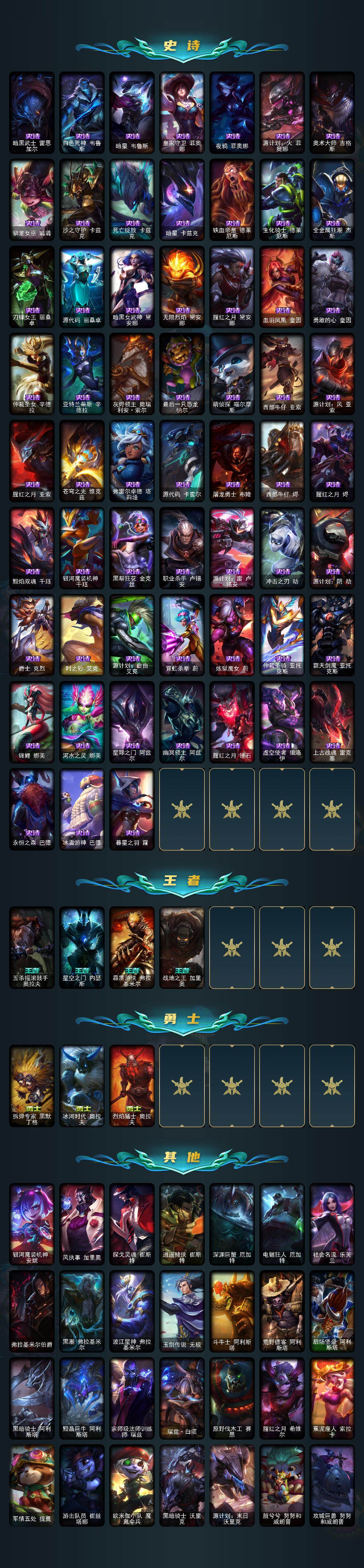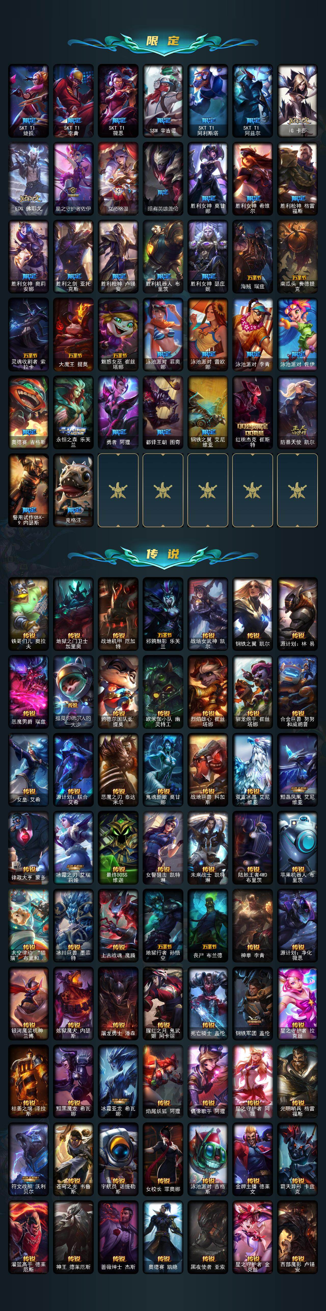 172英雄/554皮肤/5终极/14神话/70限定/18臻彩/190炫彩/65传说/157史诗/未定级