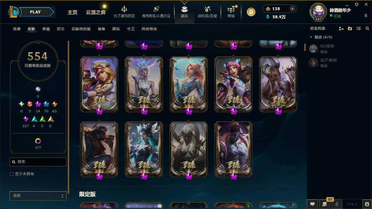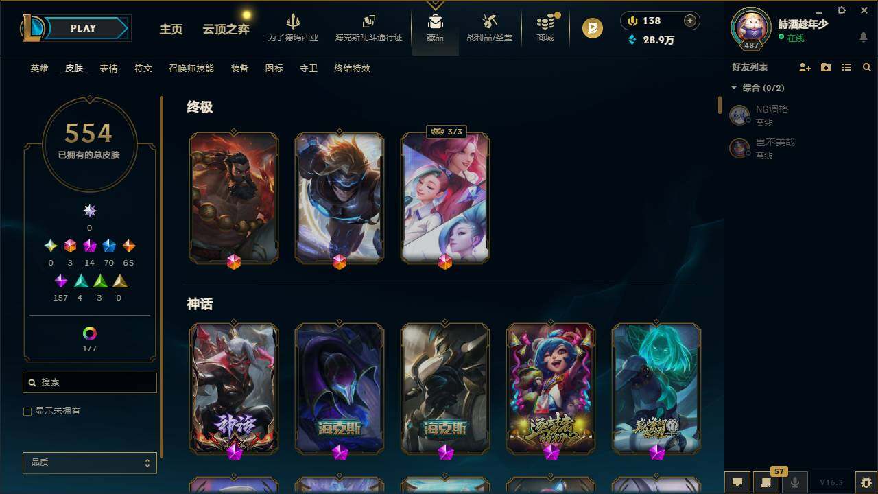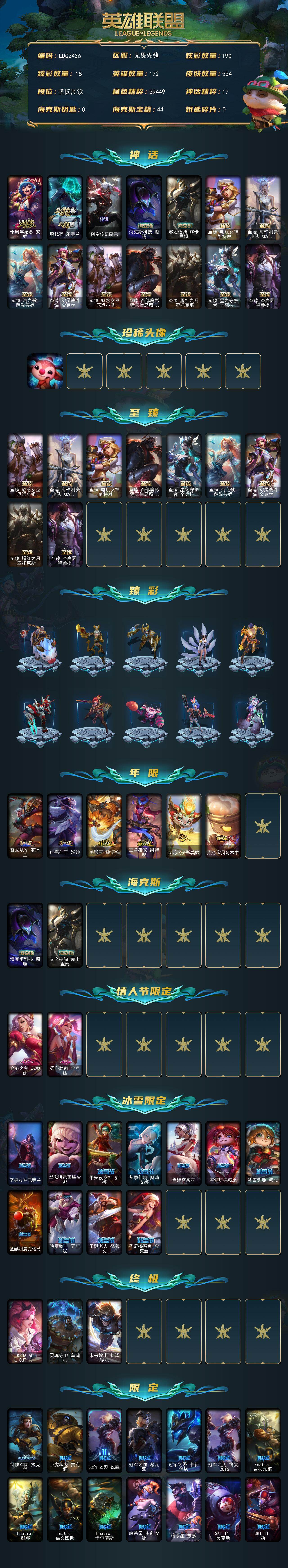 172英雄/554皮肤/5终极/14神话/70限定/18臻彩/190炫彩/65传说/157史诗/未定级