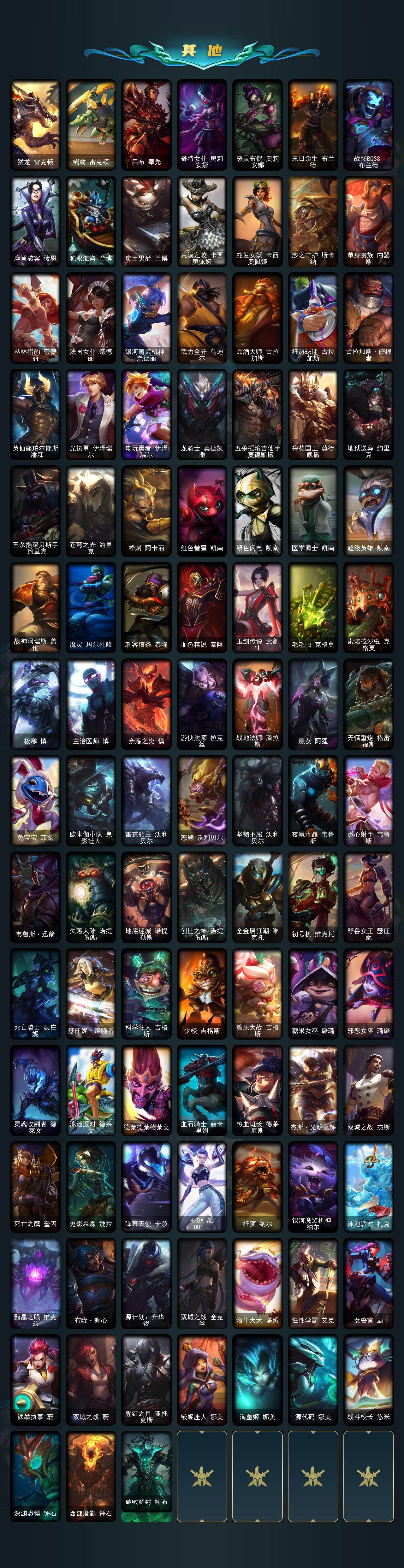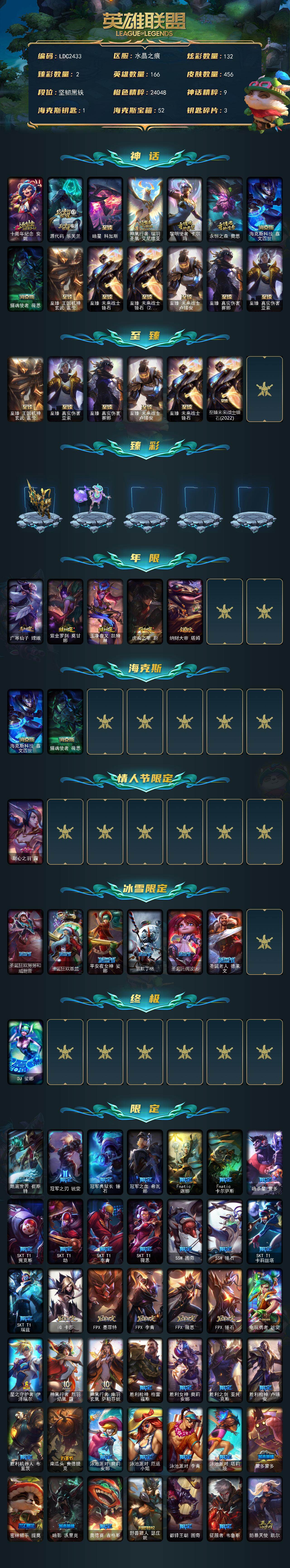 【LDC2433】166英雄/456皮肤/1终极/14神话/55限定/2臻彩/132炫彩/52传说/130史诗/未定级/十周年纪念安妮/源代码乐芙兰/暗星科加斯/神凰行者瑞羽圣凰艾尼维亚/黎明使者卡尔玛/永恒之森奥恩/海克斯科技嘉文四世/摄魂使者薇恩/至臻真实伤害赛娜/至臻真实伤害亚索/至臻王国机神玄武盖伦/至臻未来战士锤石/至臻未来战士锤石2022/至臻未来战士卢锡安/至臻未来战士锤石(2022)/吕布奉先炫金战神/泳池派对奥莉安娜优雅珠光鲸/广寒仙子嫦娥/紫金罗刹莫甘娜/玉净夜叉凯特琳/虎痴