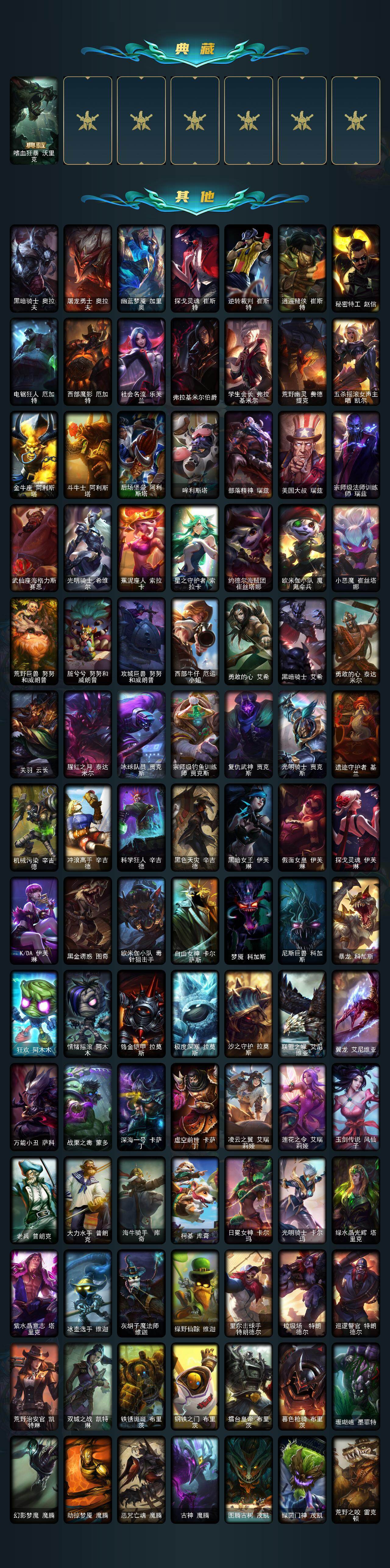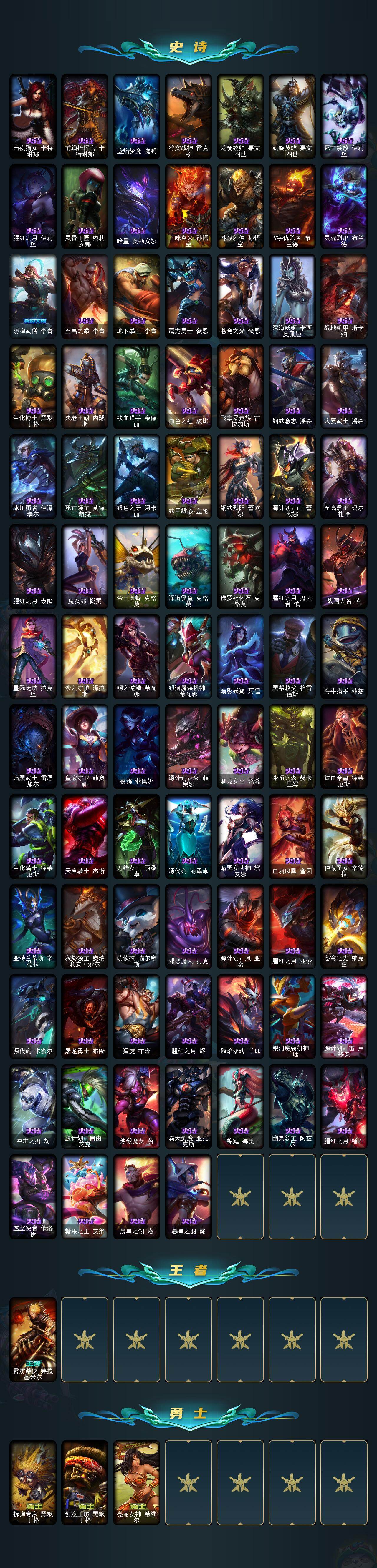 166英雄/456皮肤/1终极/14神话/55限定/2臻彩/132炫彩/52传说/130史诗