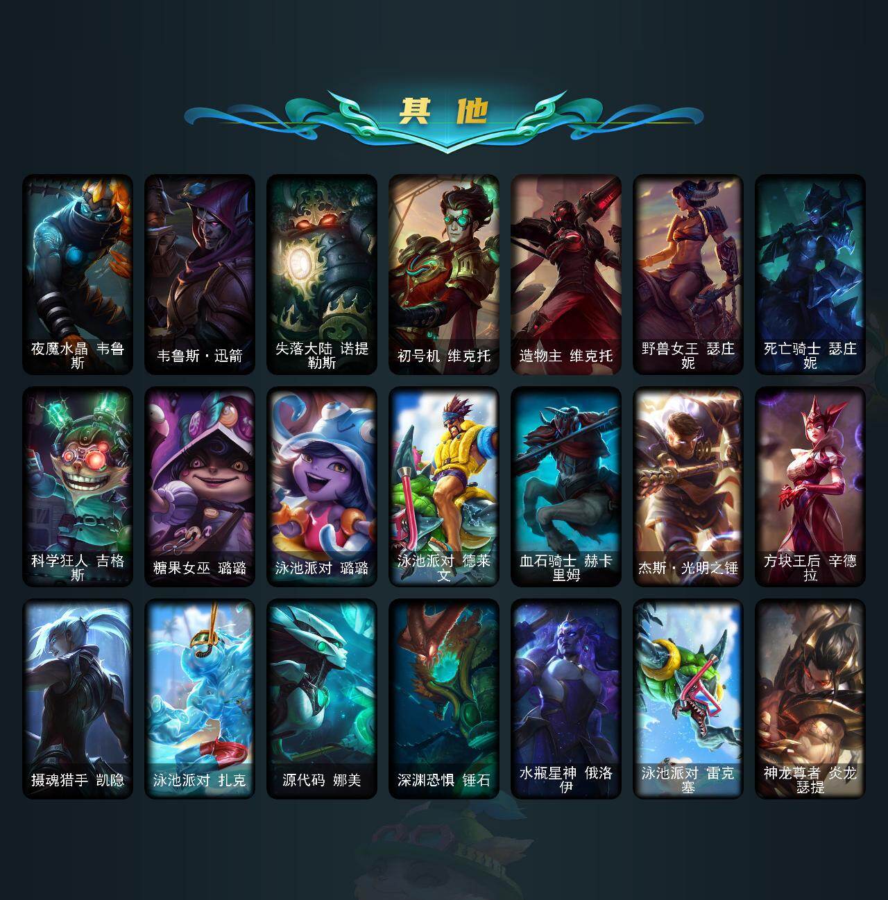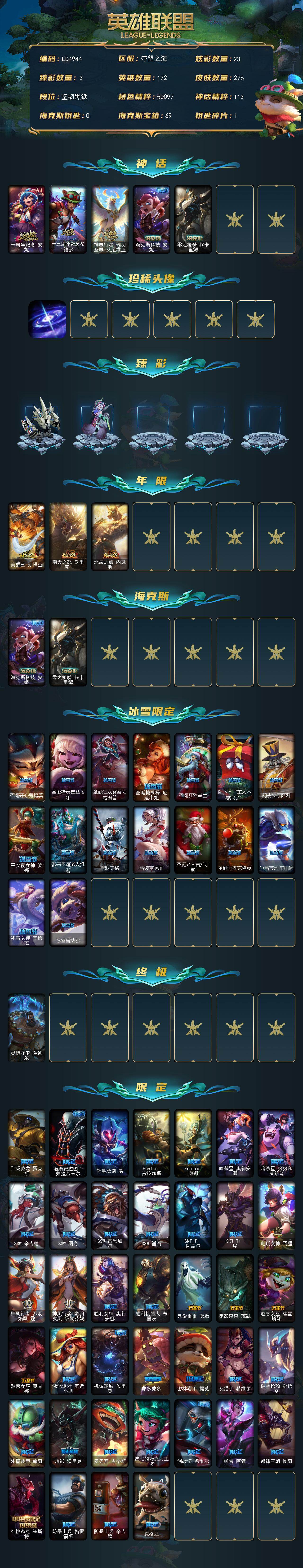 【LD4944】172英雄/276皮肤/1终极/5神话/58限定/3臻彩/23炫彩/34传说/66史诗/未定级/十周年纪念安妮/十五周年纪念希维尔/神凰行者瑞羽圣凰艾尼维亚/海克斯科技安妮/零之枪骑赫卡里姆/星界起源头像/霸天巨兽雪崩墨菲特/魔女阿卡丽虚荣/净雪之月莫甘娜冬虹/美猴王孙悟空/南天之怒沃里克/北辰之威内瑟斯/圣诞开心鬼提莫/圣诞精灵崔丝塔娜/圣诞狂欢努努和威朗普/圣诞糖果棒厄运小姐/圣诞狂欢基兰/阿木木“主人不要我了”/胡桃夹子萨科/平安夜女神娑娜/邪恶圣诞老人维迦/雪默丁格/雪装