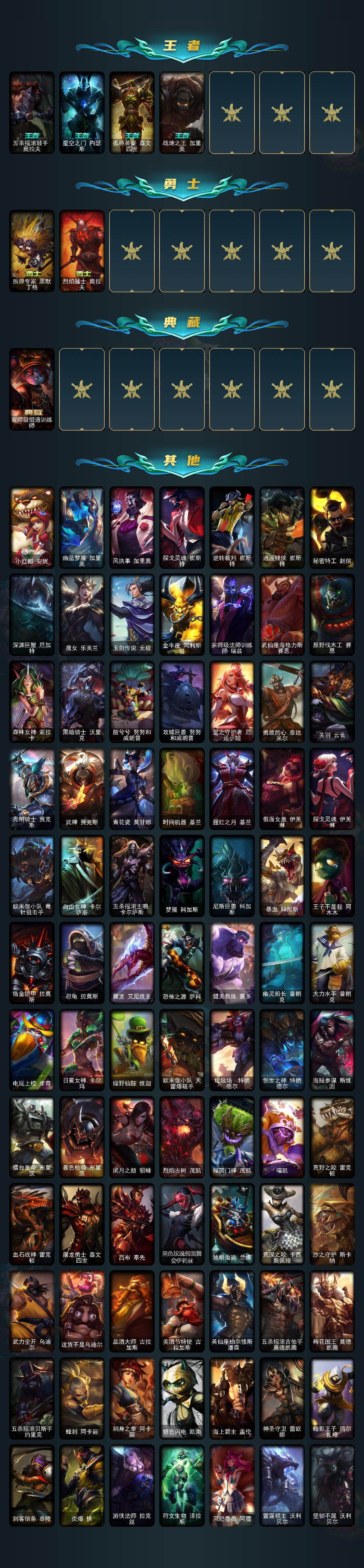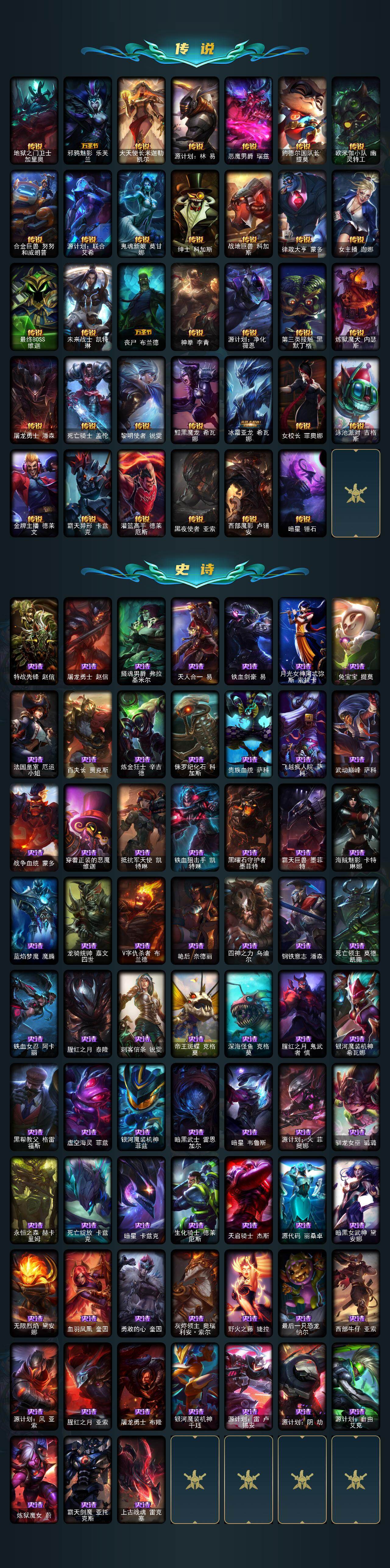172英雄/276皮肤/1终极/5神话/58限定/3臻彩/23炫彩/34传说/66史诗/未定级