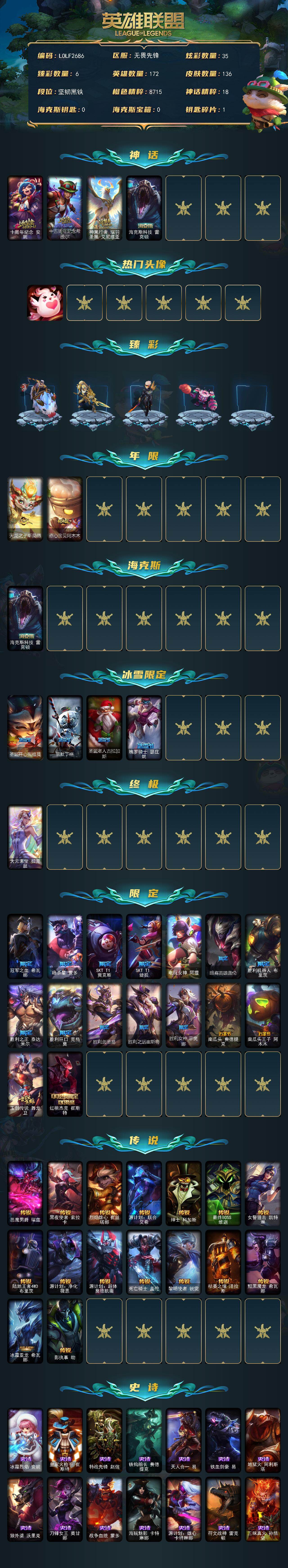 【LOLF2686】172英雄/136皮肤/1终极/4神话/23限定/6臻彩/35炫彩/16传说/25史诗/未定级/十周年纪念安妮/十五周年纪念希维尔/神凰行者瑞羽圣凰艾尼维亚/海克斯科技雷克顿/爱情鸽头像/无畏骑士瑟庄妮赤子初心/赵云子龙炫金将军/源计划火菲奥娜惩戒/可爱可爱粉红红布里茨/星之守护者阿卡丽未来之光/魔女阿卡丽虚荣/天龙之子斯莫德/点心宝贝阿木木/圣诞开心鬼提莫/雪默丁格/圣诞老人古拉加斯/魄罗骑士瑟庄妮/大元素使拉克丝/冠军之血希瓦娜/暗杀星蒙多/SKTT1贾克斯/SKTT1婕