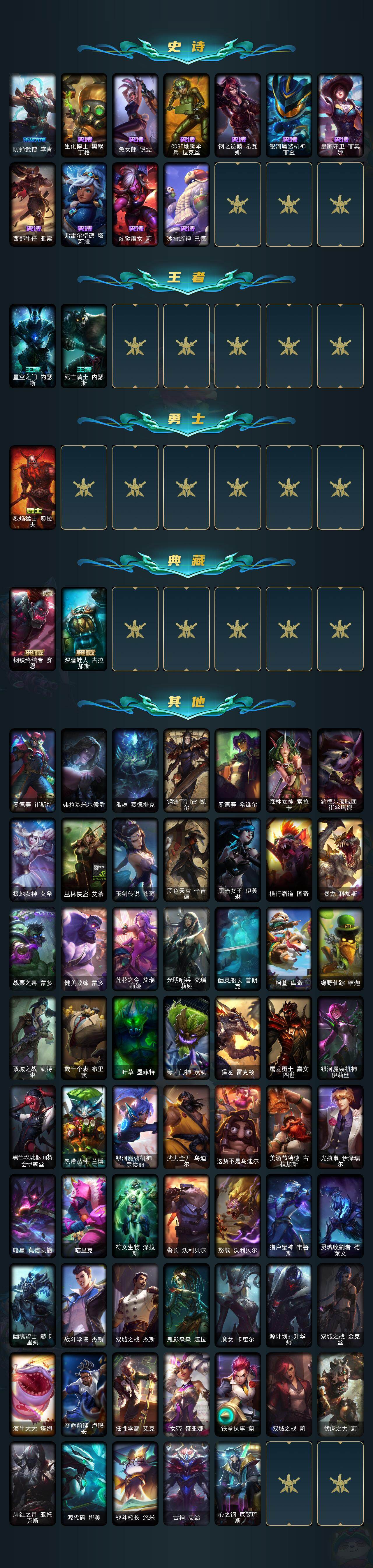 172英雄/136皮肤/1终极/4神话/23限定/6臻彩/35炫彩/16传说/25史诗/未定级
