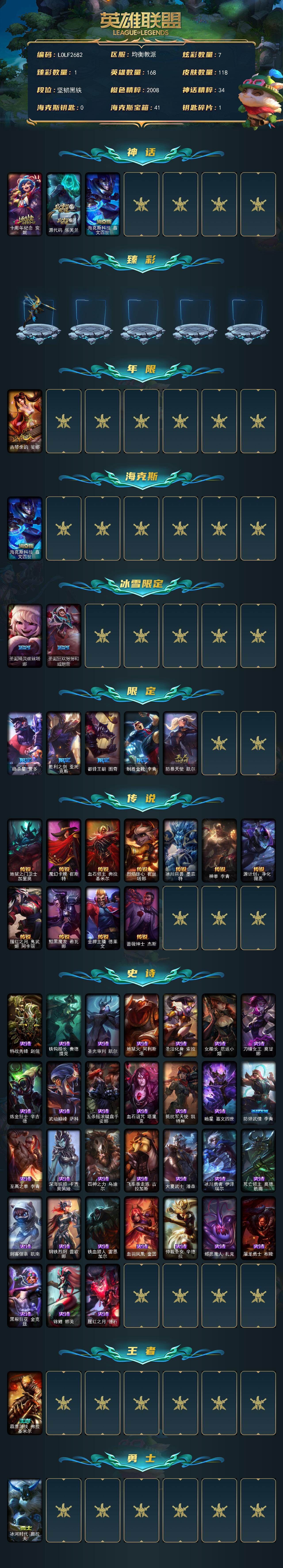 【LOLF2682】168英雄/118皮肤/3神话/8限定/1臻彩/7炫彩/11传说/31史诗/未定级/十周年纪念安妮/源代码乐芙兰/海克斯科技嘉文四世/冠军之矛卡莉丝塔凯旋圣装/古琴余韵娑娜/圣诞精灵崔丝塔娜/圣诞狂欢努努和威朗普/暗杀星蒙多/胜利之剑亚托克斯/都铎王朝图奇/制胜金靴李青/防暴天使凯尔/地狱之门卫士加里奥/魔幻卡牌崔斯特/血石领主弗拉基米尔/烈焰雄心崔丝塔娜/冰川巨兽墨菲特/神拳李青/源计划净化薇恩/腥红之月鬼武姬阿卡丽/黯黑魔龙希瓦娜/金牌主播德莱文/蔷薇绅士杰斯/特战先锋赵