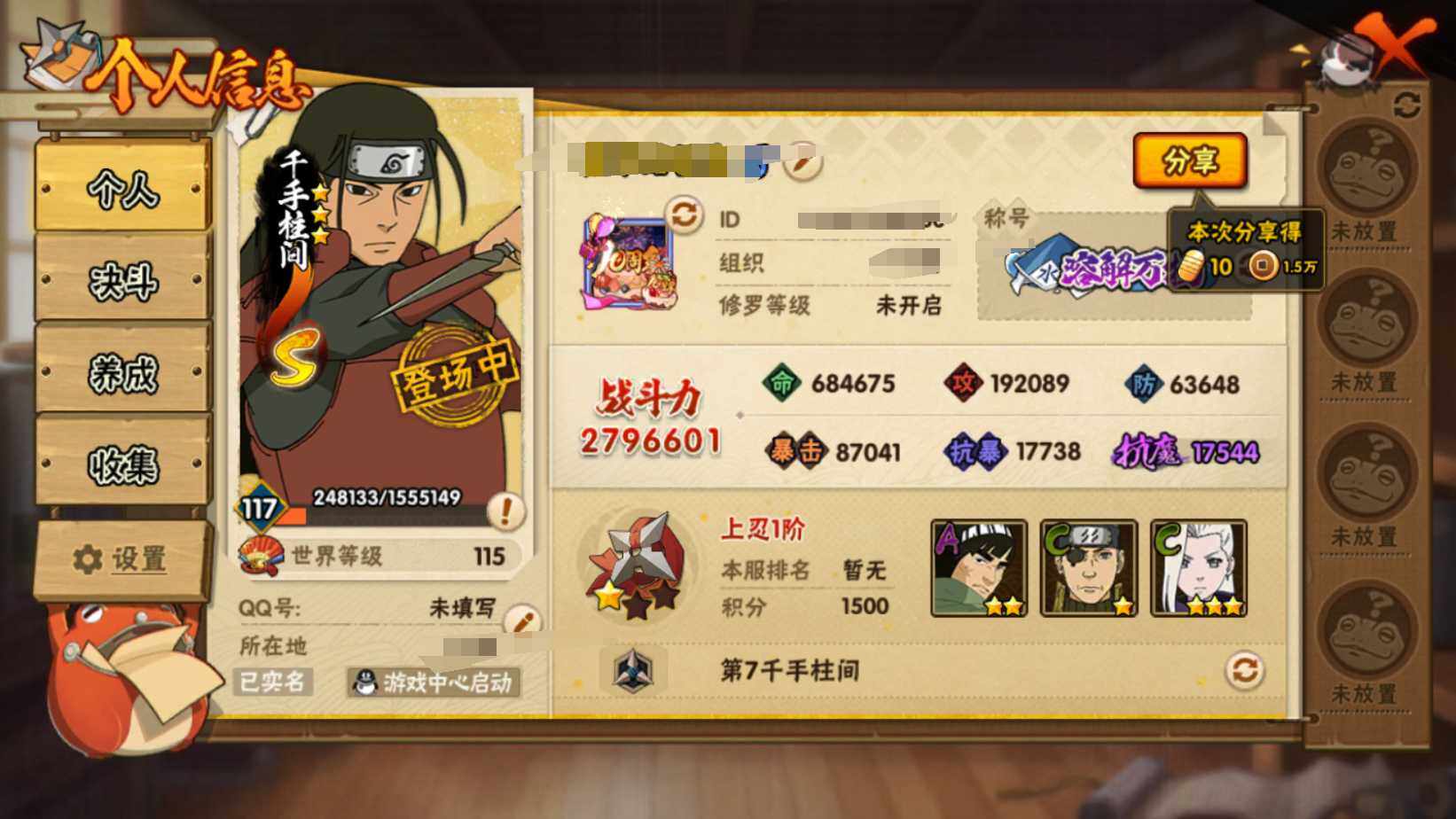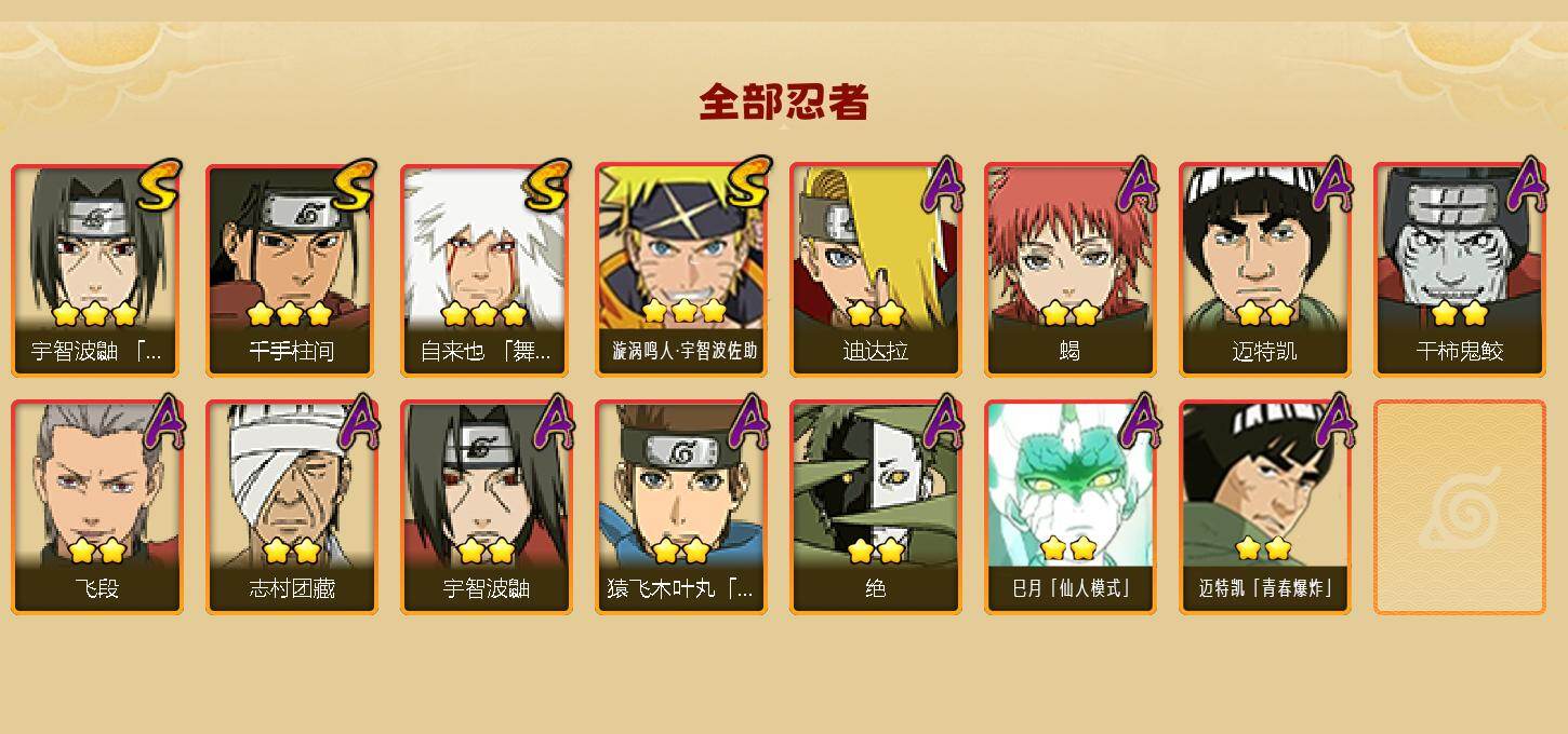 【HYF2579】V1/战力279W/S忍4/A忍11/舞之豪杰-自来也/宇智波鼬/千手柱间/迈特凯/蝎/飞段/3星漩涡鸣人·宇智波佐助/志村团藏/迪达拉/2星巳月「仙人模式」/干柿鬼鲛/2星迈特凯「青春爆炸」/猿飞木叶丸/绝/须佐能乎-宇智波鼬