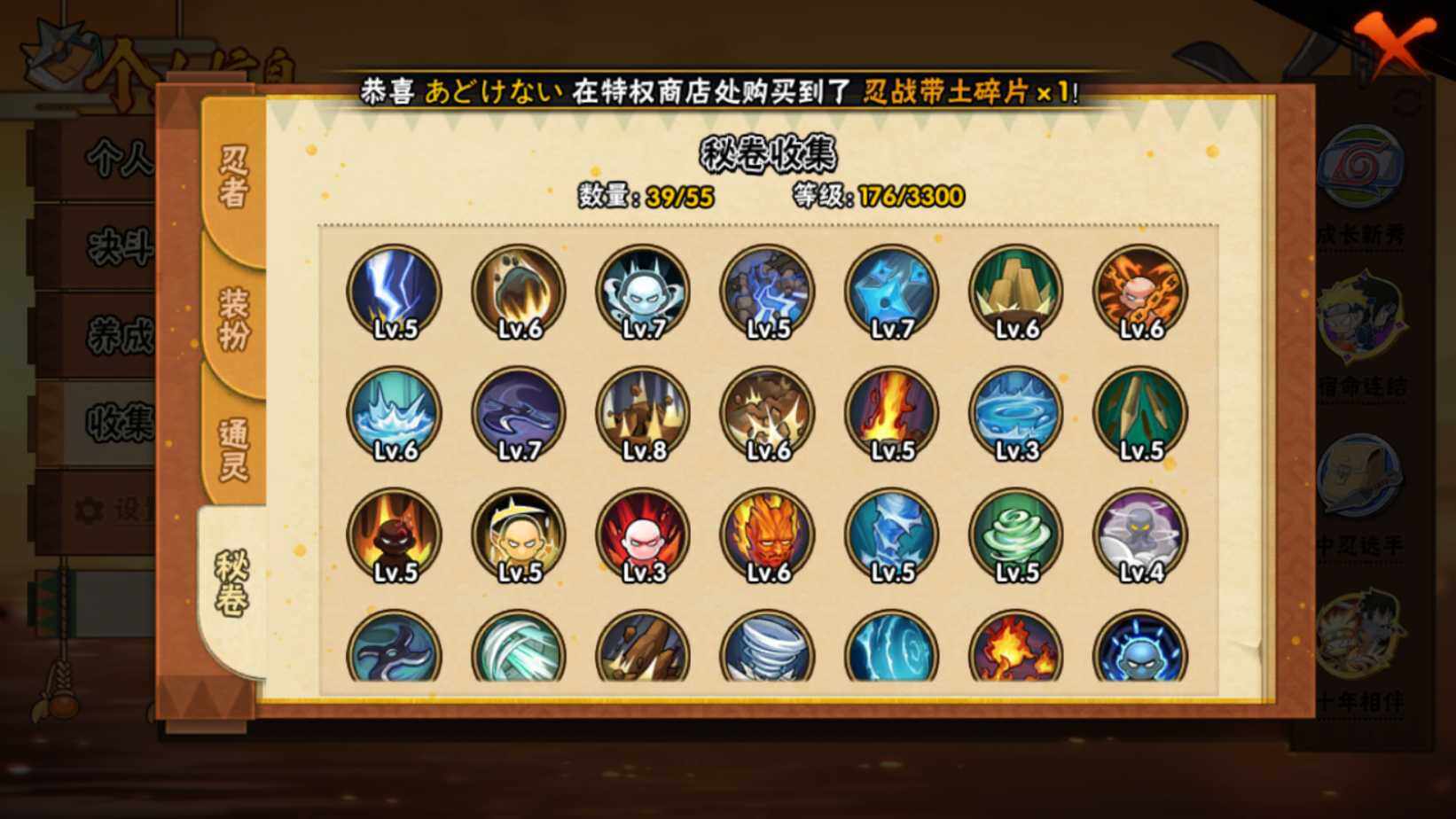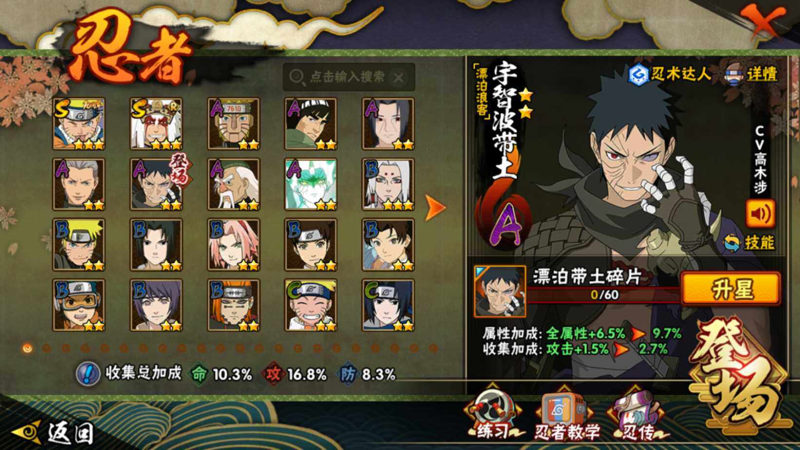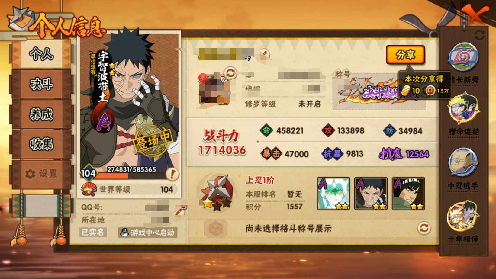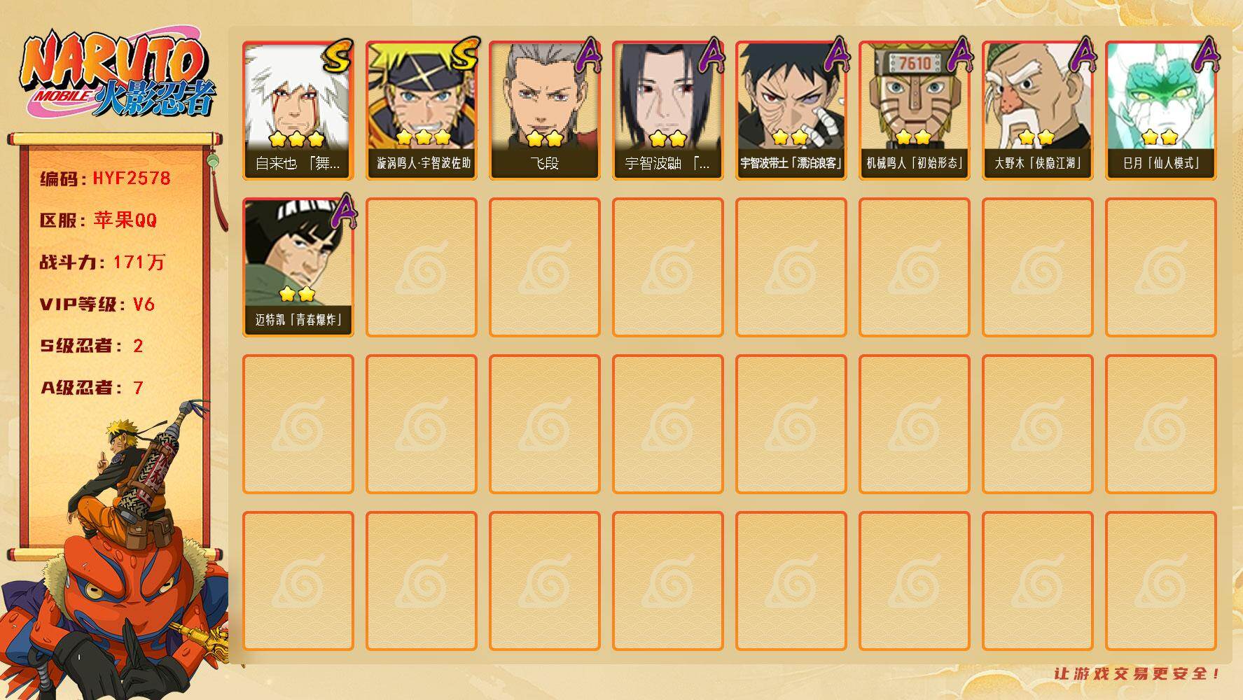 【HYF2578】V6/战力171W/S忍2/A忍7/舞之豪杰-自来也/2星宇智波带土「漂泊浪客」/2星大野木「侠隐江湖」/2星巳月「仙人模式」/2星迈特凯「青春爆炸」/飞段/2星机械鸣人「初始形态」/3星漩涡鸣人·宇智波佐助/夏日限定-宇智波鼬