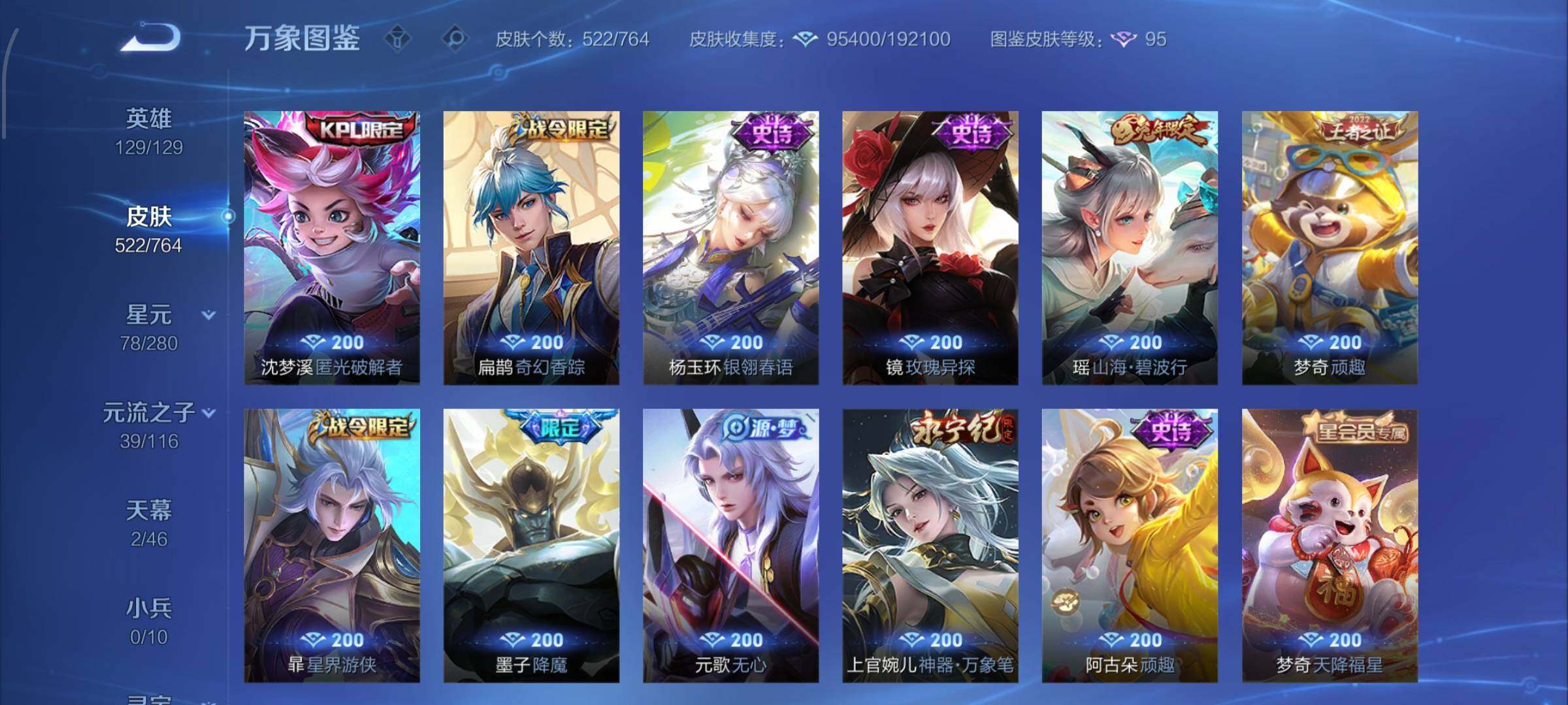 精品女号战力v10·背包一荣耀水晶·8典藏·2无双·4星传说·52传说·6小国15省标·1.5w小国蔡文姬·1.3w小国嫦娥·1.1w小国瑶·1.1w小国安琪拉·1.2w小国兰陵王·万战小国伽罗·金标1.1w孙膑· 金标万战海月·金标万战大乔·金标万战老虎·中路67段·游走62段·紫瑶·倪克斯神谕·天鹅之梦·幻阙歌·青丘九尾·真我赫兹·瑶时之祈愿·绯月行·星穹之声