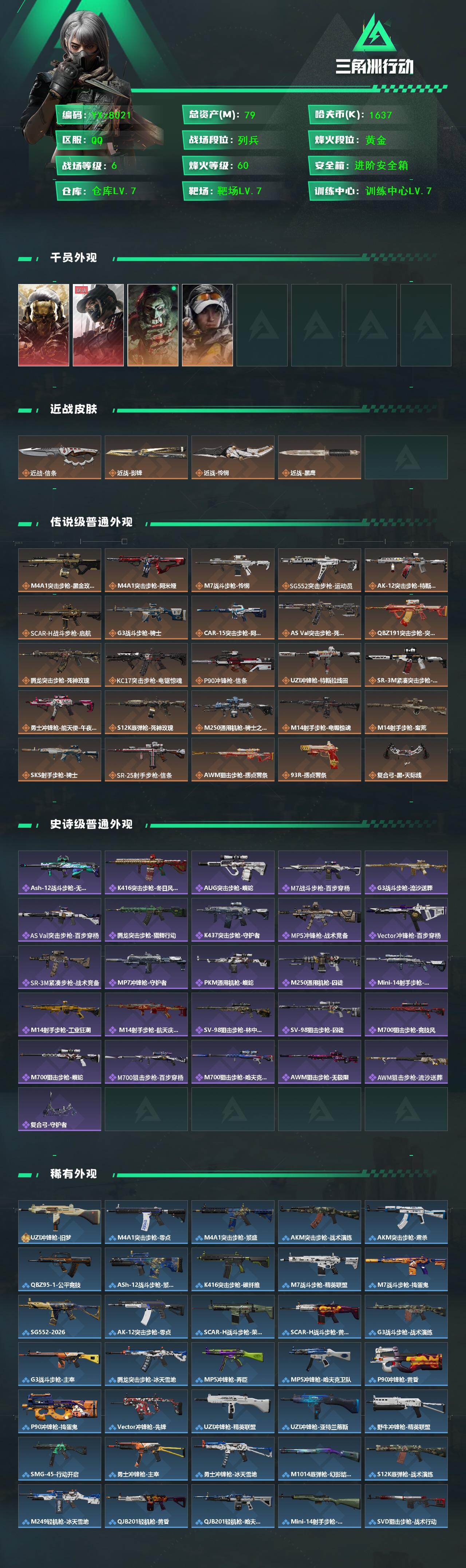 【热门皮肤号:双红+三刀-蚀金玫瑰+黑天际线+信条+影锋+怜悯】【Q区三端互通】【无二次】YXz8021-特勤处:仓库7级/靶场7级/训练中心7级-总资产79m-哈夫币163w-烽火等级:60级