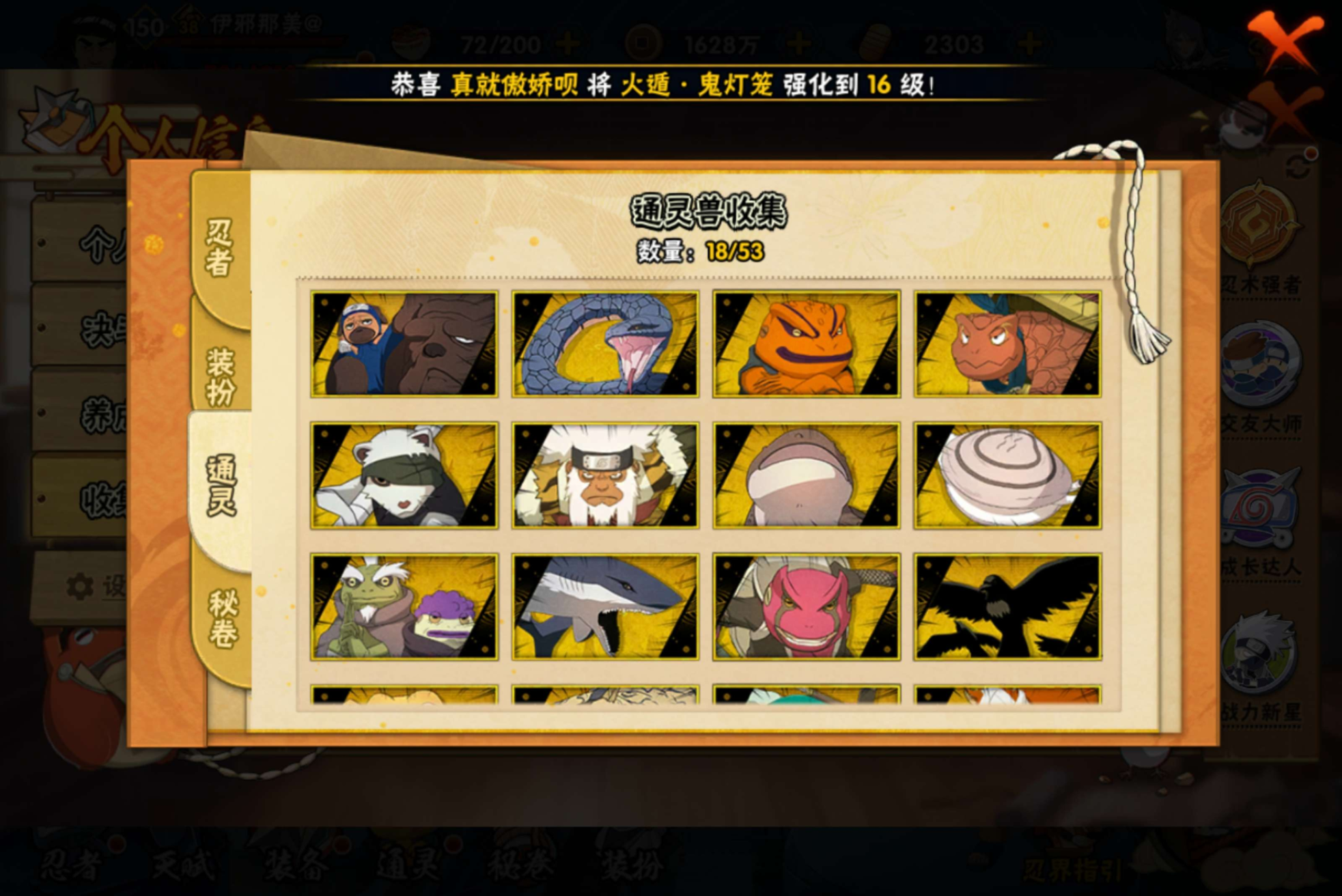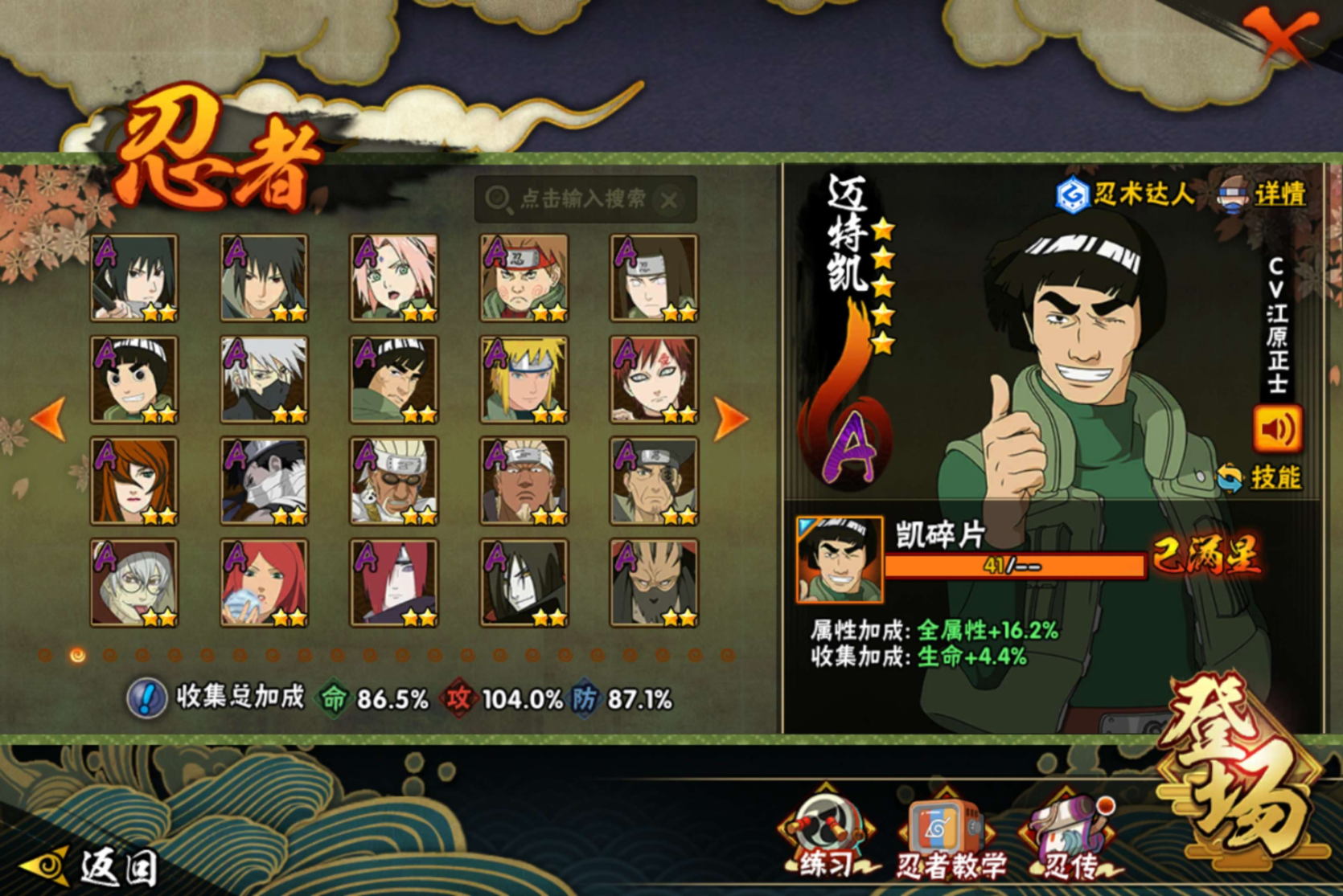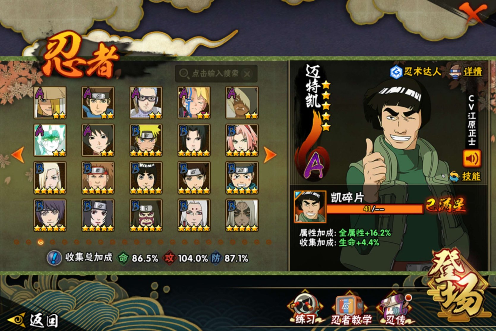 【S级忍者】旗木卡卡西「须佐能乎」(3星),自来也「传说中的三忍」(3星),长门「秽土转生」(3星),自来也「舞之豪杰」(3星),宇智波鼬「秽土转生」(3星),宇智波鼬「须佐能乎」(3星),漩涡鸣人·宇