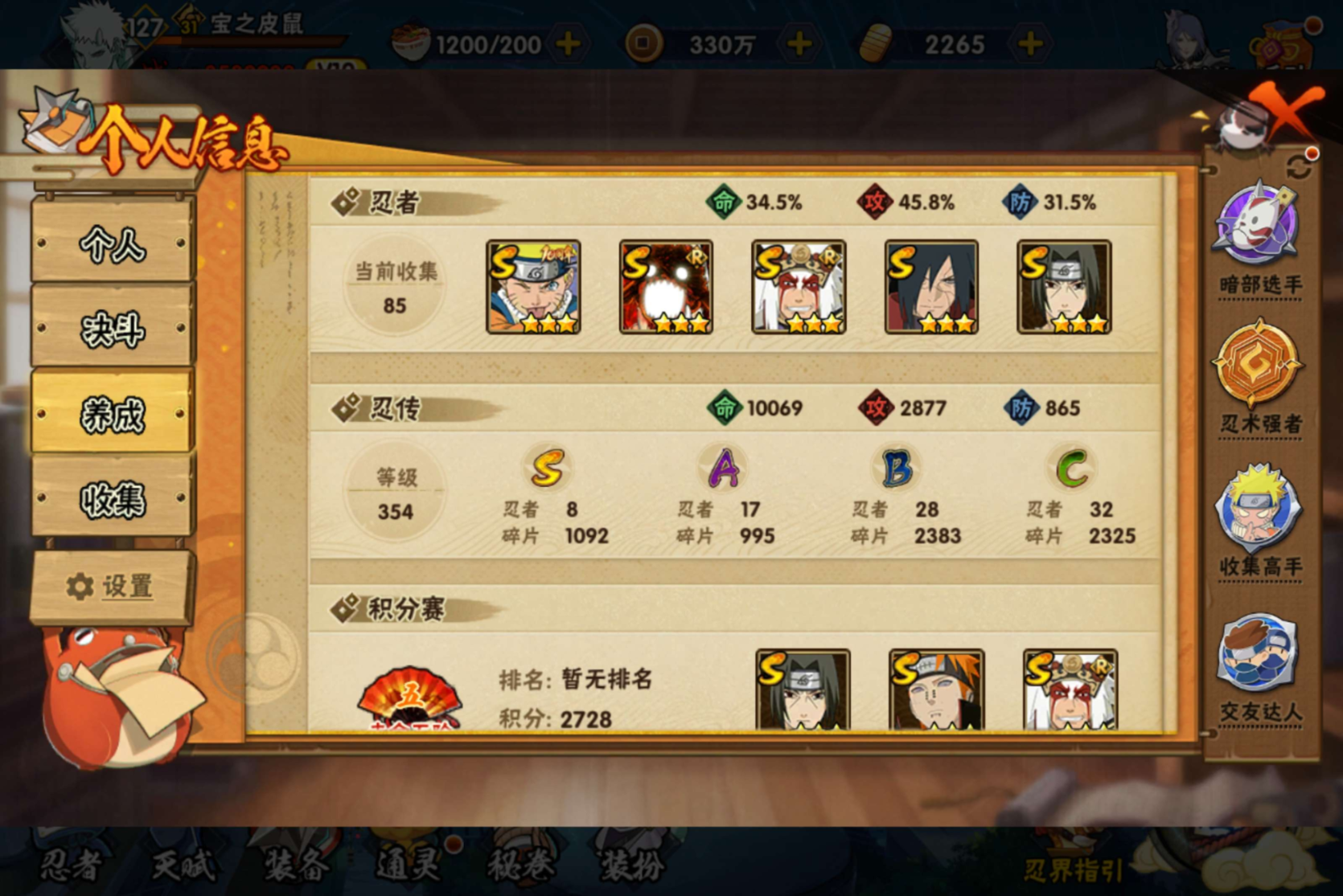 安卓QQ-可以二次-v10-暗部-25忍法帖-号上还有700多点卷-精品小号买到就是赚到-漩涡鸣人「暴怒·第六尾」-宇智波带土「十尾人柱力」-宇智波鼬「须佐能乎」-宇智波斑「五影会谈」-黑绝-宇智波鼬「夏日限定」-S忍者数:8- A忍者数:17