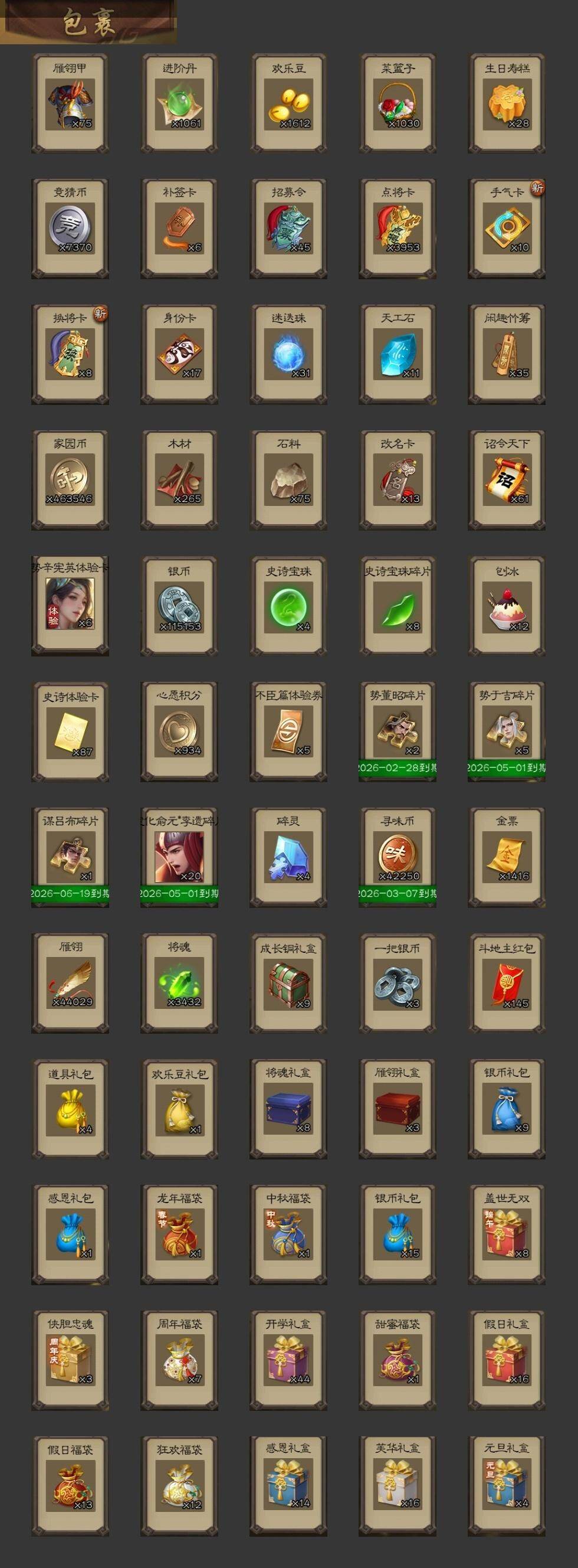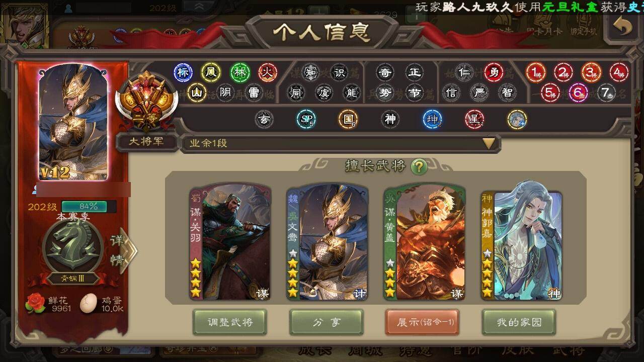 【1384】官阶:大将军;VIP等级:VIP12;史诗武将数量:58;动态皮肤数量:54;武将总数:411;史诗宝珠数量:4;将魂数量:3432;神将:4;魏国史诗武将:40;蜀国史诗武将:13;吴国史诗武将:11;群史诗武将:15
