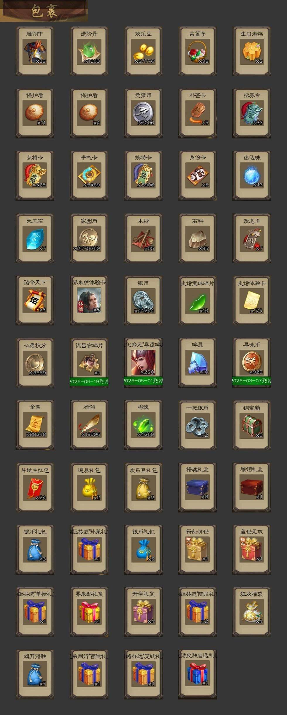 【1394】官阶:大将军;VIP等级:VIP12;史诗武将数量:55;动态皮肤数量:37;武将总数:401;史诗宝珠数量:0;将魂数量:4260;神将:10;魏国史诗武将:18;蜀国史诗武将:11;吴国史诗武将:11;群史诗武将:16