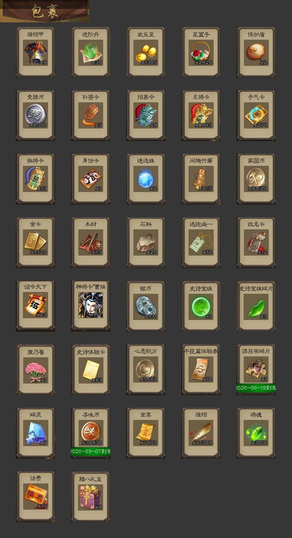 【1404】官阶:大将军;VIP等级:VIP11;史诗武将数量:52;动态皮肤数量:52;武将总数:396;史诗宝珠数量:1;将魂数量:3014;神将:5;魏国史诗武将:31;蜀国史诗武将:12;吴国史诗武将:6;群史诗武将:14