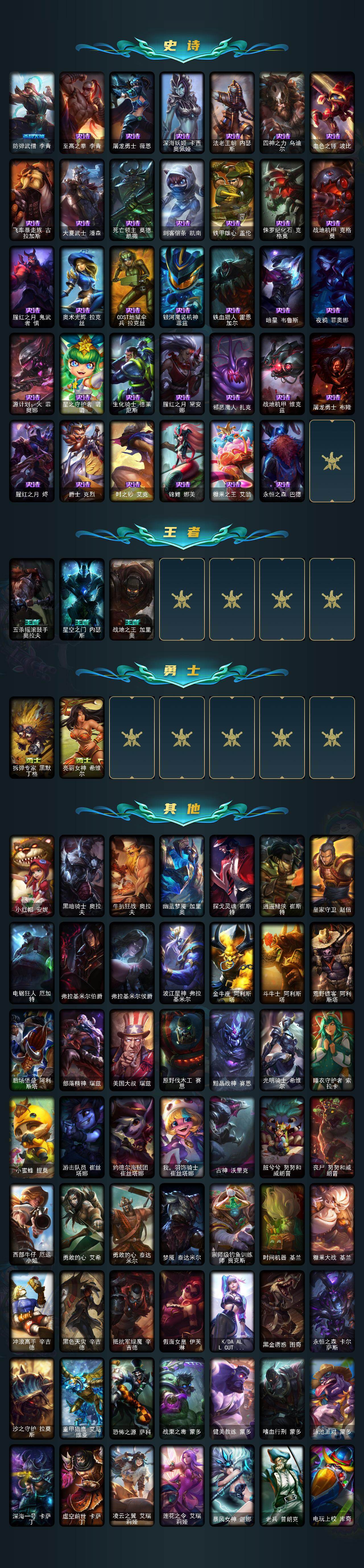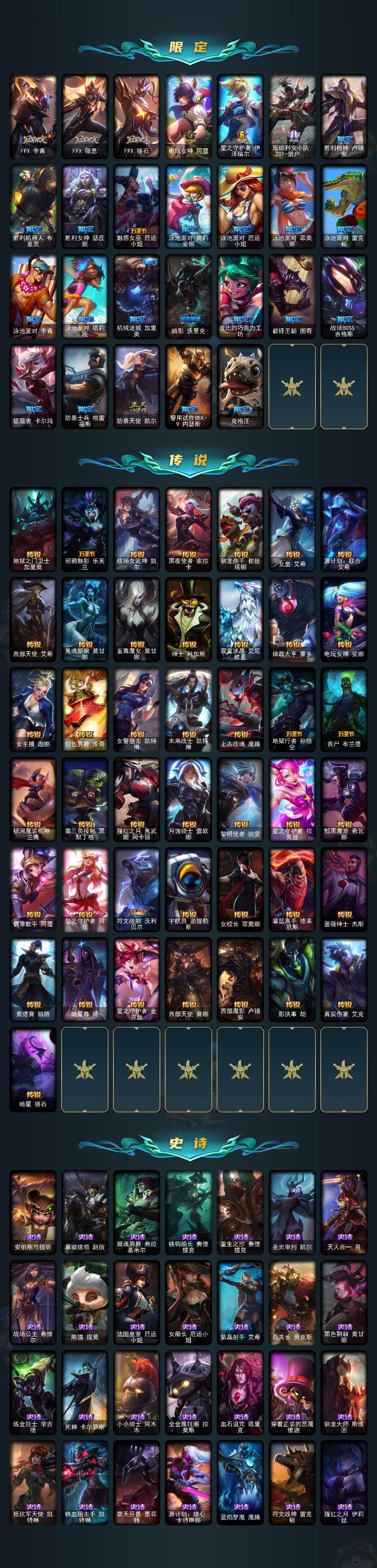 172英雄/356皮肤/1终极/11神话/71限定/6臻彩/103炫彩/43传说/62史诗/未定级/