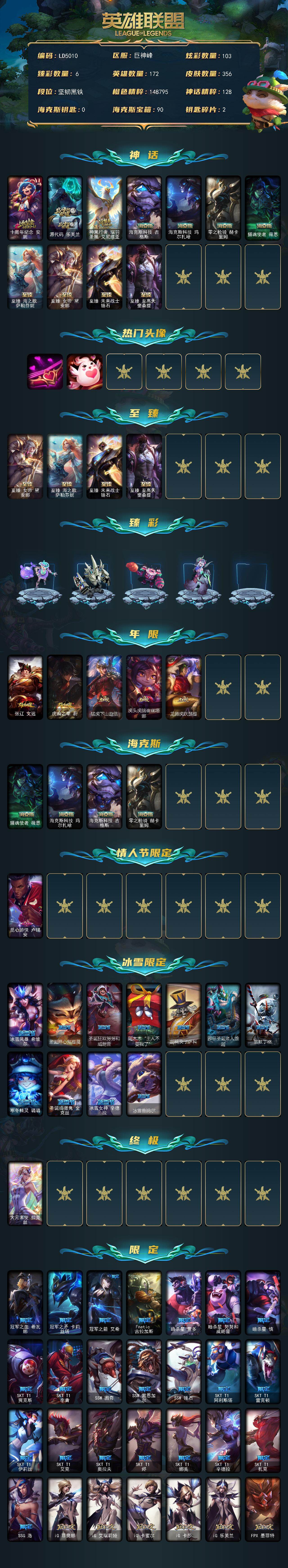 【LD5010】172英雄/356皮肤/1终极/11神话/71限定/6臻彩/103炫彩/43传说/62史诗/未定级/十周年纪念安妮/源代码乐芙兰/神凰行者瑞羽圣凰艾尼维亚/海克斯科技吉格斯/海克斯科技玛尔扎哈/零之枪骑赫卡里姆/摄魂使者薇恩/至臻至高天奎桑提/至臻海之歌萨勒芬妮/至臻女帝黛安娜/至臻未来战士锤石/爱情之歌头像/爱情鸽头像/天龙之子卡莎飞龙乘云/泳池派对奥莉安娜优雅珠光鲸/霸天巨兽雪崩墨菲特/可爱可爱粉红红布里茨/魔女阿卡丽虚荣/净雪之月莫甘娜冬虹/张辽文远/虎痴之拳蔚/猛虎下山赵