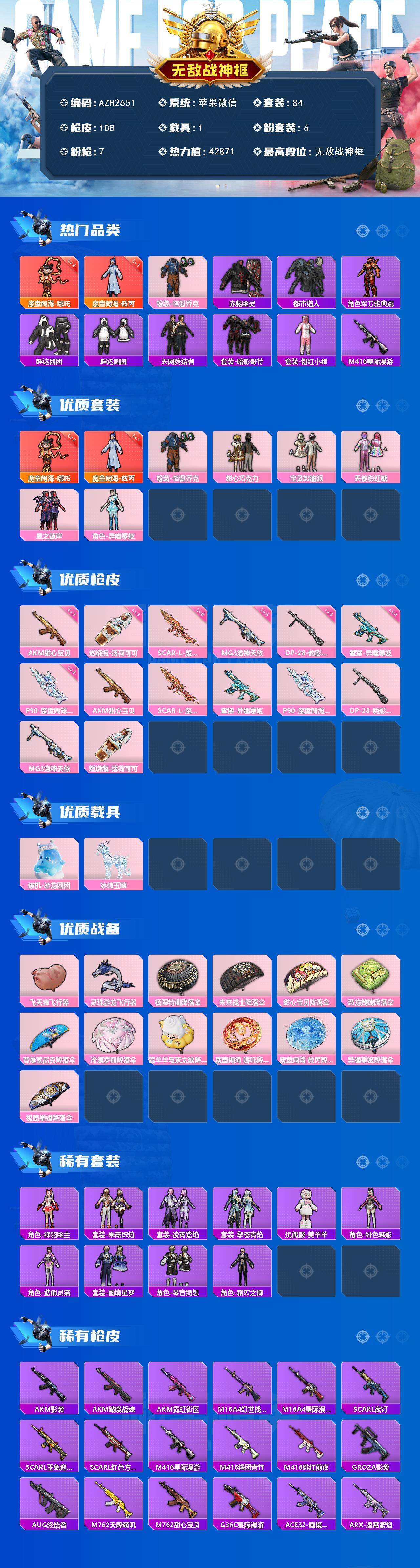 【AZH2651】苹果 微信【无敌战神框 二级哪吒 一级敖丙 小丑都市赤蝎天网终结者 巧克力三姐妹胖达团团圆圆 星际漫游M416 满级甜心宝贝AKM 胖达头盔粉熊背包 1载具1僚机】无敌战神框-2神装-6粉装-7特效枪-1载具-3粉色飞行器-42871热力值-6王牌印记-84套装-108枪皮