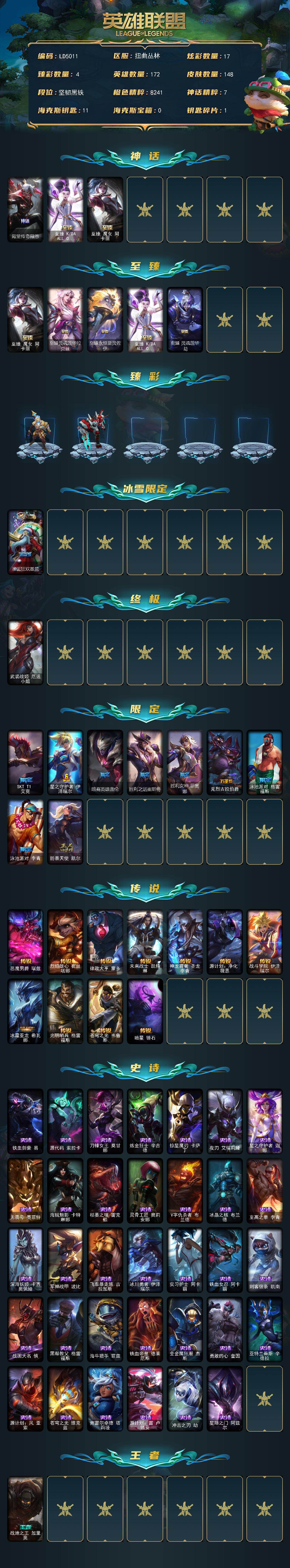 【LD5011】172英雄/148皮肤/1终极/6神话/12限定/4臻彩/17炫彩/11传说/34史诗/未定级/殿堂传奇薇恩/至臻KDAALLOUT卡莎/至臻魔女阿卡丽/至臻灵魂莲华拉克丝/至臻永恒星灵佐伊/至臻灵魂莲华劫/冠军之志瑞兹凯旋圣装/霸天战士雷恩加尔星啸天火/魔女阿卡丽虚荣/圣诞狂欢基兰/武装战姬厄运小姐/SKTT1艾克/星之守护者伊泽瑞尔/暗裔英雄盖伦/胜利之运崔斯特/胜利女神菲奥娜/克烈古拉伯爵/泳池派对格雷福斯/泳池派对李青/防暴天使凯尔/双城之战2孤勇者艾克/恶魔男爵瑞兹/烈