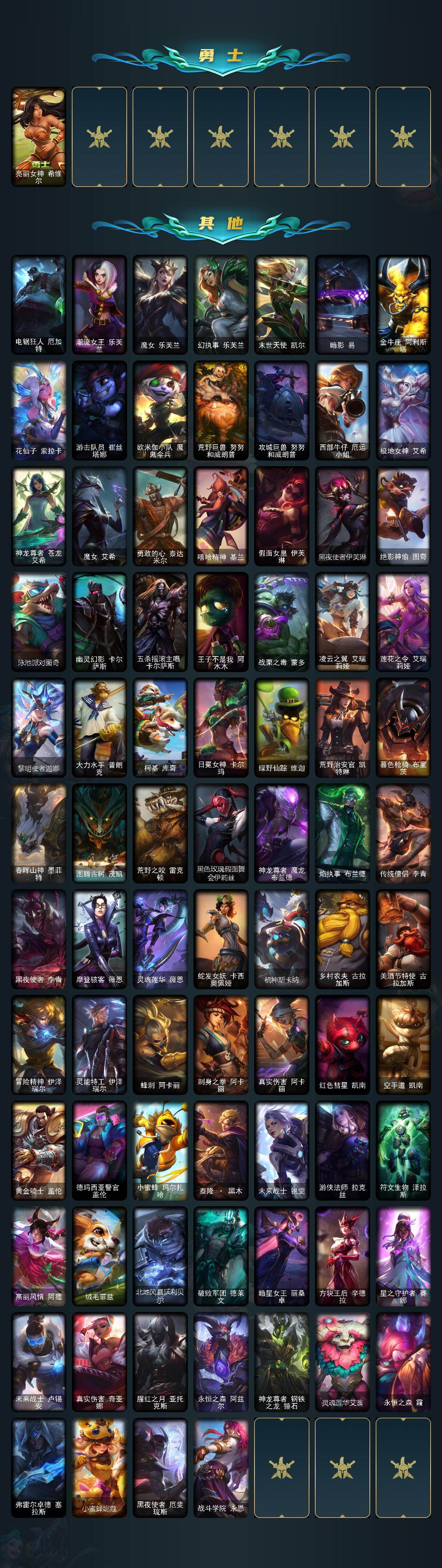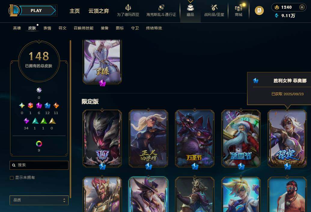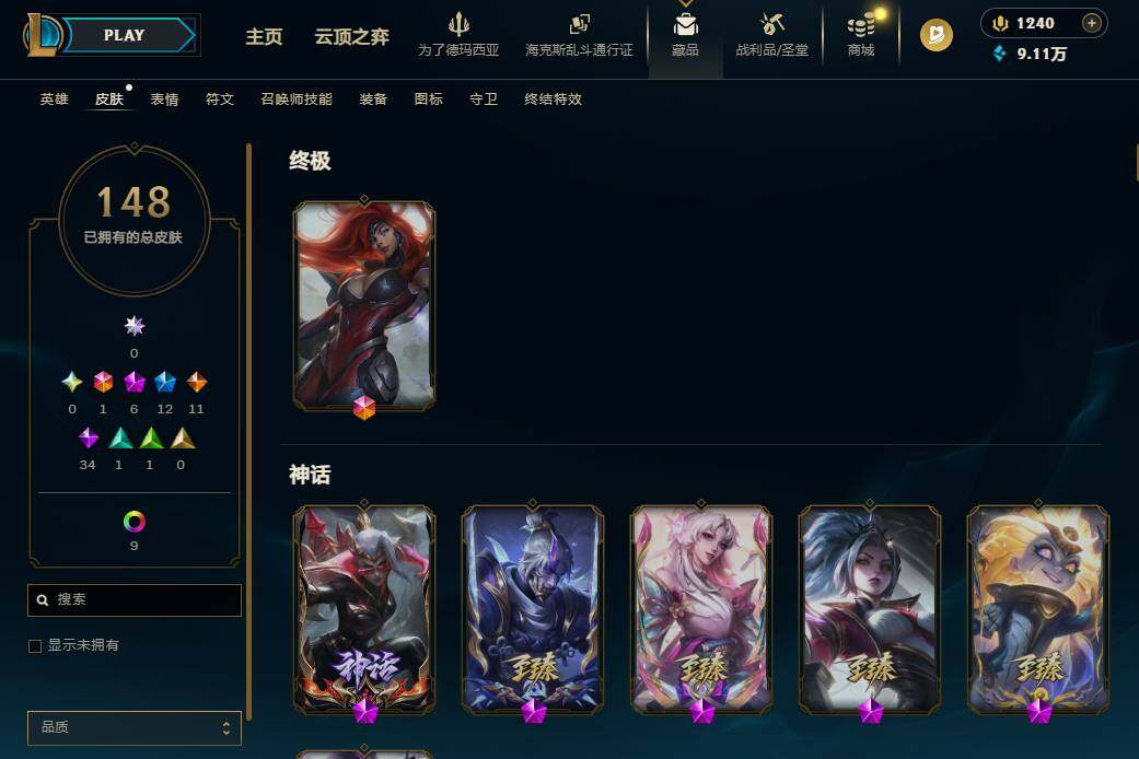 172英雄/148皮肤/1终极/6神话/12限定/4臻彩/17炫彩/11传说/34史诗/未定级/殿堂传奇薇恩/