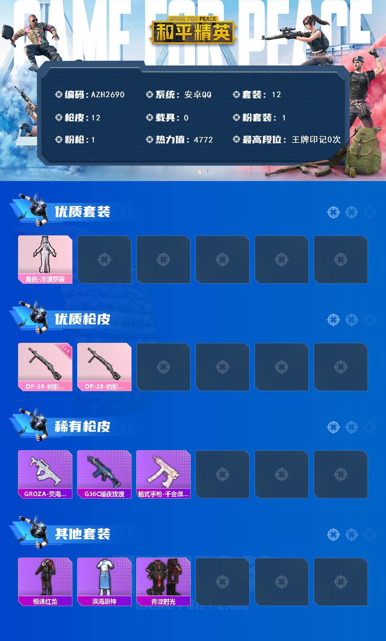 【AZH2690】安卓 手Q【冷漠罗丽】1粉装-1特效枪-0载具-0粉色飞行器-4772热力值-2王牌印记-12套装-12枪皮